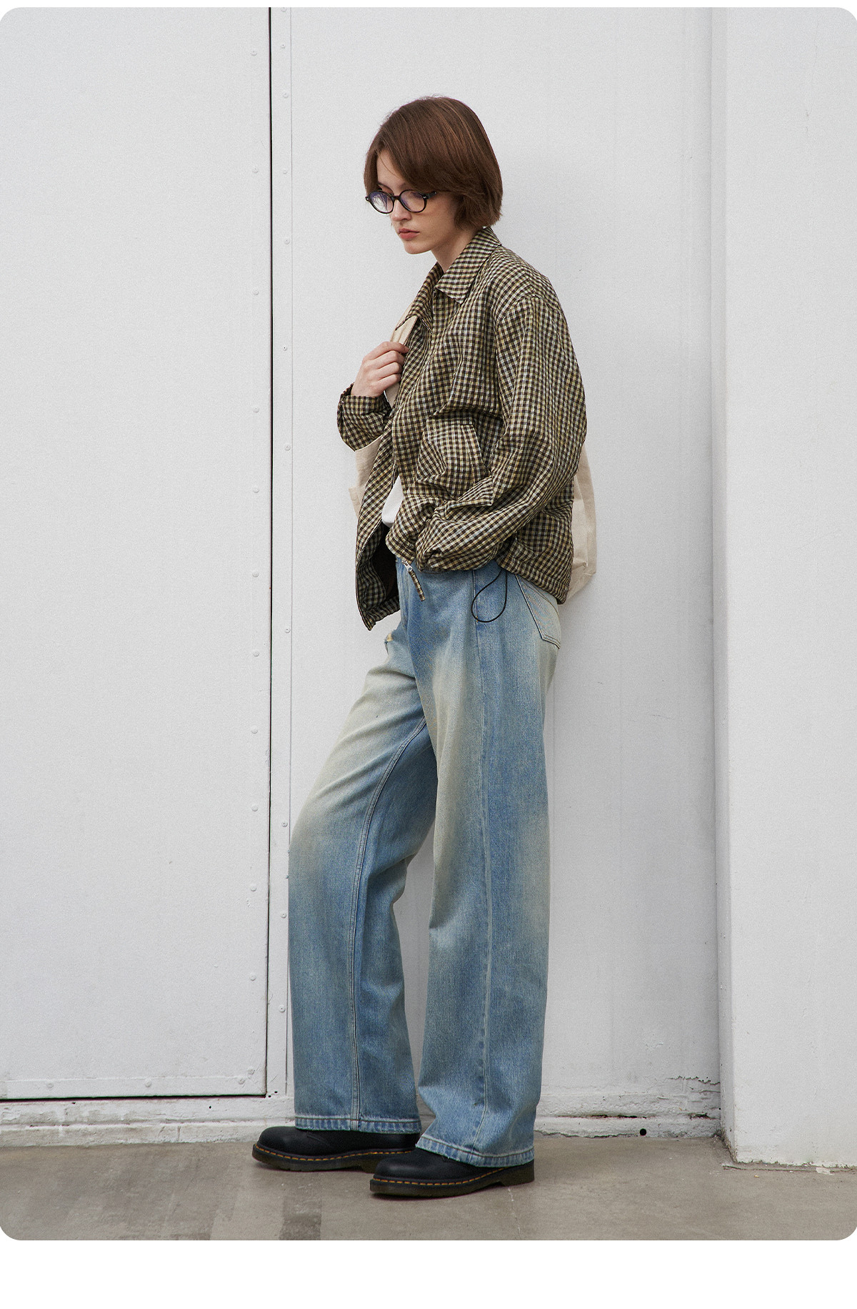 714street美式复古纯棉情侣长袖2025秋季新款miu系蓝色格子衬衫男