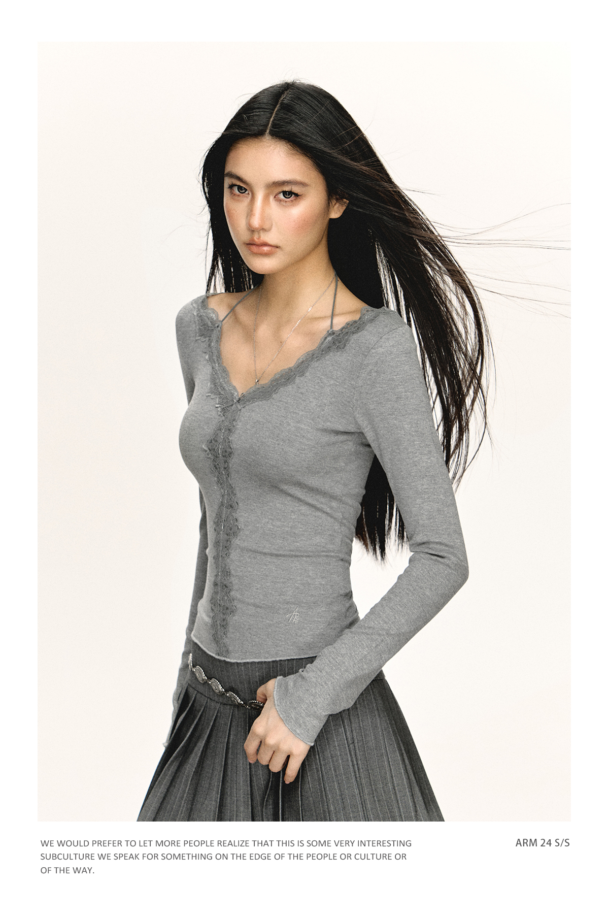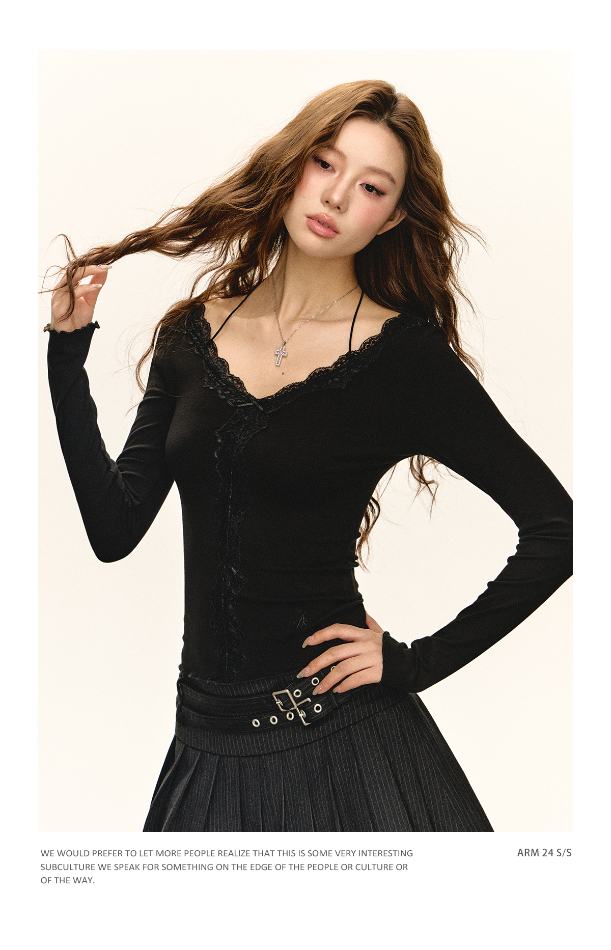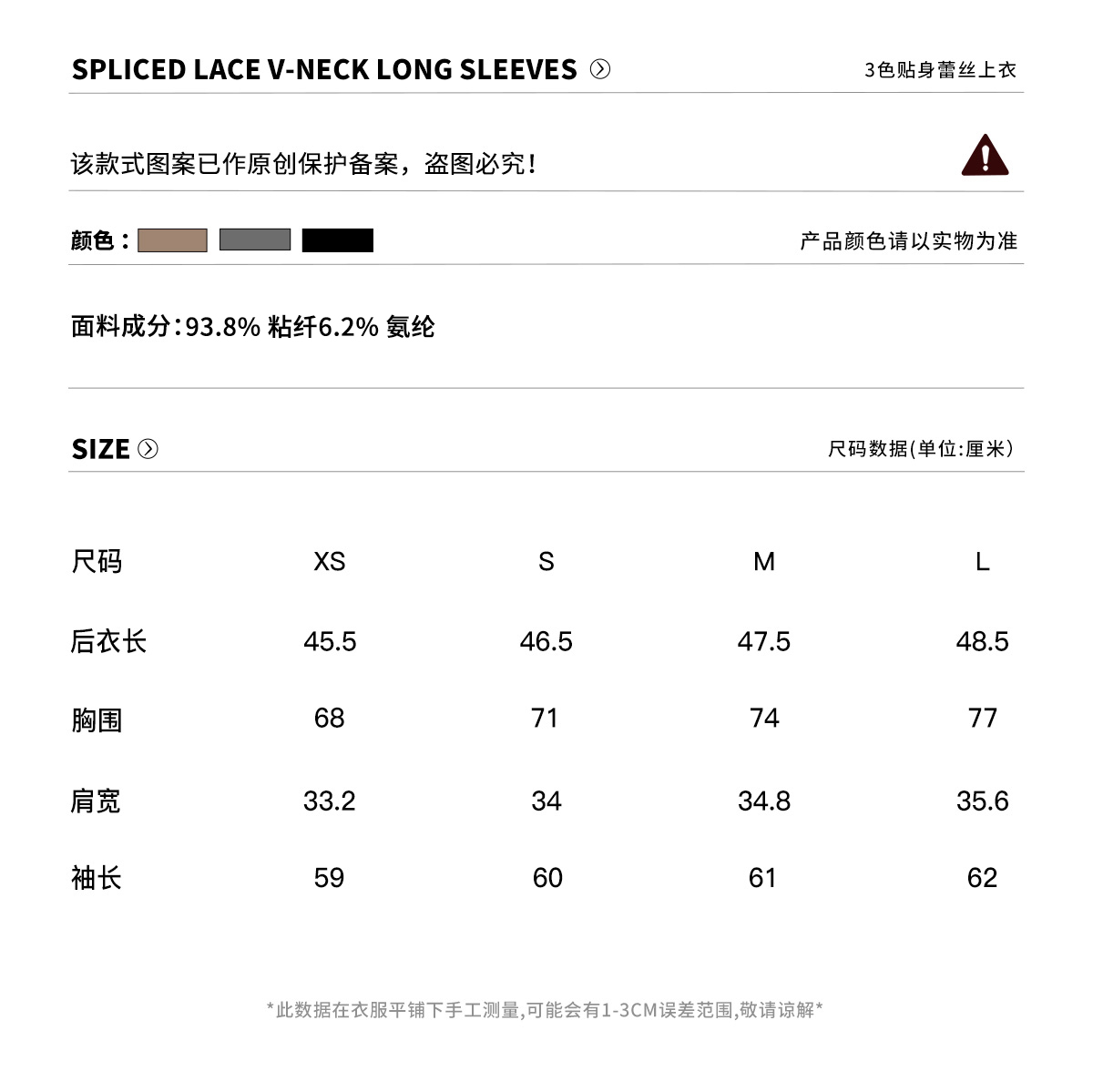 Ariseism 美式复古3色拼接蕾丝v领长袖T恤女春季新款内搭打底上衣