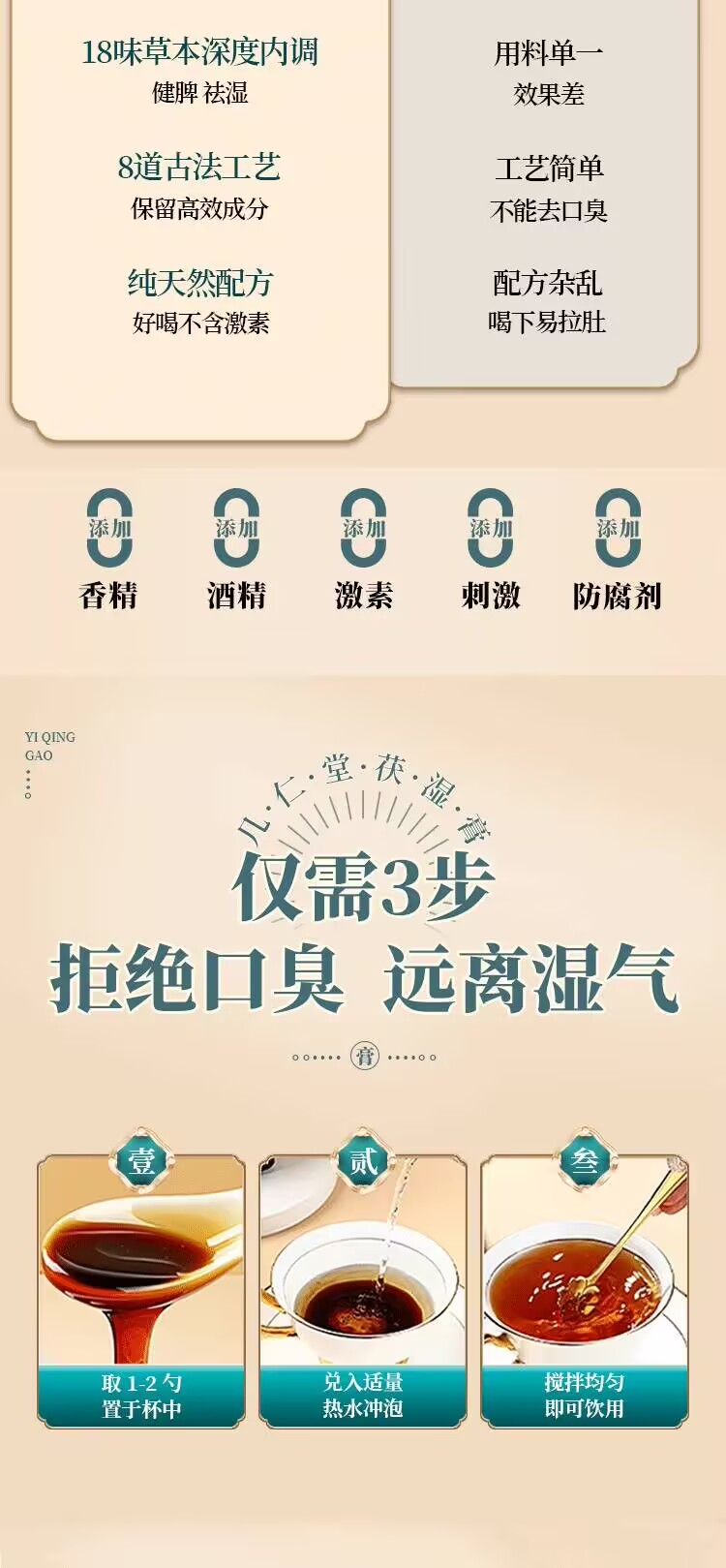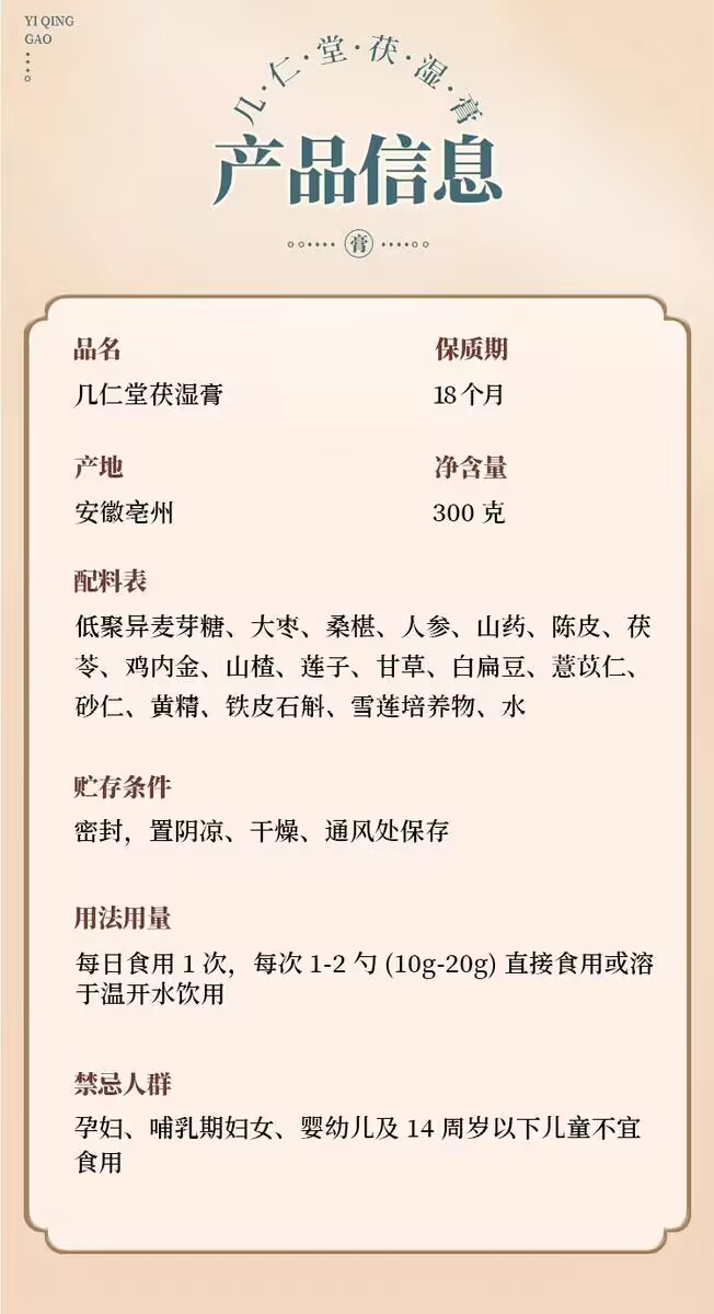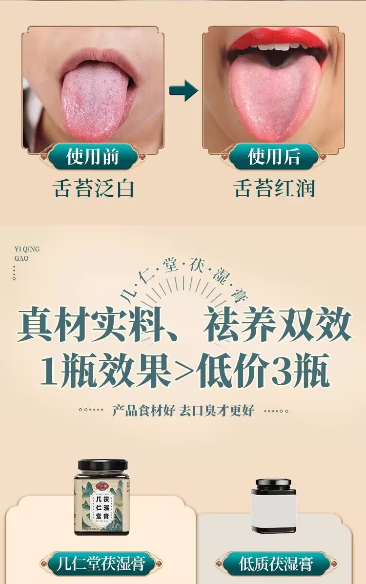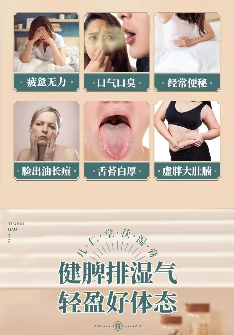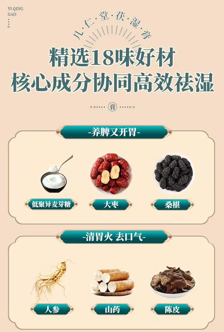 几仁堂茯湿膏可以起到祛湿排湿的作用。赤康茯湿膏中含有丰富的茯苓、薏苡仁两大滋补成分,这两种成分可以起到利水渗湿的作用,有助于改善体内湿气重所引起的多种不适。坚持服用通过内服调理可以起到加速体内湿气排出的效果,几仁堂茯湿膏可以有效改善湿气重所导致的口苦口臭、失眠多梦、经期不适等多种问题。