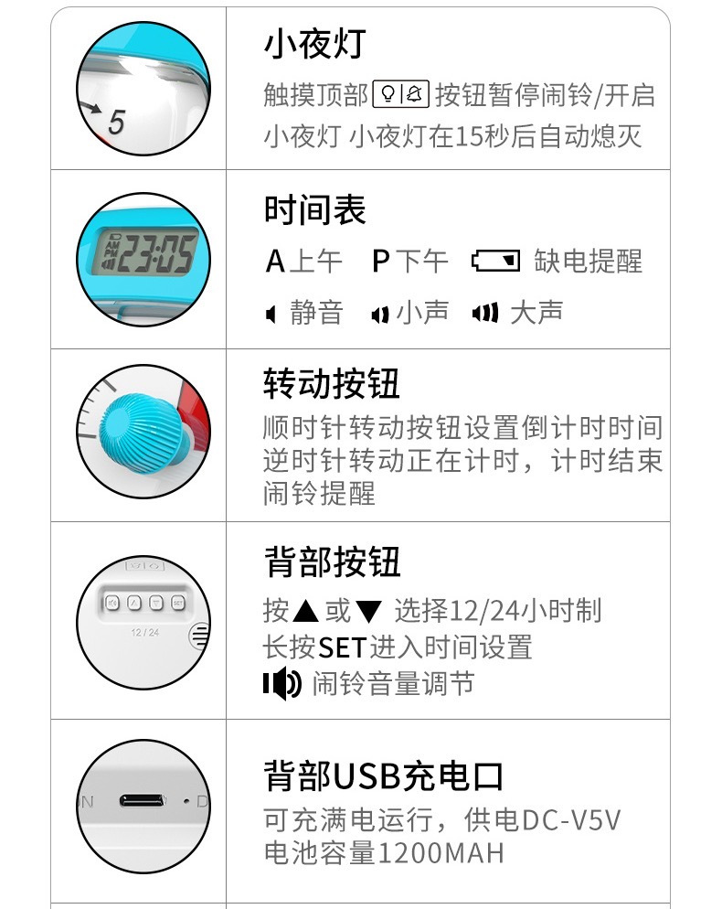 ▪️顶部触摸键开启小夜灯,暂停响铃。时间表上下午区分,缺电提醒,声音有3种模式可选!
