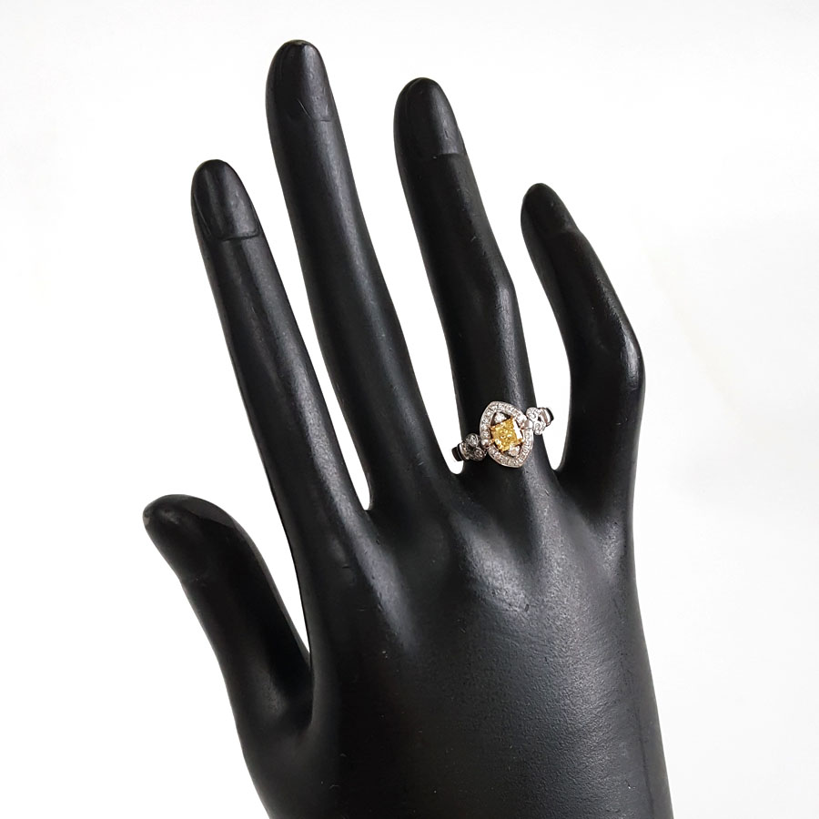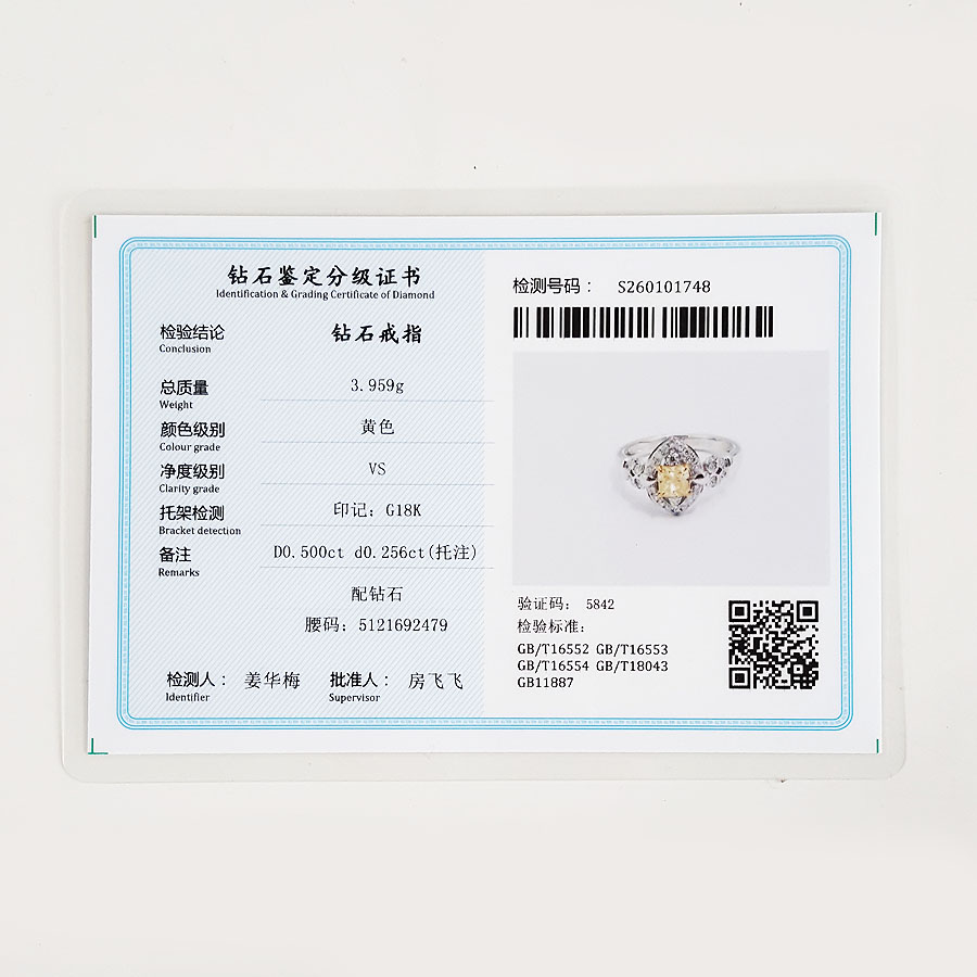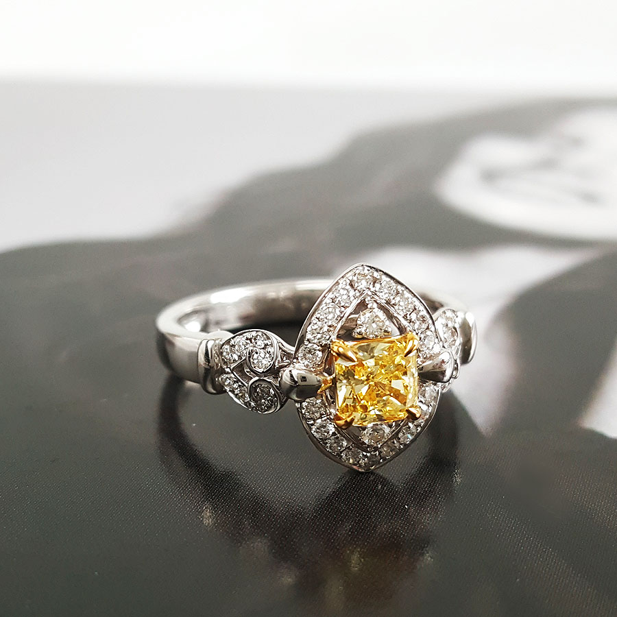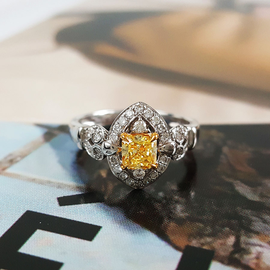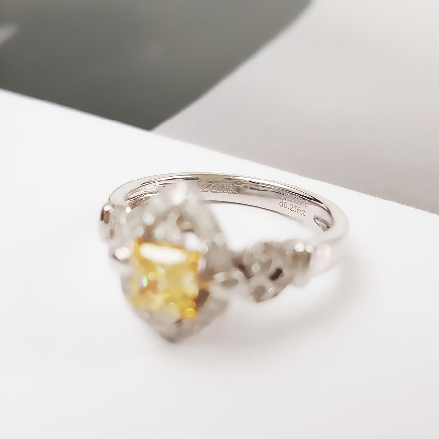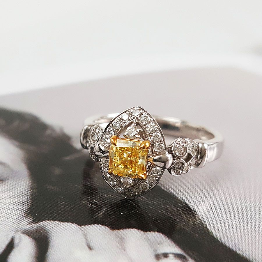 AU750白金方形设计师四爪款0.50克拉艳彩黄色钻石戒指12号(戒圈可改)290126NJS43