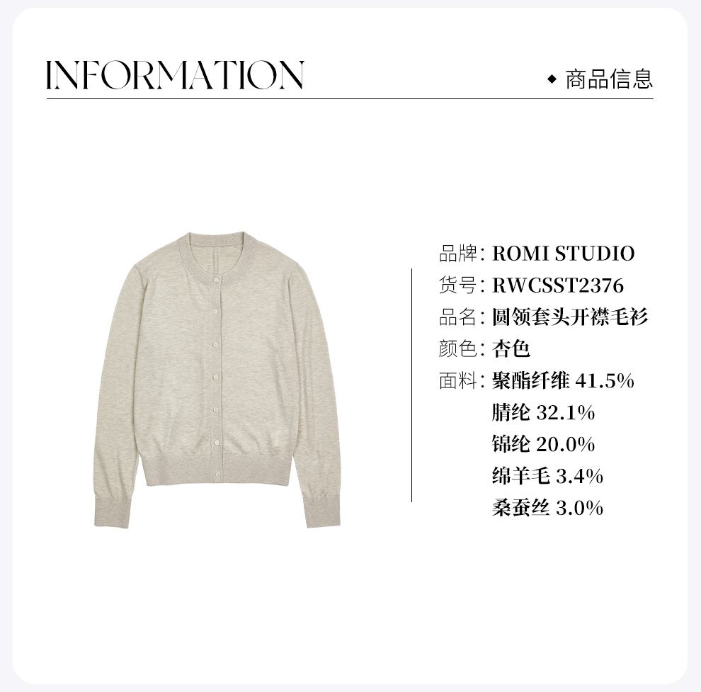 ROMI STUDIO“松弛慵懒”桑蚕丝绵羊毛混纺圆领套头开衫 RWCSST2376