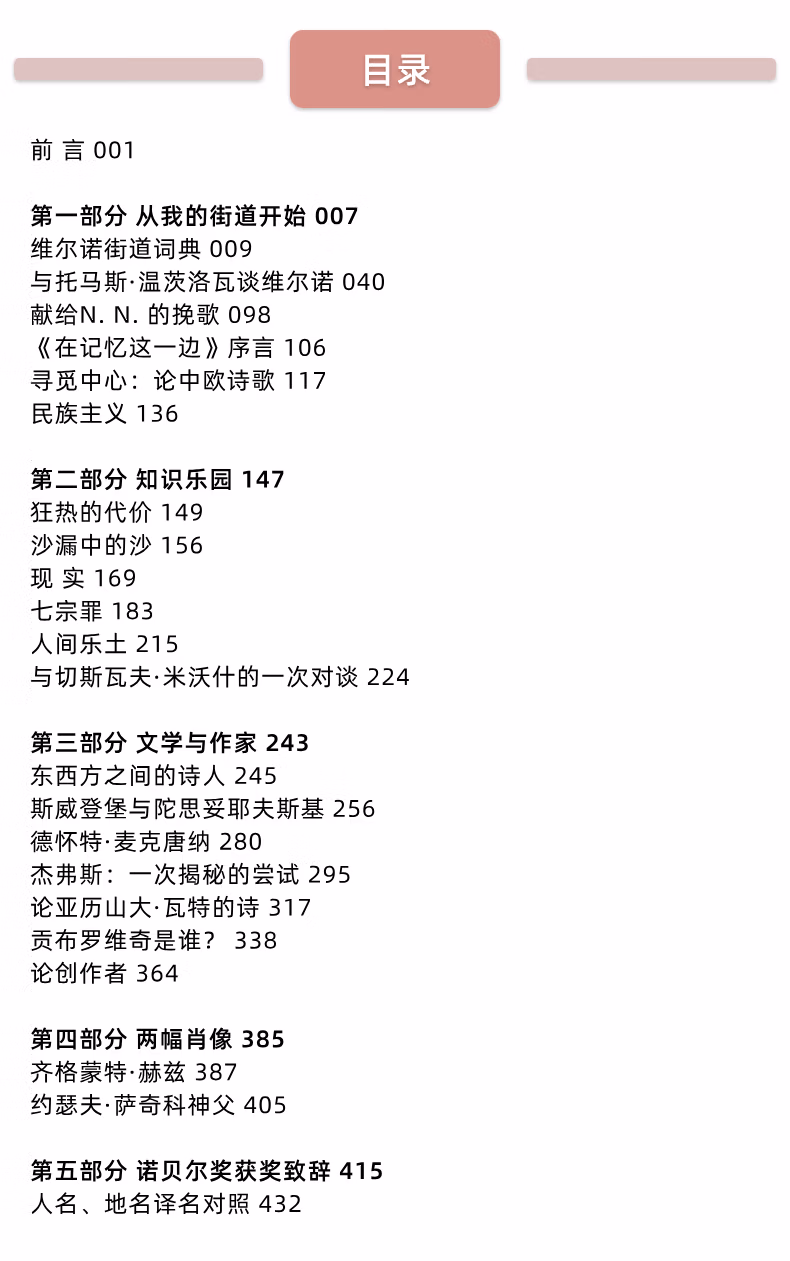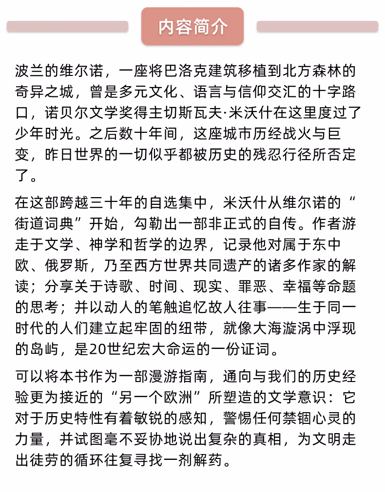 【内容简介】波兰的维尔诺,一座将巴洛克建筑移植到北方森林的奇异之城,曾是多元文化、语言与信仰交汇的十字路口,诺贝尔文学奖得主切斯瓦夫·米沃什在这里度过了少年时光。之后数十年间,这座城市历经战火与巨变,昨日世界的一切似乎都被历史的残忍行径所否定了。在这部跨越三十年的自选集中,米沃什从维尔诺的“街道词典”开始,勾勒出一部非正式的自传。作者游走于文学、神学和哲学的边界,记录他对属于东中欧、俄罗斯,乃至西方世界共同遗产的诸多作家的解读;分享关于诗歌、时间、现实、罪恶、幸福等命题的思考;并以动人的笔触追忆故人往事——生于同一时代的人们建立起牢固的纽带,就像大海漩涡中浮现的岛屿,是20世纪宏大命运的一份证词。可以将本书作为一部漫游指南,通向与我们的历史经验更为接近的“另一个欧洲”所塑造的文学意识:它对于历史特性有着敏锐的感知,警惕任何禁锢心灵的力量,并试图毫不妥协地说出复杂的真相,为文明走出徒劳的循环往复寻找一剂解药。
