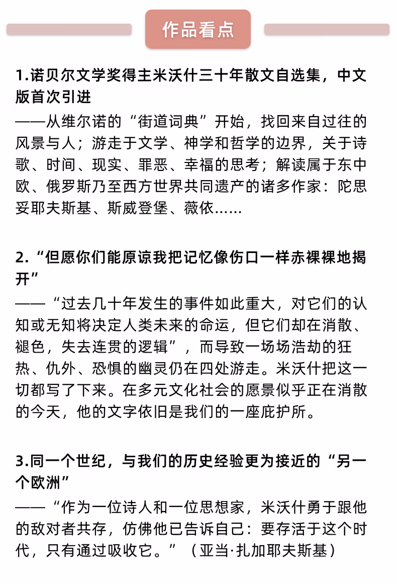 1. 诺贝尔文学奖得主米沃什三十年散文自选集,中文版首次引进——从维尔诺的“街道词典”开始,找回来自过往的风景与人;游走于文学、神学和哲学的边界,关于诗歌、时间、现实、罪恶、幸福的思考;解读属于东中欧、俄罗斯乃至西方世界共同遗产的诸多作家:陀思妥耶夫斯基、斯威登堡、薇依……2. “但愿你们能原谅我把记忆像伤口一样赤裸裸地揭开”——“过去几十年发生的事件如此重大,对它们的认知或无知将决定人类未来的命运,但它们却在消散、褪色,失去连贯的逻辑”,而导致一场场浩劫的狂热、仇外、恐惧的幽灵仍在四处游走。米沃什把这一切都写了下来。在多元文化社会的愿景似乎正在消散的今天,他的文字依旧是我们的一座庇护所。3. 同一个世纪,与我们的历史经验更为接近的“另一个欧洲”——“作为一位诗人和一位思想家,米沃什勇于跟他的敌对者共存,仿佛他已告诉自己:要存活于这个时代,只有通过吸收它。”(亚当·扎加耶夫斯基)