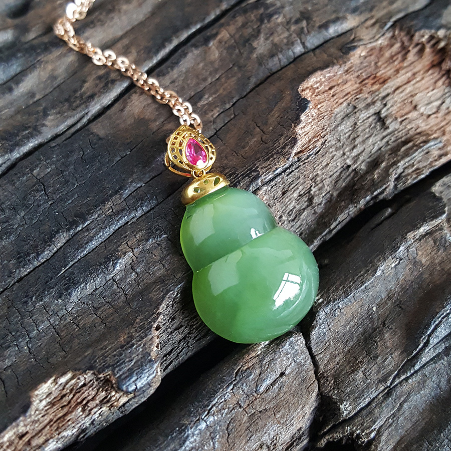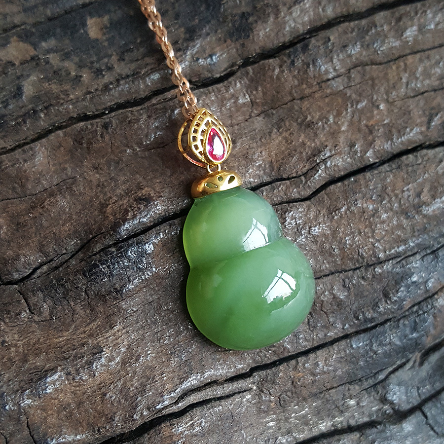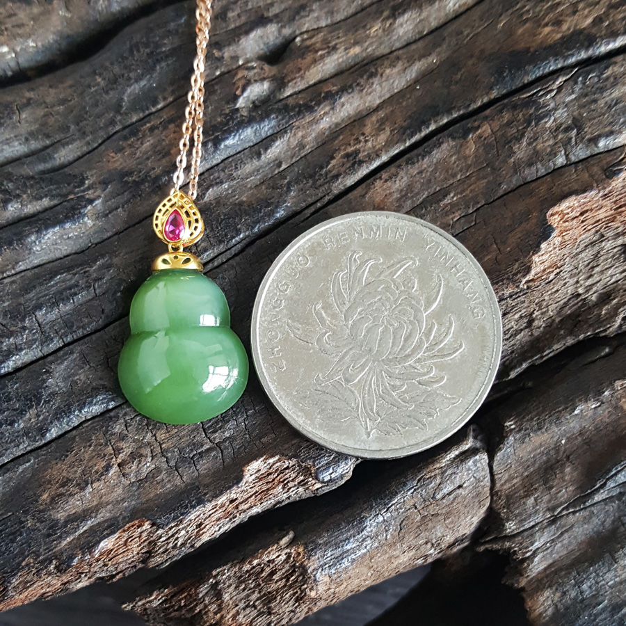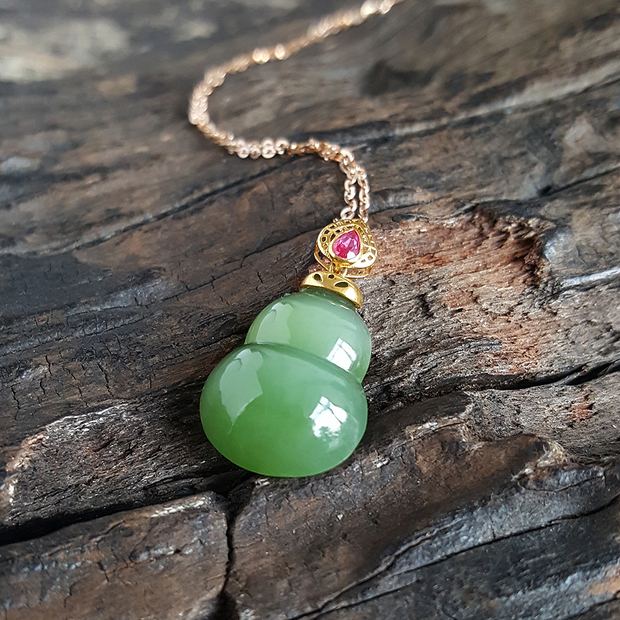 【天然正品】天然葫芦造型和田玉碧玉AU750黄金吊坠项链22.5*12.4*5.0MM(皆取最大值) 040124XY03特价