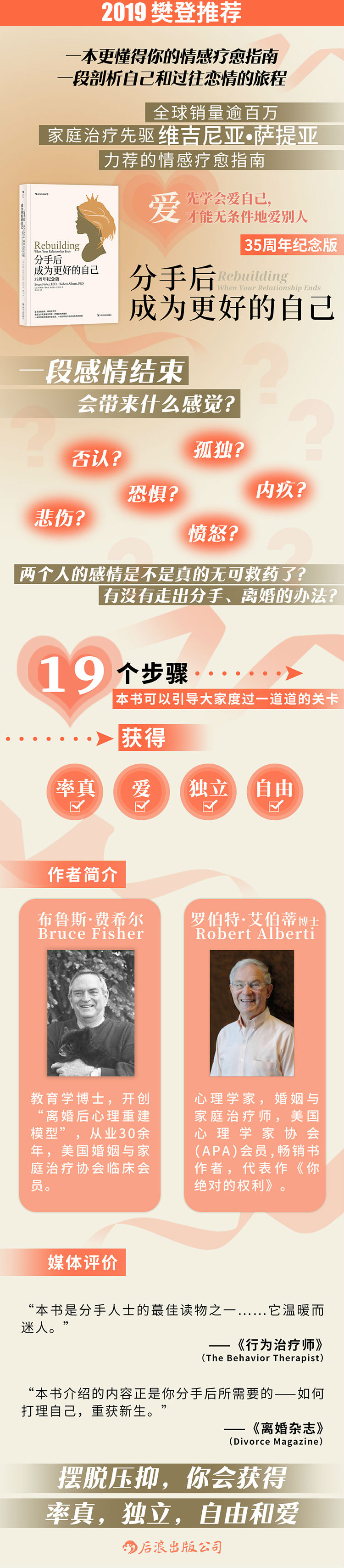 这本书详细讲解了走出过往恋情,直至获得新生的19个步骤,不仅剖析了每个步骤出现的原因和意义,而且提供了切实可行的方法。在本书中,作者详细分析了有些感情为什么注定会终结,什么是真的爱,一段看似不错的感情中会隐藏哪些危机,如何开始一段健康的关系。通过成长,我们能处理掉那些负面情绪,悦纳自己,真诚而自由地开启以后的生活。