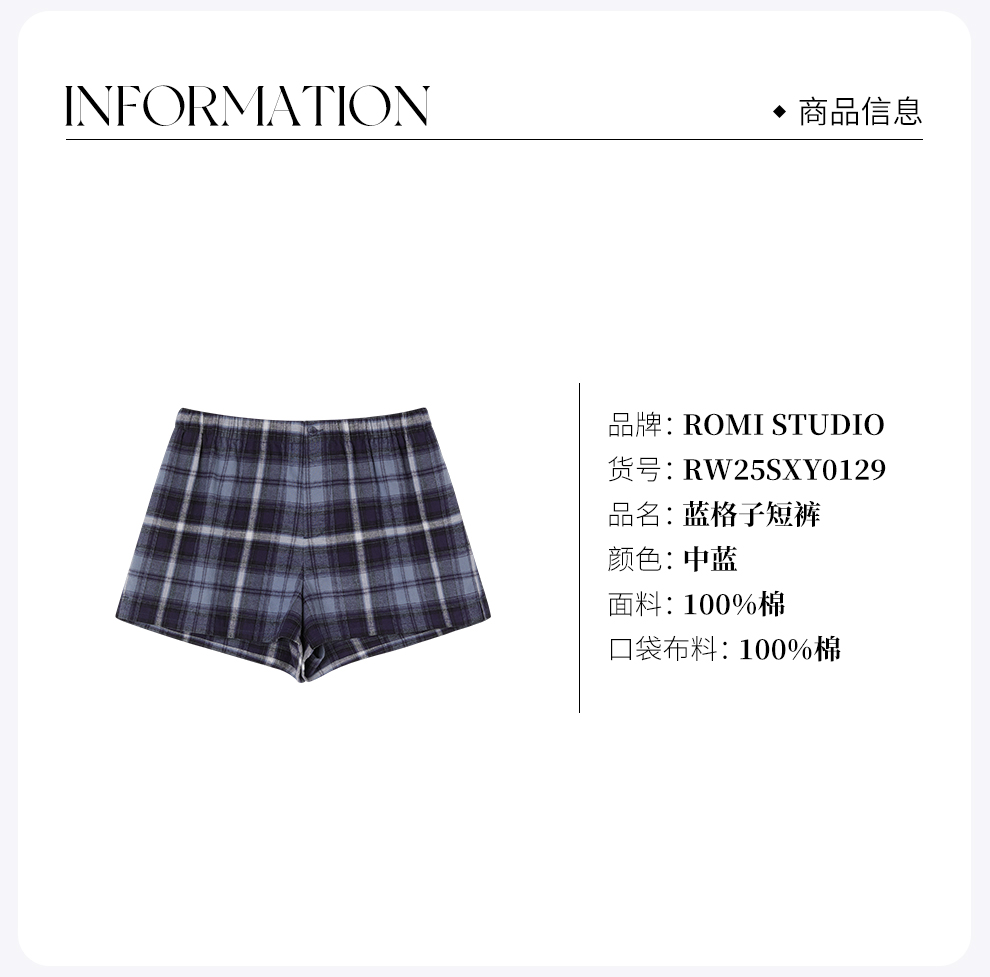 ROMI STUDIO“慵懒随性”长绒棉经典格纹松紧腰休闲短裤RW25SXY0129【发货时间25天】