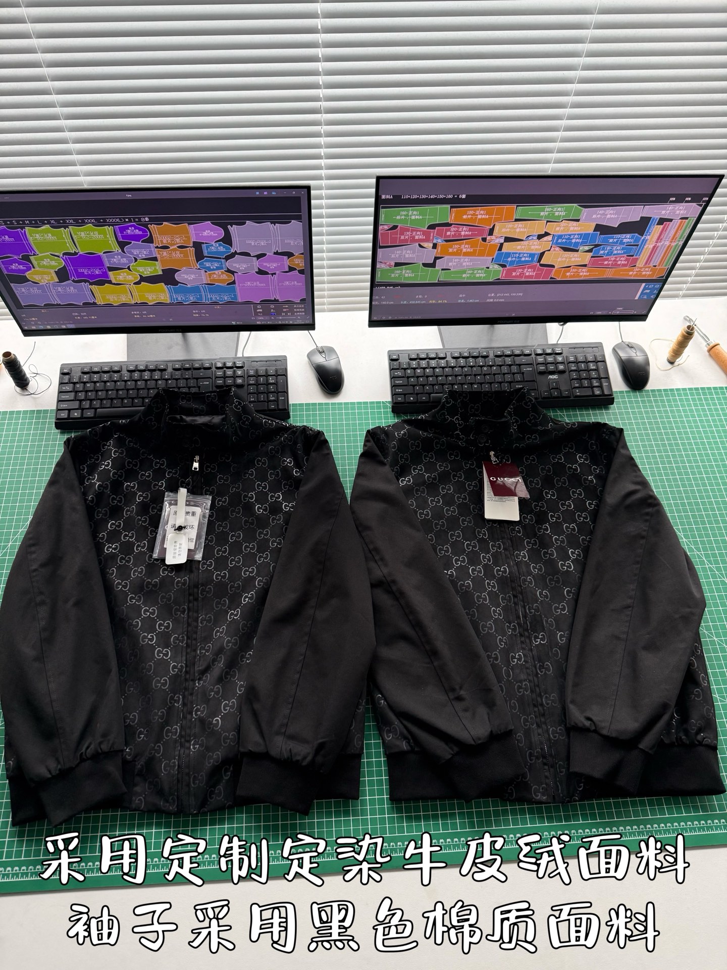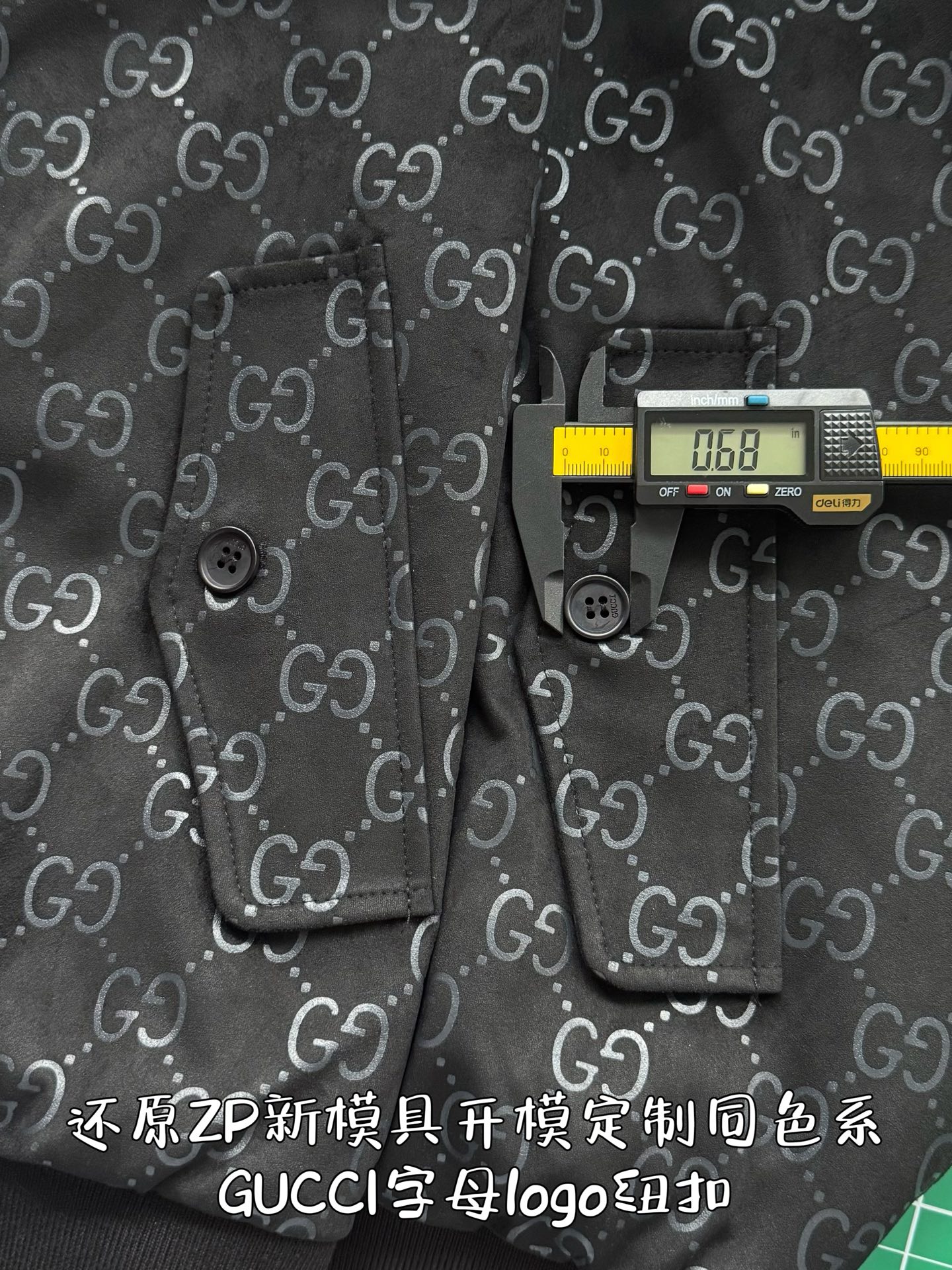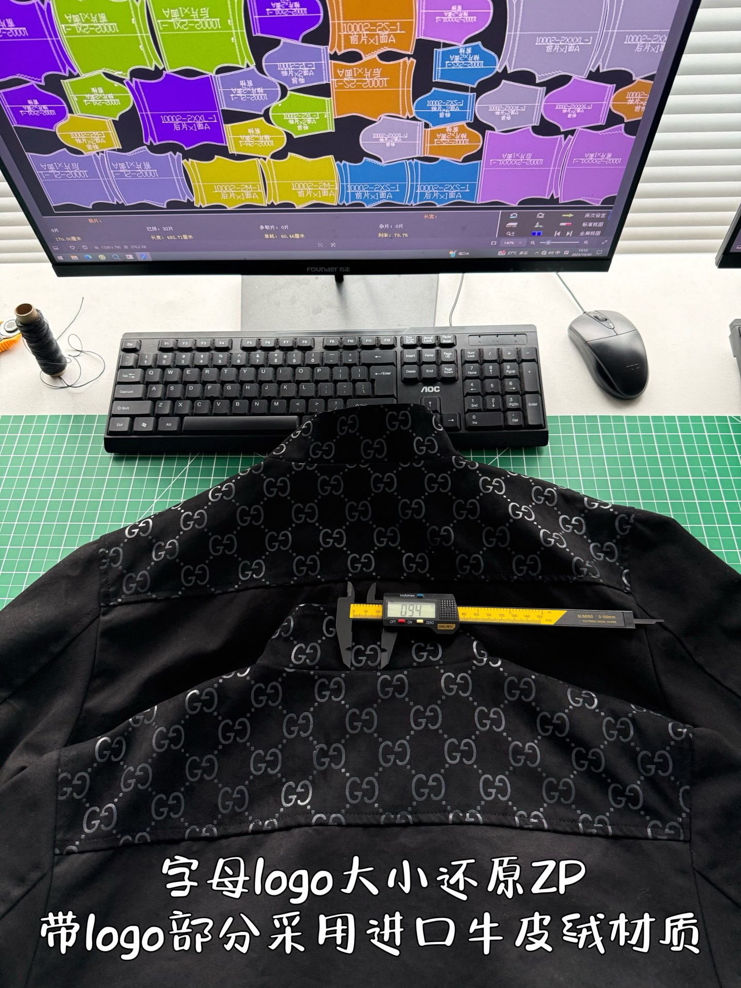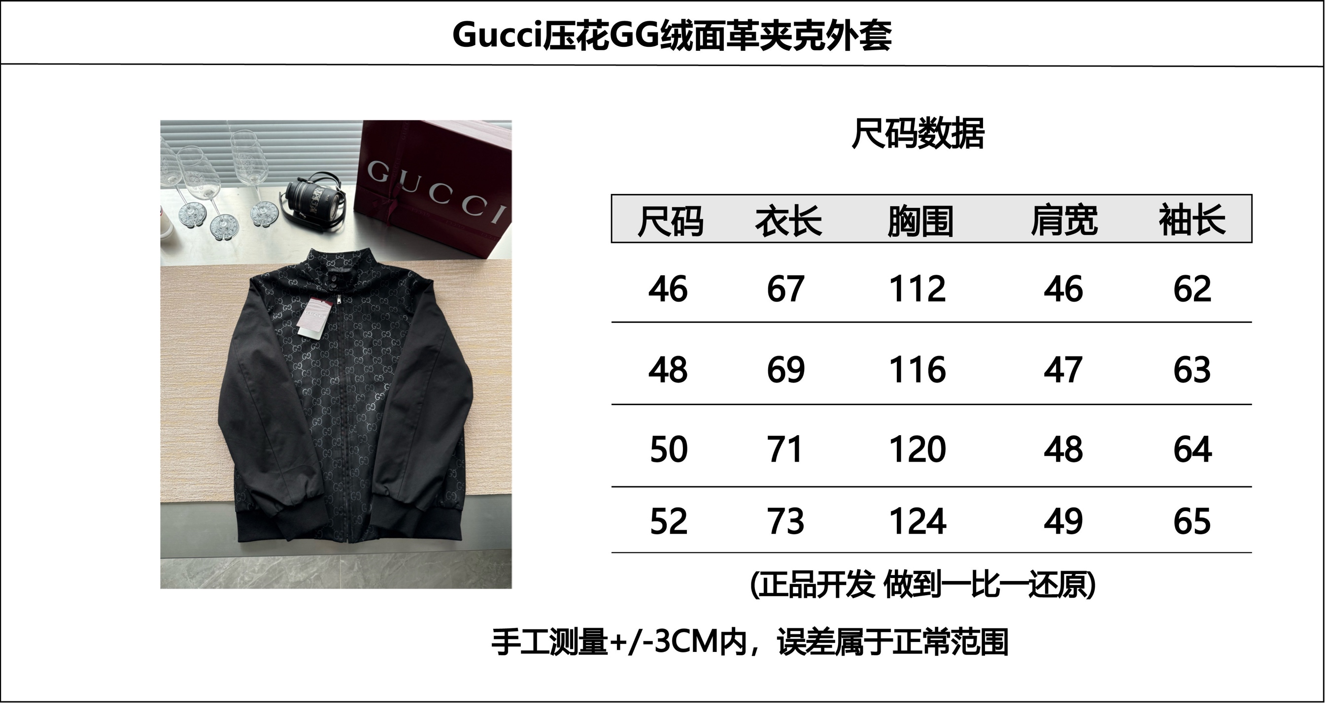 Gucci 2025 FW压花GG绒面革夹克外套‼️整件衣服30400购买Zp拆解打造,定制牛皮绒面料,前后幅饰以GG绒面提花,门襟开模定制GUCCI字母logo拉链,两边纽扣翻盖口袋,定织标志性罗纹袖口 下摆,超紧密度局部编织,真正做到1:1copy 闭眼入 码数:46 48 50 52