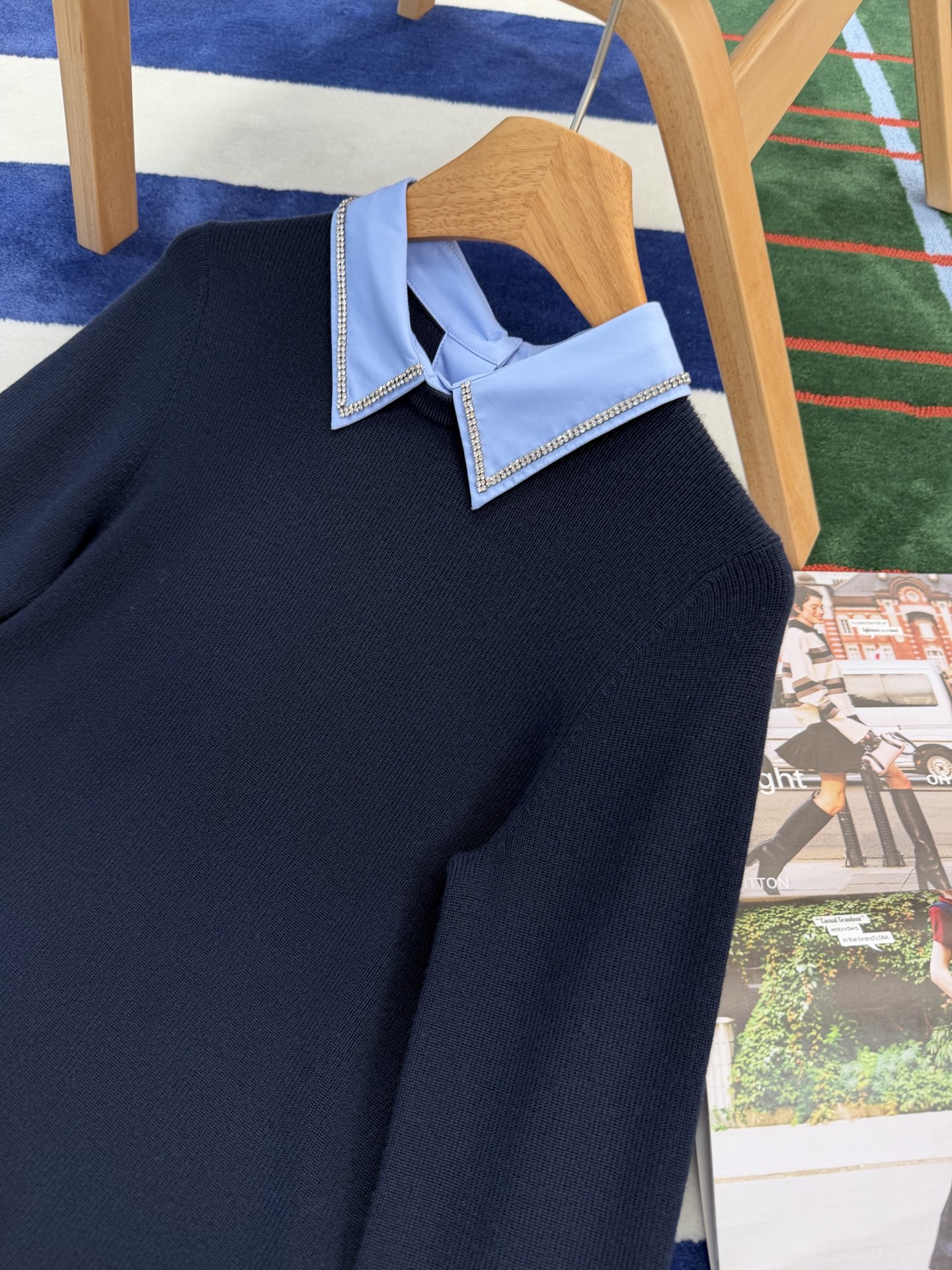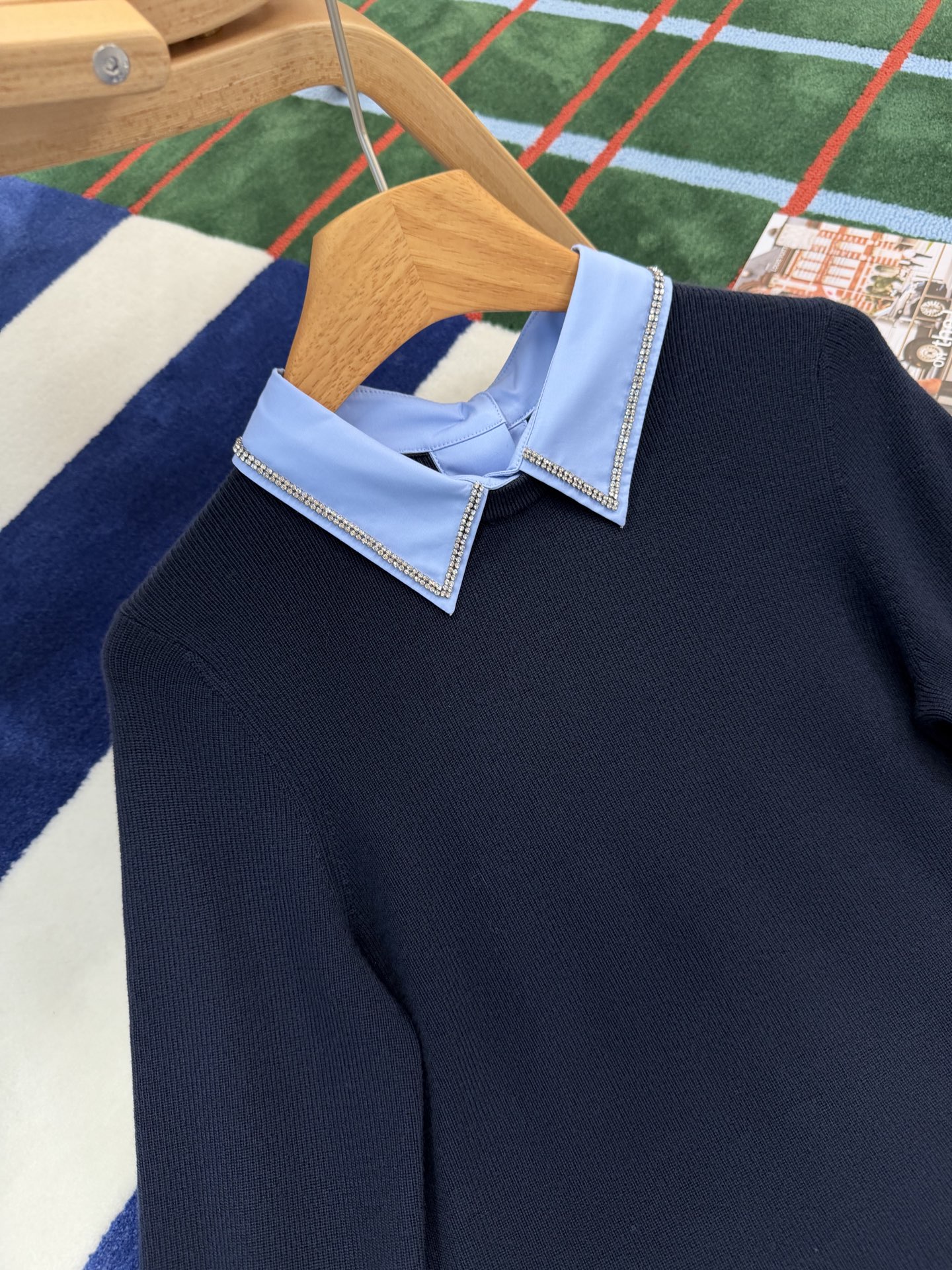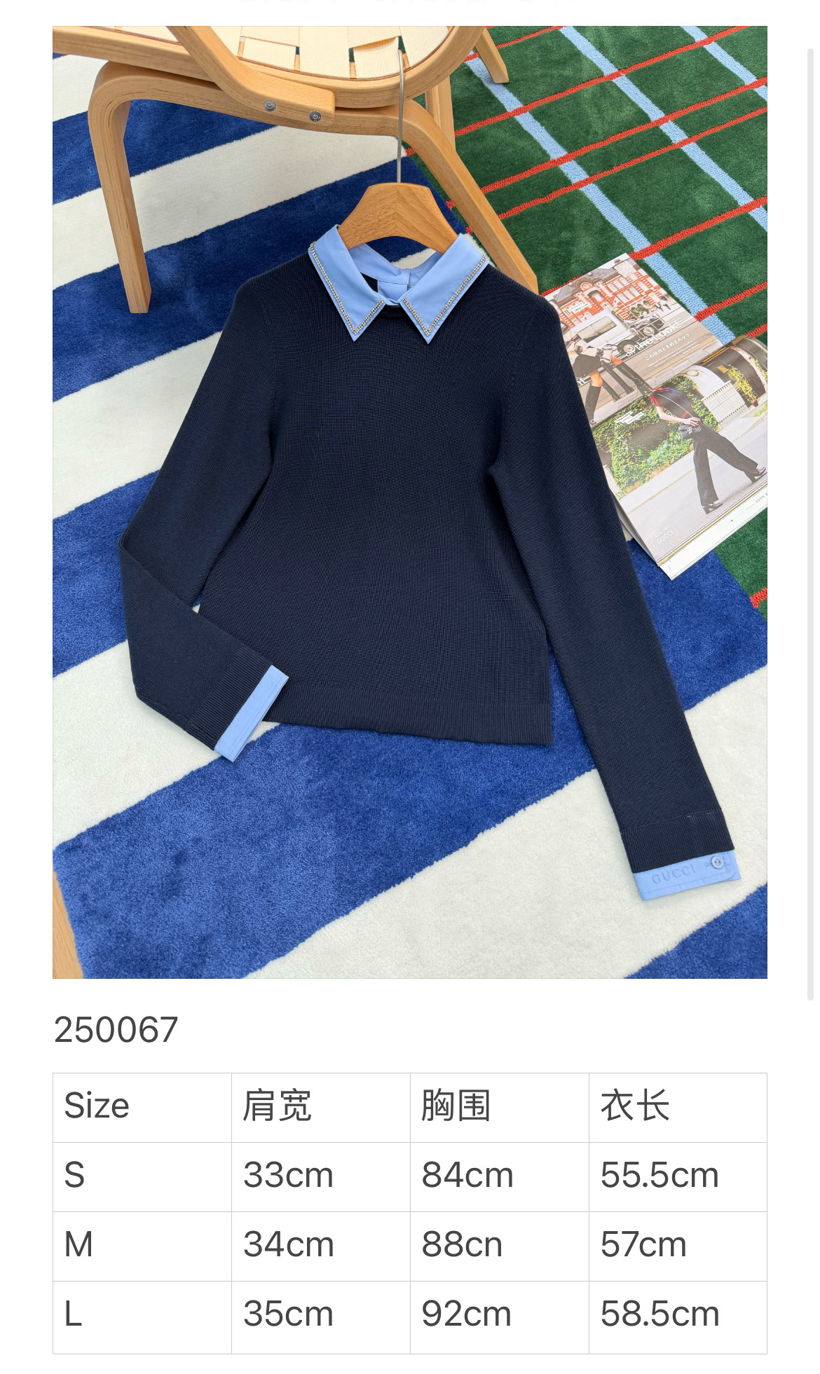 最新款新品🆕假两件羊毛针织衫, 层次感天花板👍🏻这件设计独特,羊毛衫与衬衫细节于一体,衣领处匠心缀饰水晶刺绣,➕ 袖口压纹标识,超重工☑️ 整体海军蓝的颜色高级又日常,一眼就让人爱上了😍休闲而精致的风格萦绕于此款针织衫中💫随身版型,质感真的绝了🉑 极简风格真的很出彩👍🏻超高级,特别精致,绝对是你的心头好💖不仅温暖,而且时髦指数爆表💫别犹豫,赶紧入手吧‼️码数SML