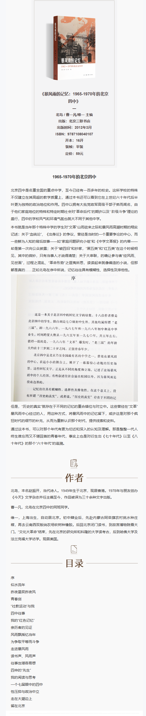 【绝版】《暴风雨的记忆:1965-1970年的北京四中》北岛、曹一凡、维一 编