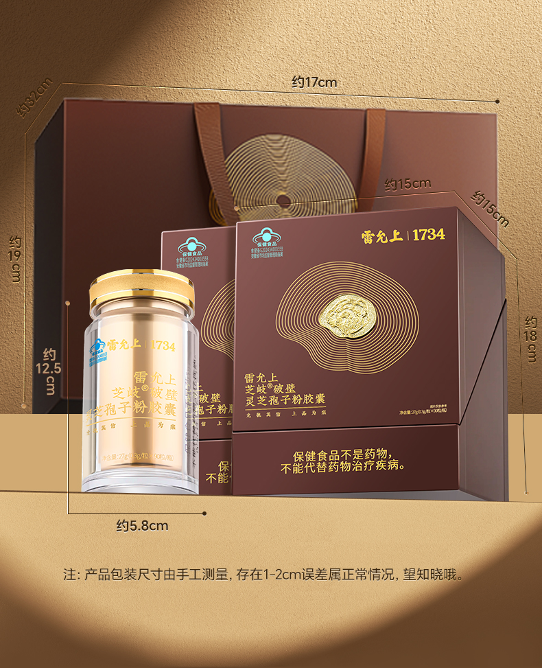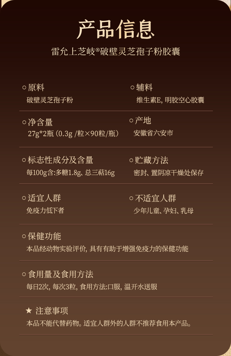 雷允上芝岐破壁灵芝孢子粉胶囊54g(27g*2瓶)/盒(0.3克/粒×90粒×2瓶)