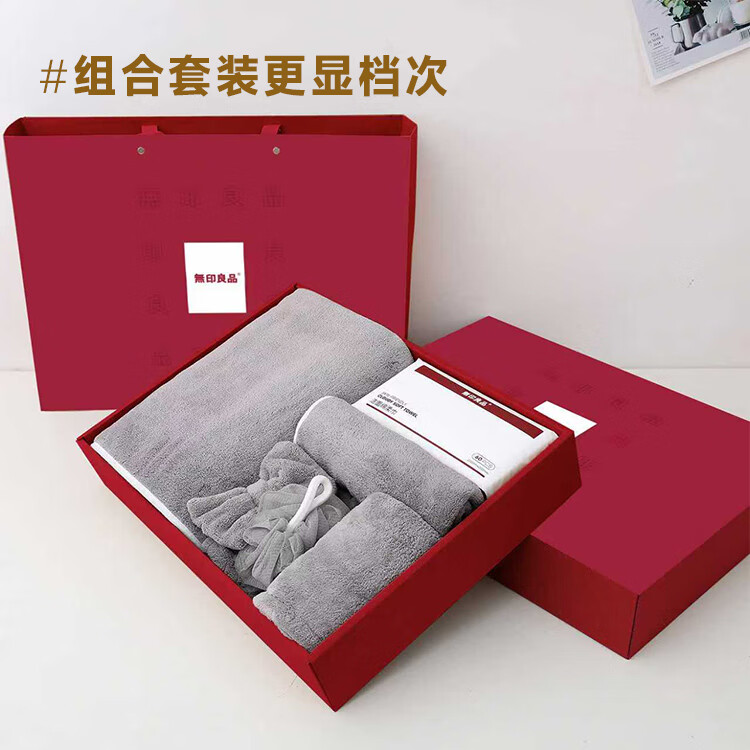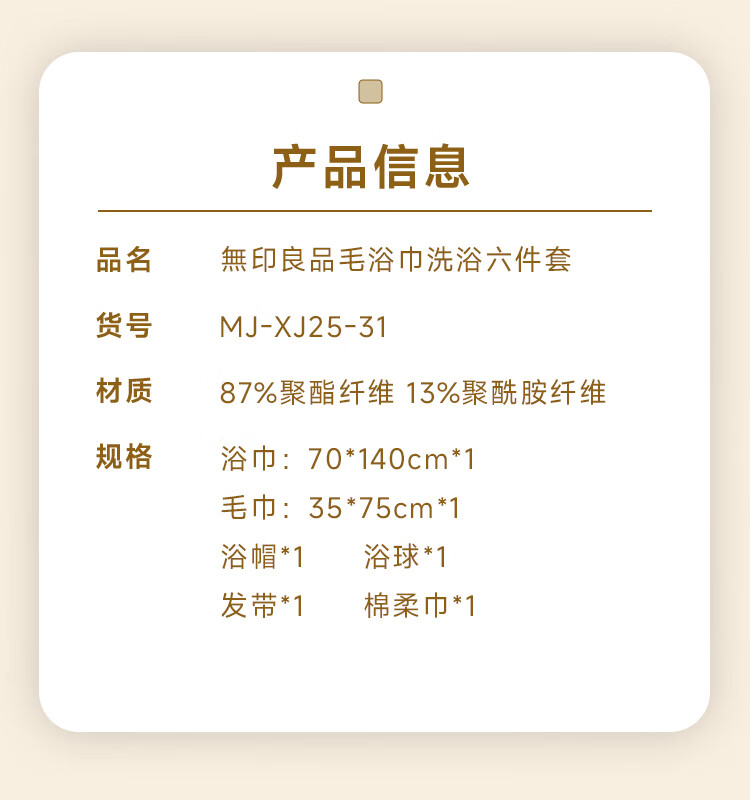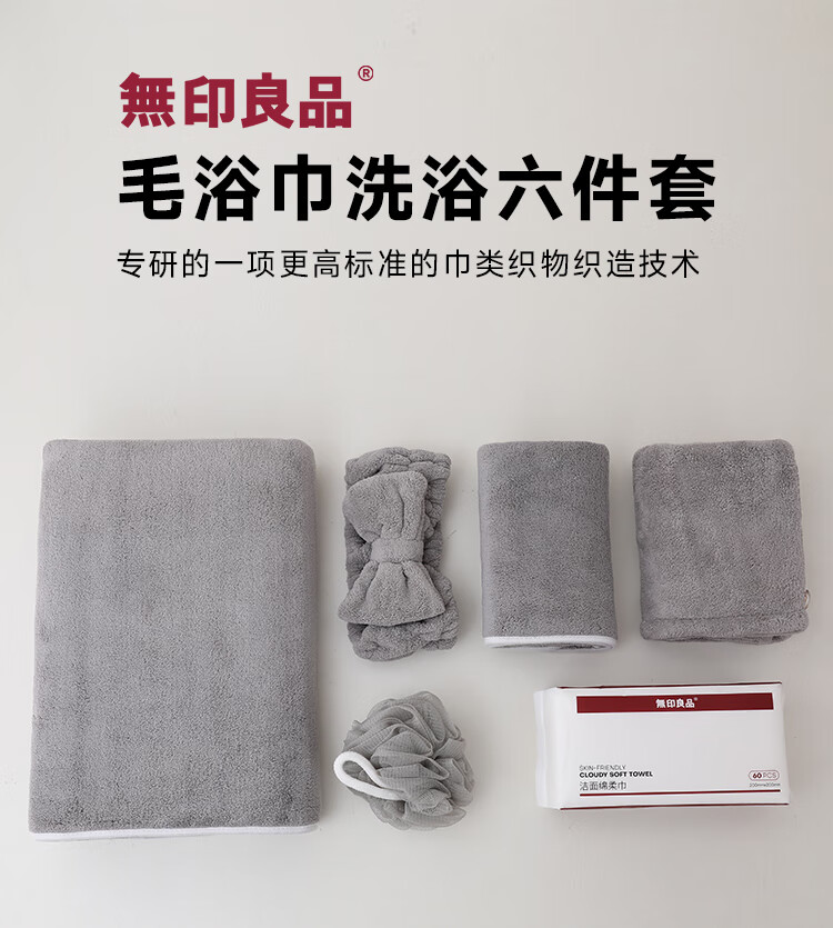 無印良品 毛浴巾洗浴旅行六件套MJ-XJ25-31 浴巾:70*140cm*1 毛巾:35*75cm*1浴帽*1 发带*1 浴球*1棉柔巾*1