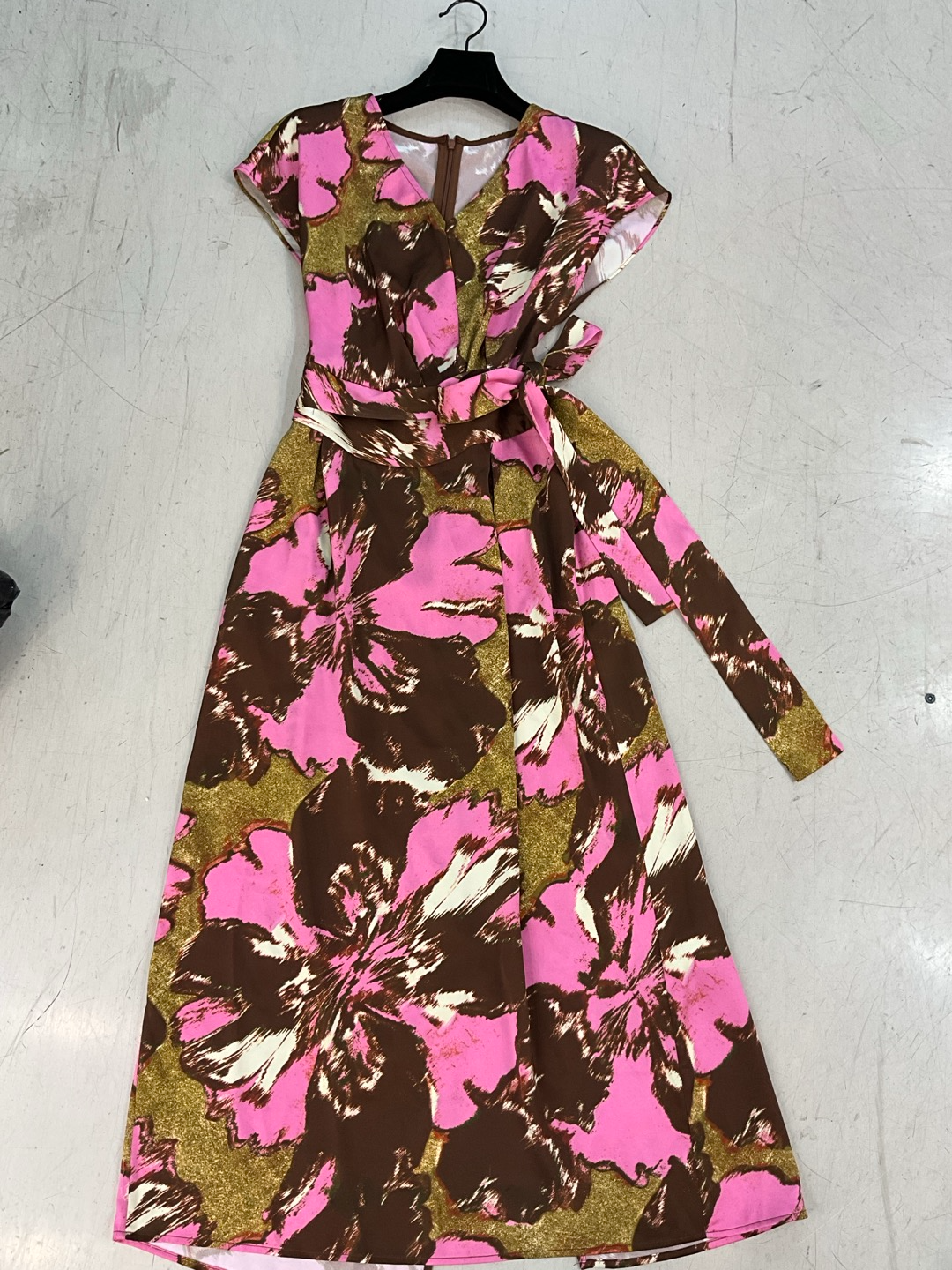 伯妮斯茵 | 复古撞色 V 领无袖印花连衣裙 大花卉肌理 系带收腰 A 字大摆 度假出游款 SZ2S70-水红色