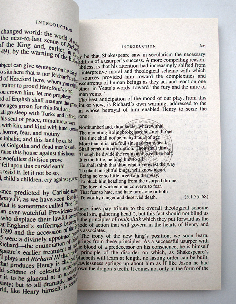 Henry IV《亨利四世》是莎士比亚历史剧的杰作,也是历史剧中很成功、很欢迎的一部,主要讲述了英国兰开斯特王朝第1任君主亨利四世和他的王子们与反叛的贵族进行殊死较量的故事,在下篇的结尾,统治期内始终为叛乱和病体困扰的亨利四世去世,表面浪荡不羁的王太子哈里即位,史称亨利五世。莎士比亚采用了两条线索平行发展的结构,以亨利四世为代表的宫廷生活线索和以福斯塔夫为代表的市井生活线索,塑造了福斯塔夫、哈里亲王等一系列文学史上影响深远的精彩角色。