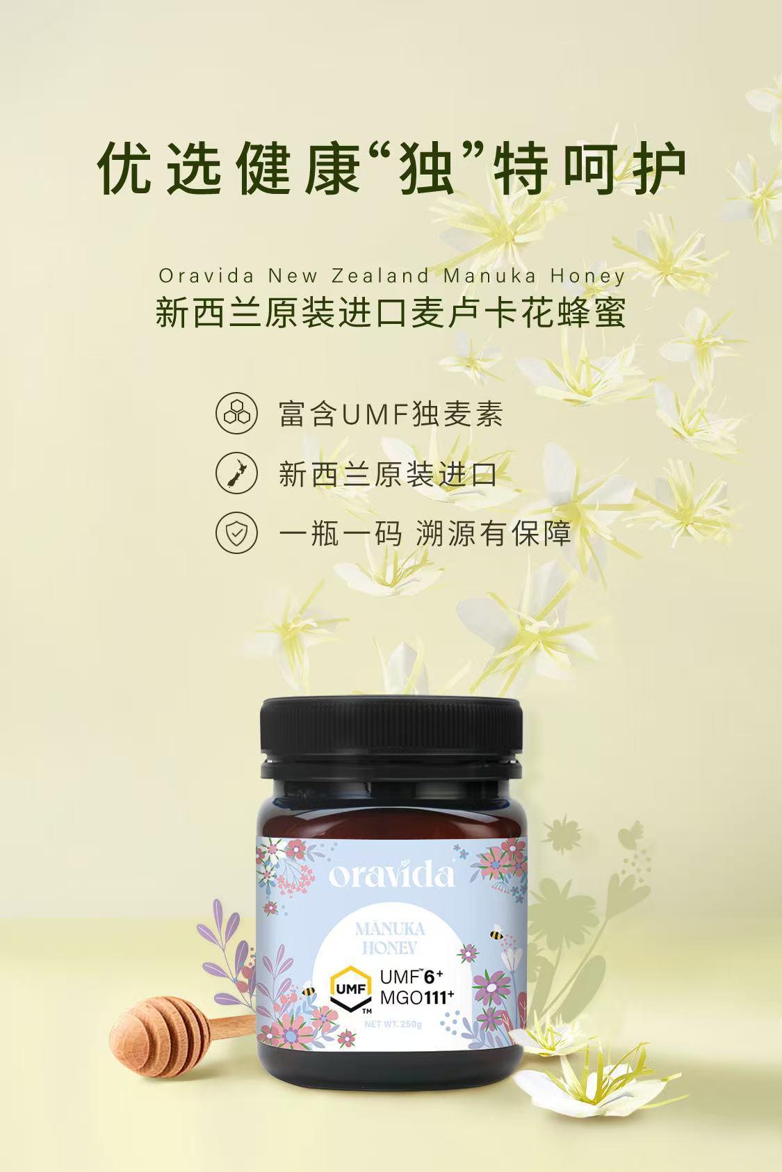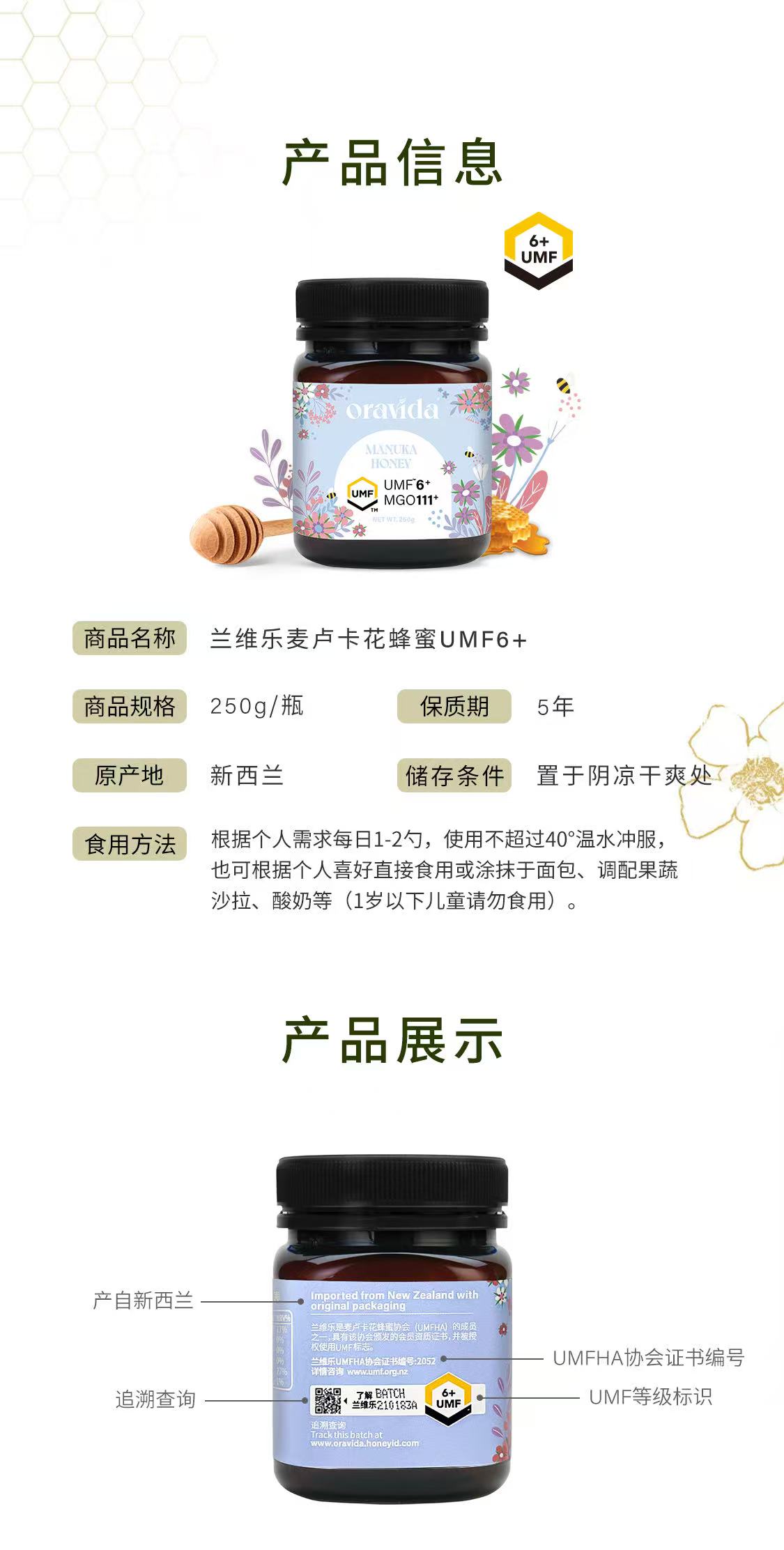 【女神节】UMF6+新西兰麦卢卡蜂蜜250g原装进口+赠360ml含气矿泉水1瓶