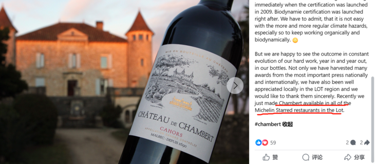 在酒庄的 Facebook 官网上,它们宣布:他们的 Chambert 已入驻卡奥当地各大米其林餐厅,这里的 Chambert 应该指的就是我们推荐的这酒。