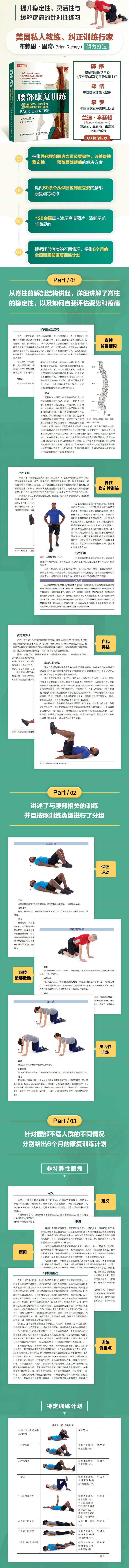全书分为3个部分11章。第1部分从脊柱的解剖结构讲起,详细讲解了脊柱的稳定性,以及如何自我评估姿势和疼痛。第2部分讲述了所有与腰部相关的训练,并且按照训练类型进行了分组。第3部分是常见疾病,包含每种特定脊柱疾病的基本知识以及针对每种疾病的特定训练计划。本书提供了针对脊柱稳定性,以及各种强化腰部功能的训练动作,并制订出解决常见腰部问题的全周期训练方案。