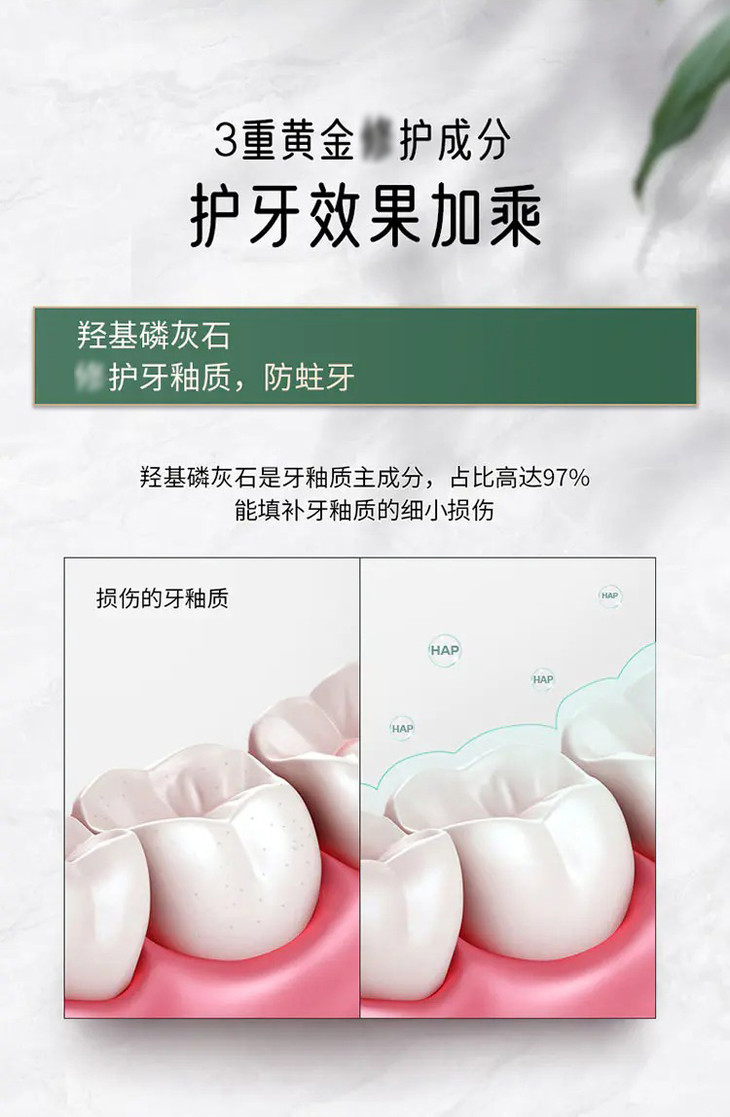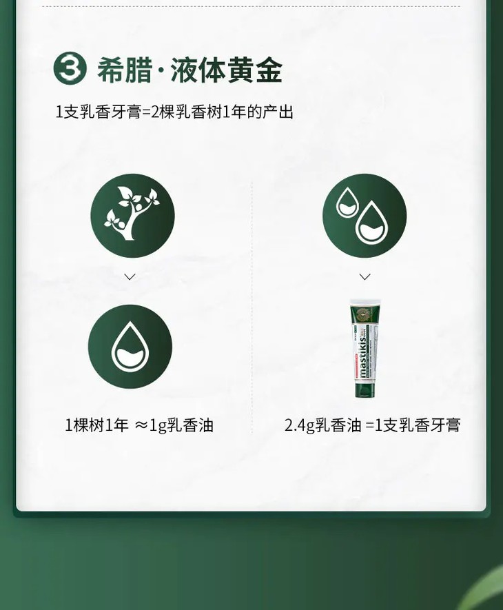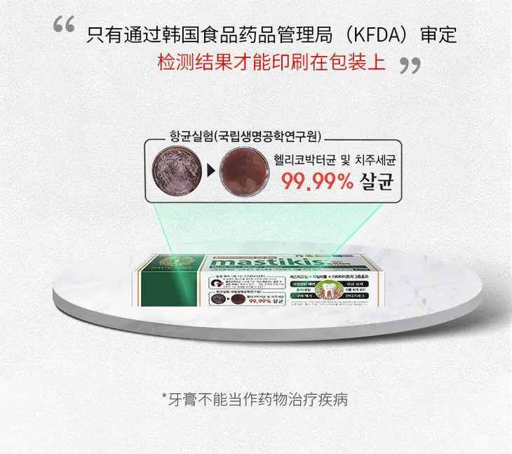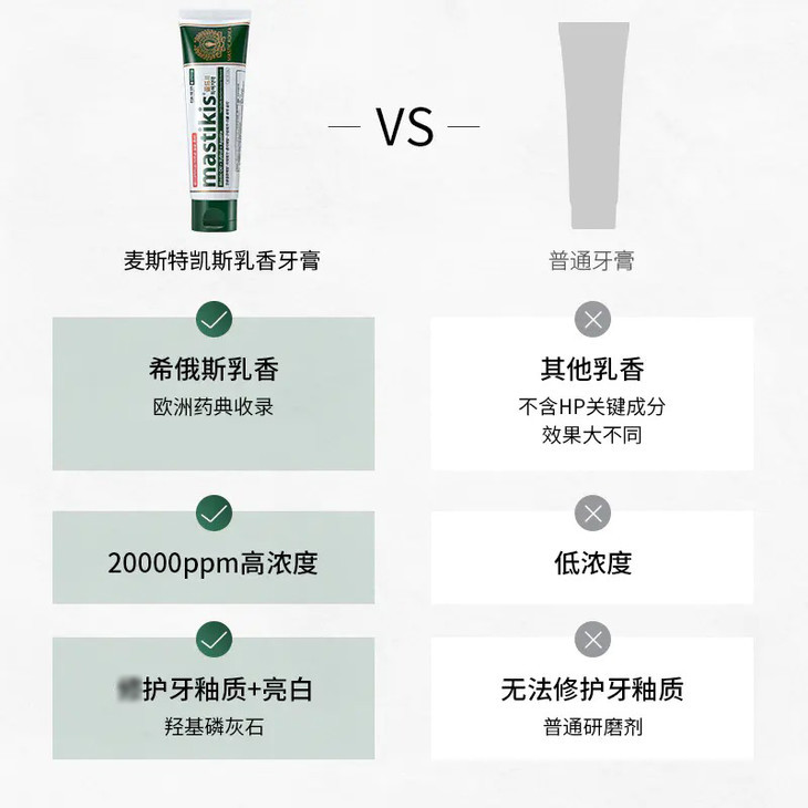 120g麦斯特凯斯乳香牙膏中含有2%的乳香含量,每天坚持刷牙3分钟就能对口腔里的幽门螺杆菌起到99.99%的消灭,当然除了幽门外,乳香对牙周病菌群的抑制效果也很出色!麦斯特凯斯乳香牙膏中还加入了与牙齿相同的成分——羟基磷灰石(HAP)粒子,HAP粒子与牙釉质有着良好的生物亲和性。在去除牙渍的同时,可以修补牙齿表面缺失的釉质层,并且在牙齿表面自然形成一层保护层,让牙齿更加强健!