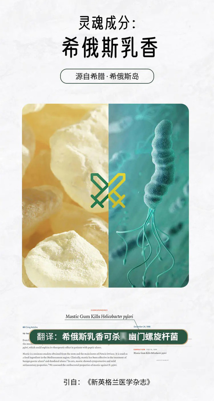 乳香,又称“希俄斯之泪”,是从乳香黄连木中采取的树胶提取物。爱琴海希俄斯岛南部的黄连木,在割开树皮时会流出乳香脂,一般用作香料或供药用。早在2500多年前,古希腊医生就用乳香油治疗各种胃肠道疾病。英国权威杂志《新英格兰医学杂志》,还用非常肯定式的标题发布《希俄斯乳香消灭幽门螺杆菌》,美国微生物学会和植物药学期刊以及日本静冈大学都证明了长期食用乳香能帮助缓解幽门螺杆菌滋生。