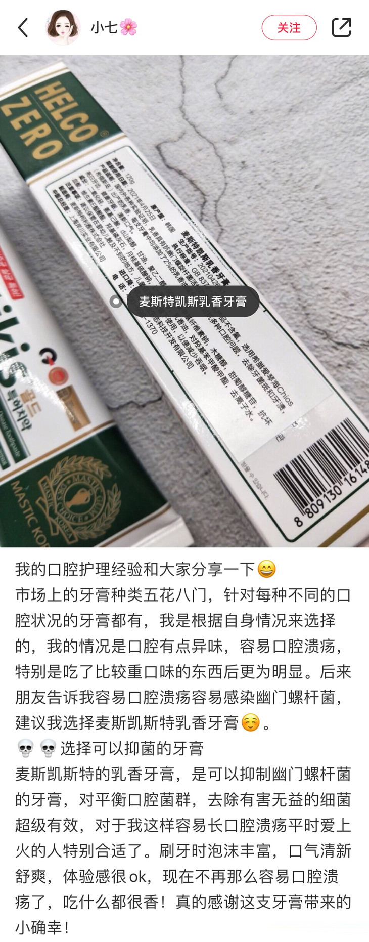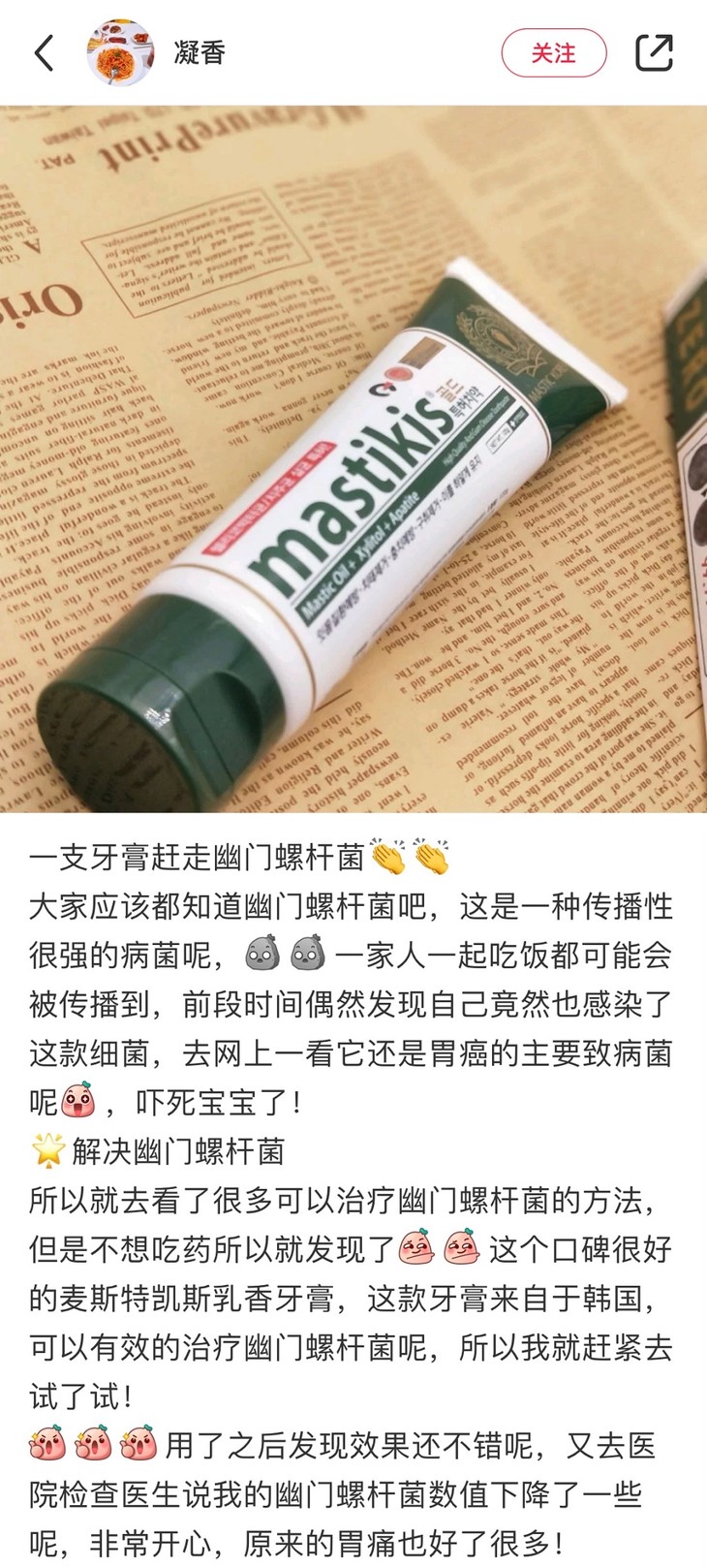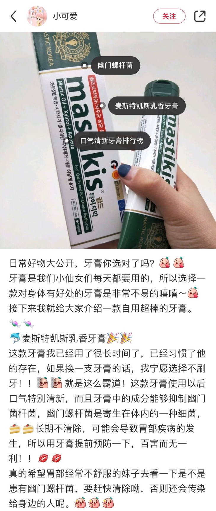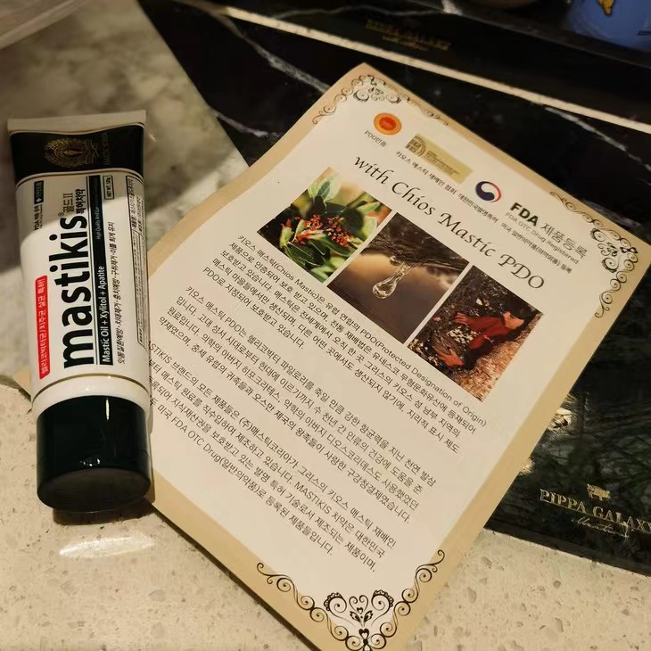这是朋友推荐的,她老公年后体检幽门螺杆菌阳性,现在全家都换了这支,是韩国的麦斯特凯斯牙膏,据说蛮红的,能抑制口腔中的幽门螺杆菌,而且使用感也很好。