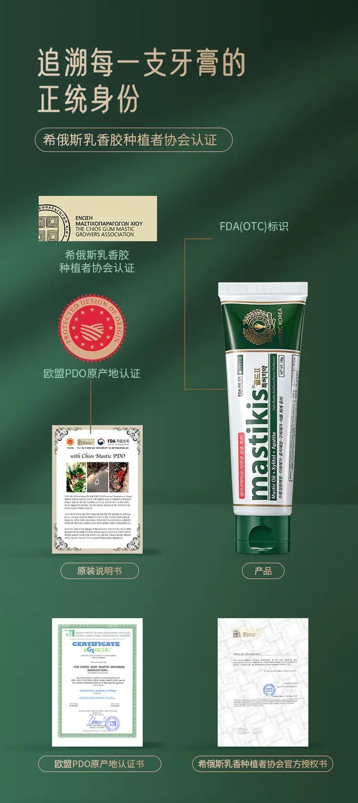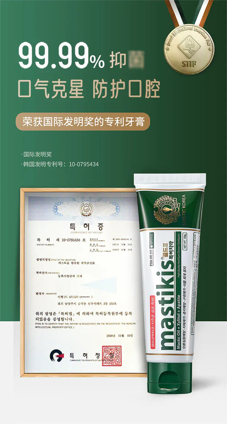 麦斯特凯斯乳香牙膏来自韩国,自诞生以来就各种国际大奖拿到手软。它在2008年的时候参加首尔国际发明展会:从34个国家486个展品中脱颖而出并且荣获银奖。而且还因此获得了韩国专利厅的专利认证,作为牙膏中重要的原料的乳香也得到原产地名称的认证。