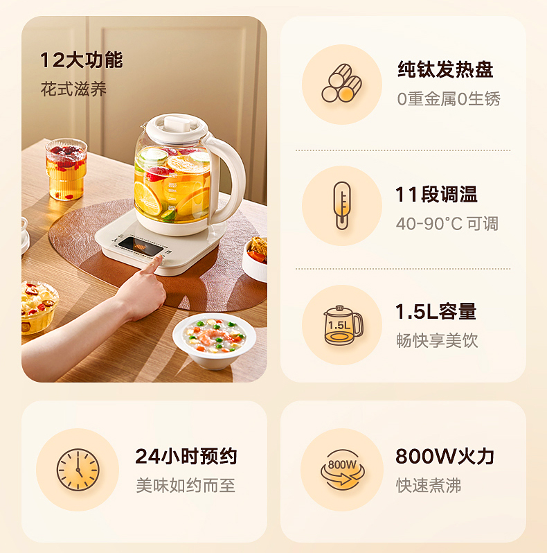 积米钛养身壶,一台=N台!炖品+煲汤+熬粥+甜品+药膳 +花、果茶+温奶等等,全都一壶搞定!