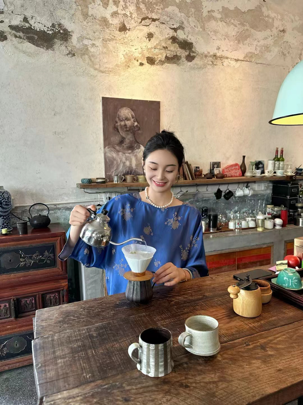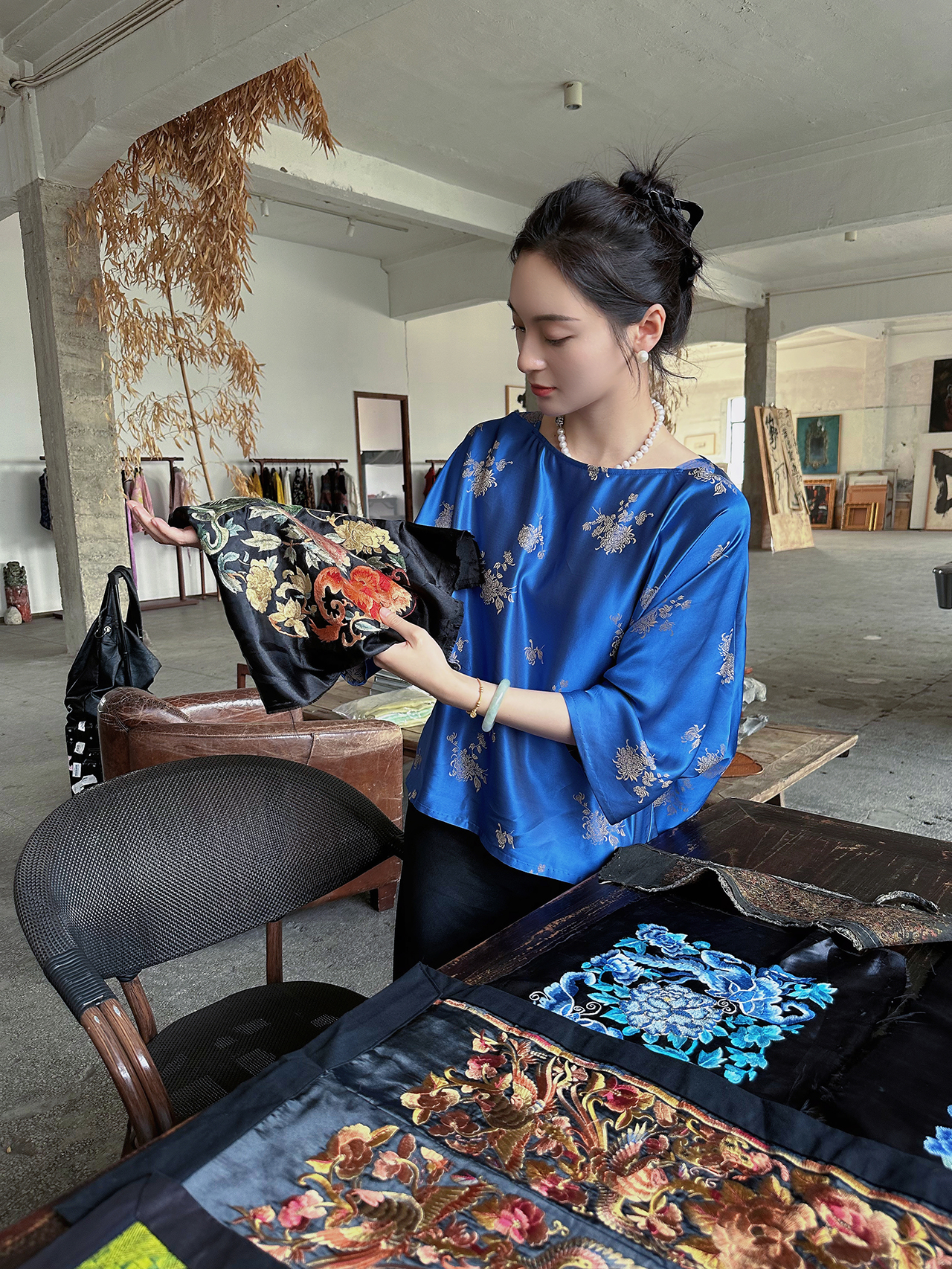 盛唐牡丹 |孔雀蓝菊花纹交织提花真丝上衣