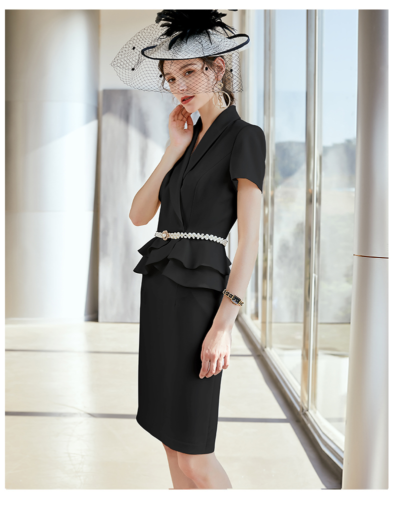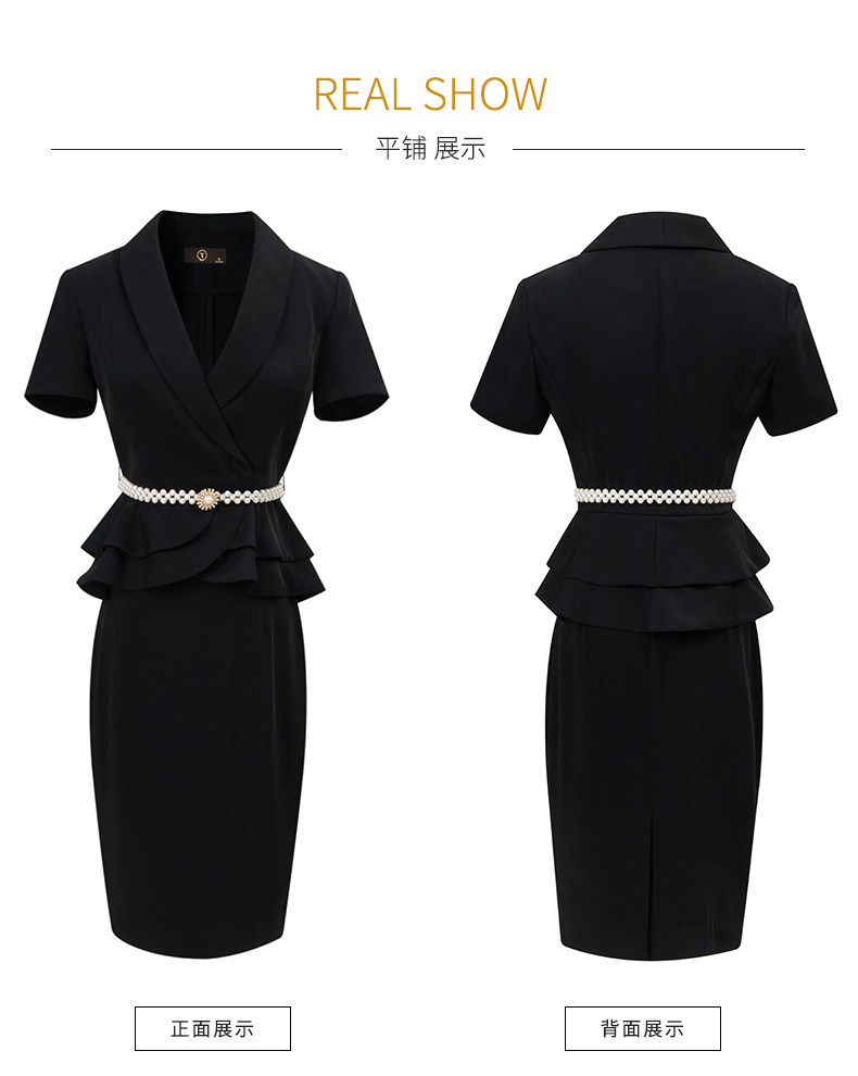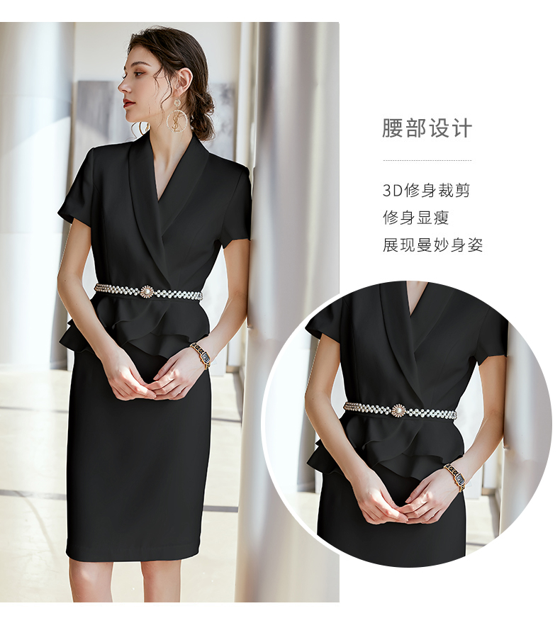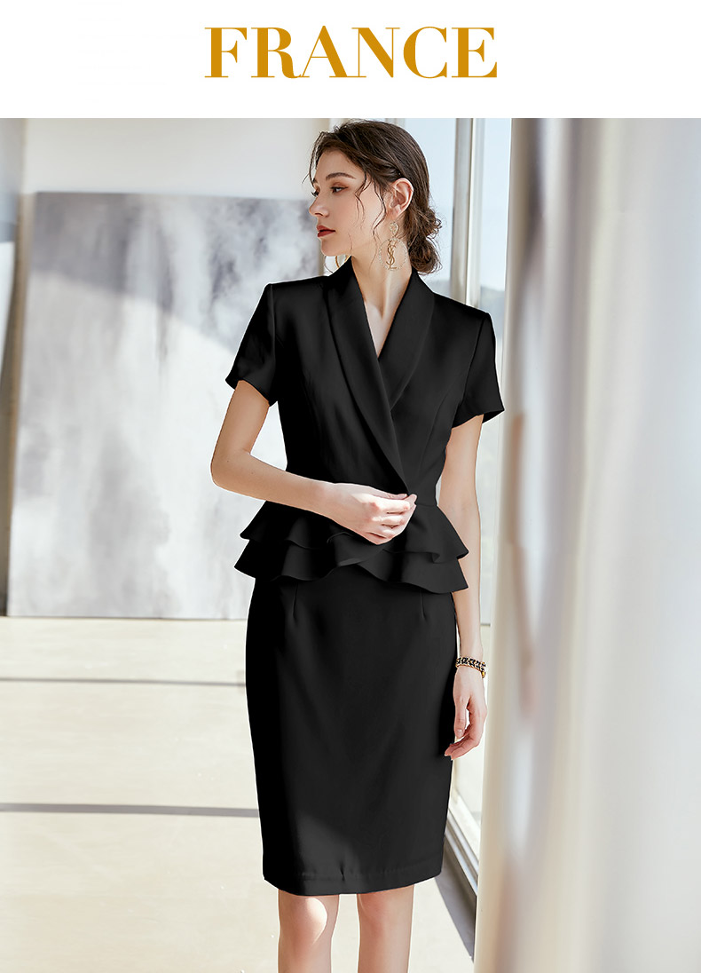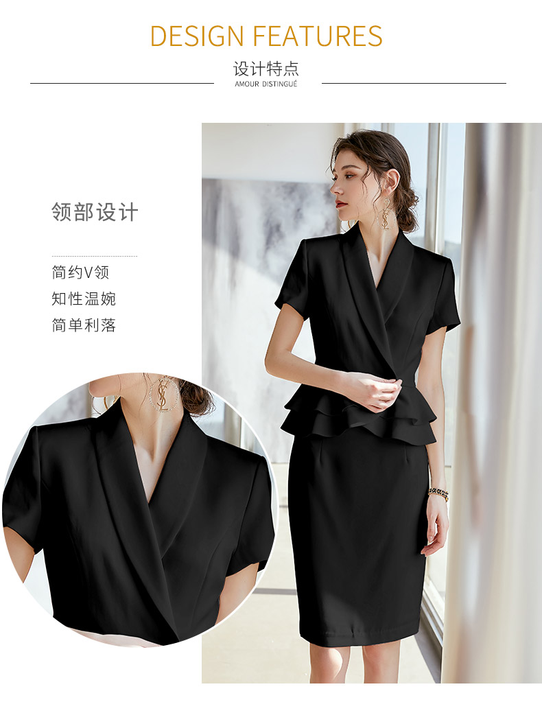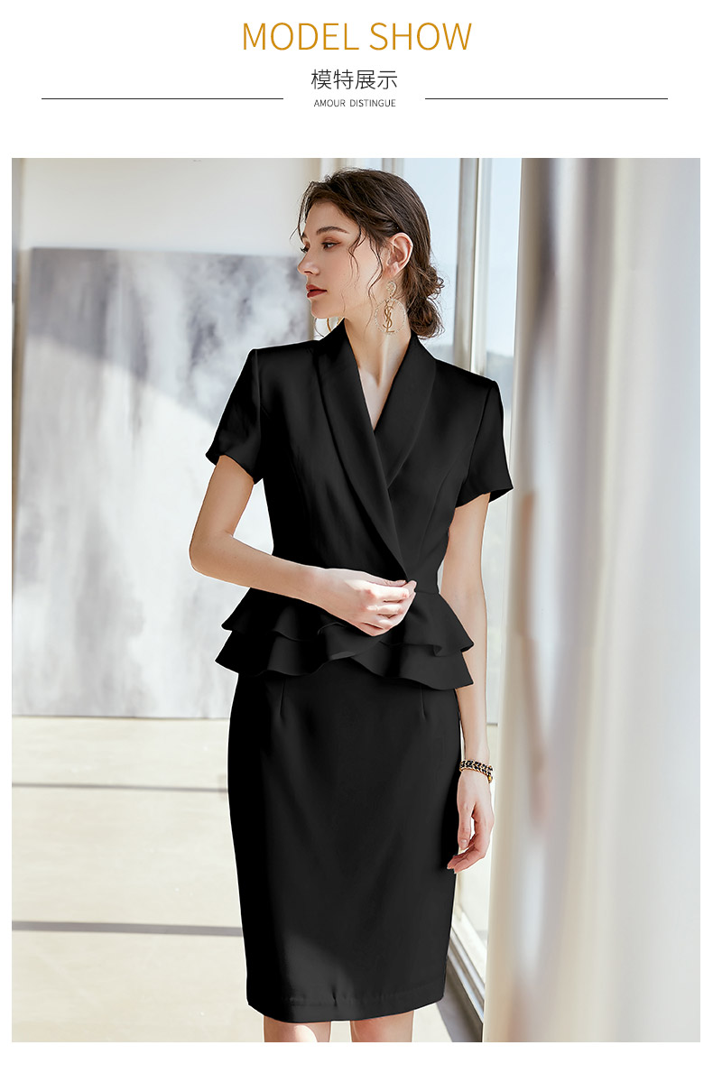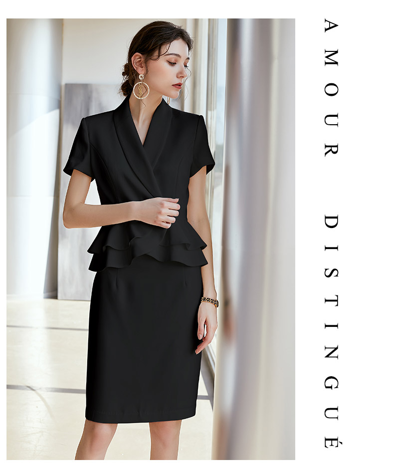AD夏短袖职业装套装女名媛正装黑色时尚工作服气质荷叶边西装套裙