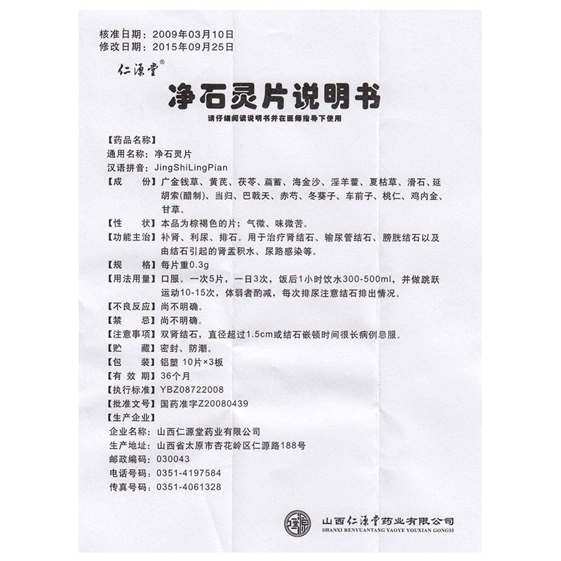 仁源堂 净石灵片 0.3g*30片/盒 补肾 肾结石 利尿 尿路感染
