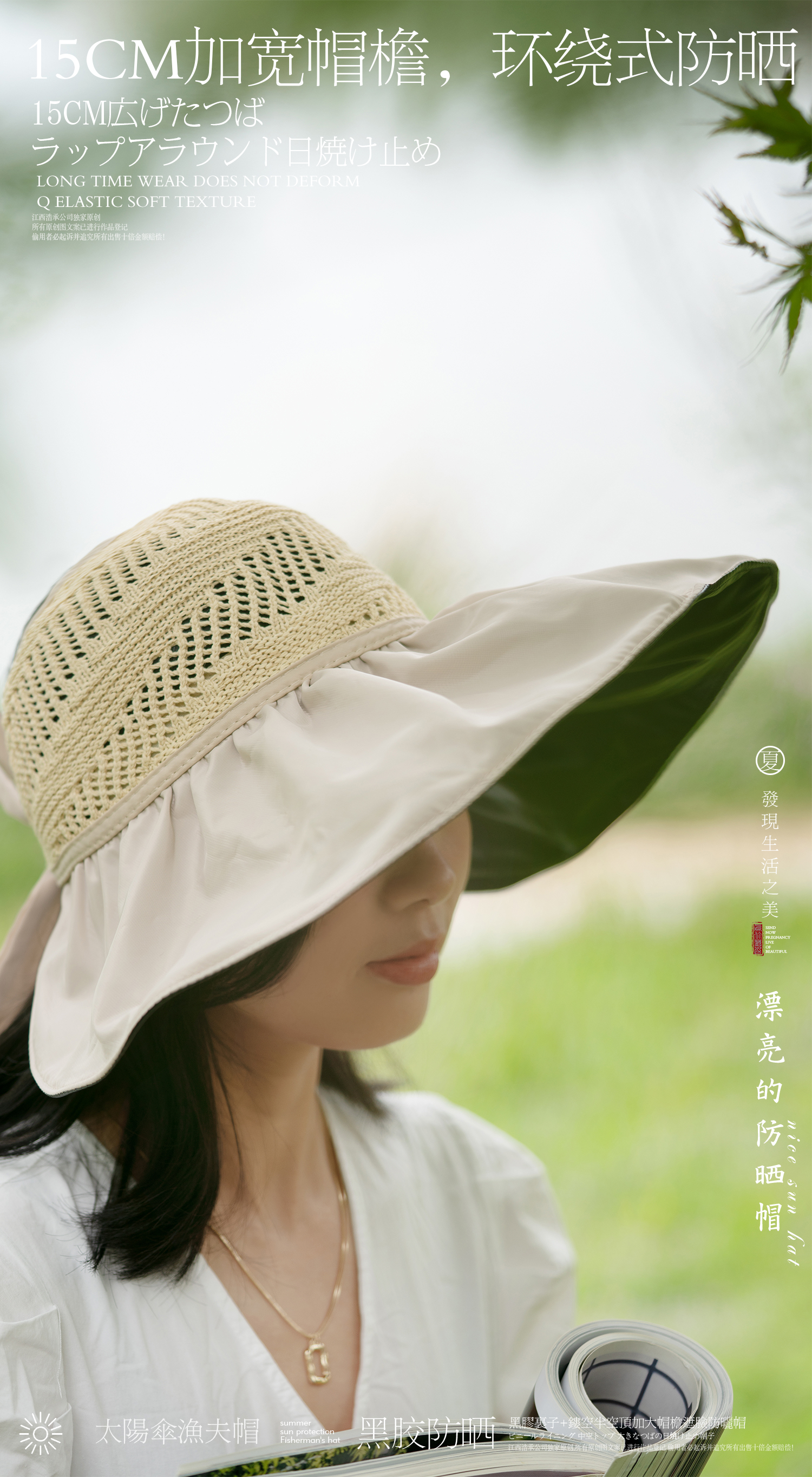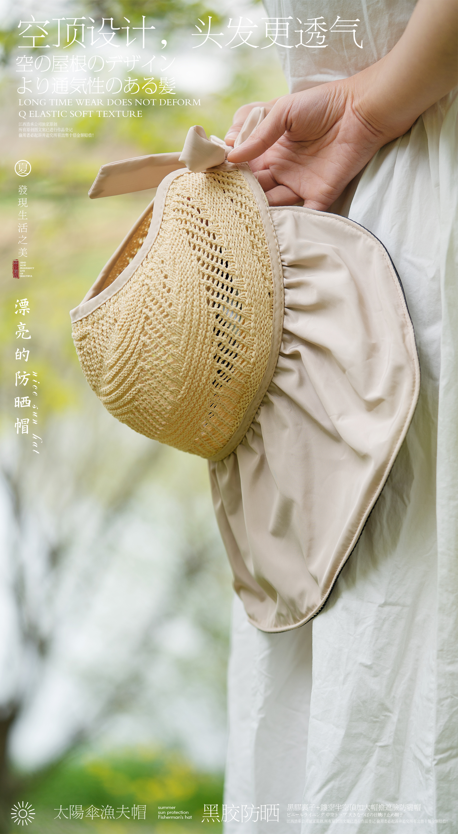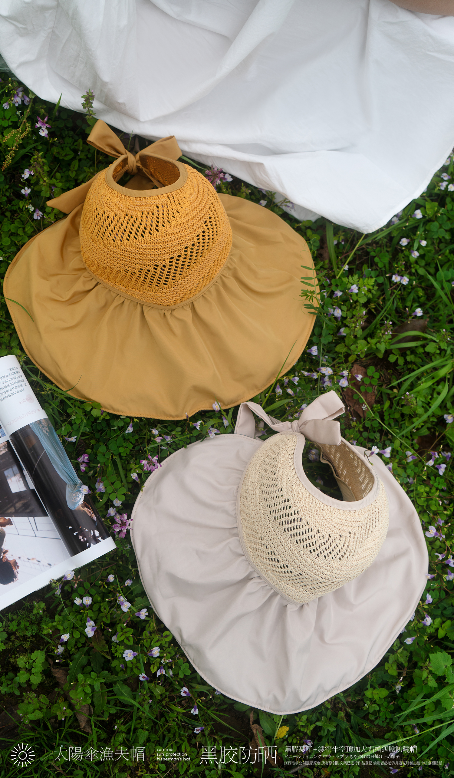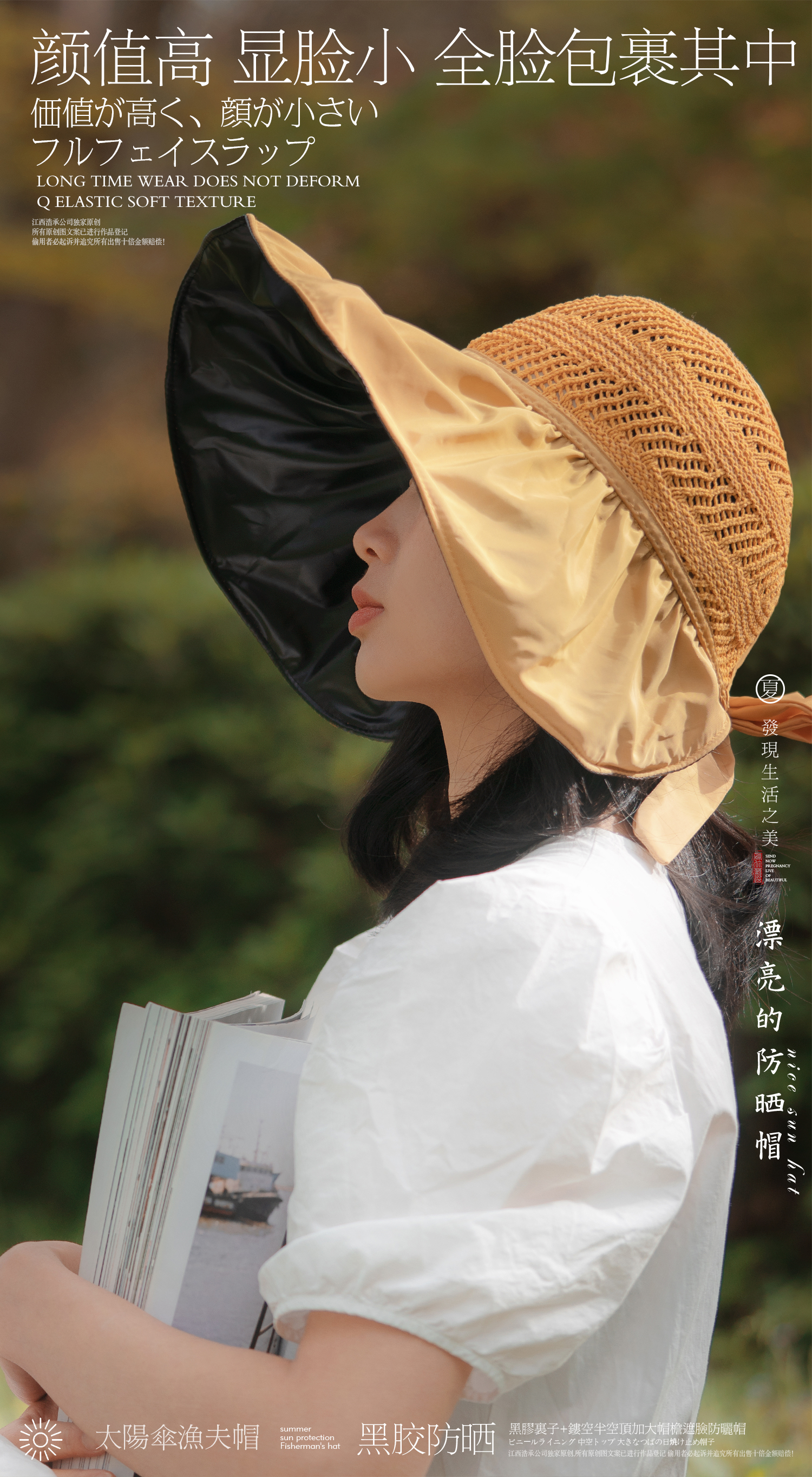 【热卖】黑胶半空顶防晒渔夫帽,可扎马尾草编遮阳帽,后空顶大帽檐遮脸防晒帽【223-6】