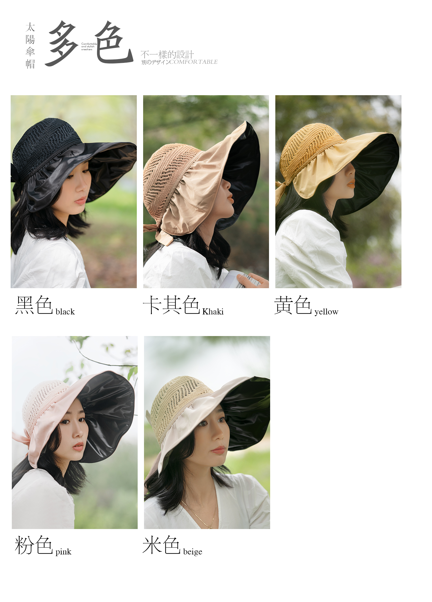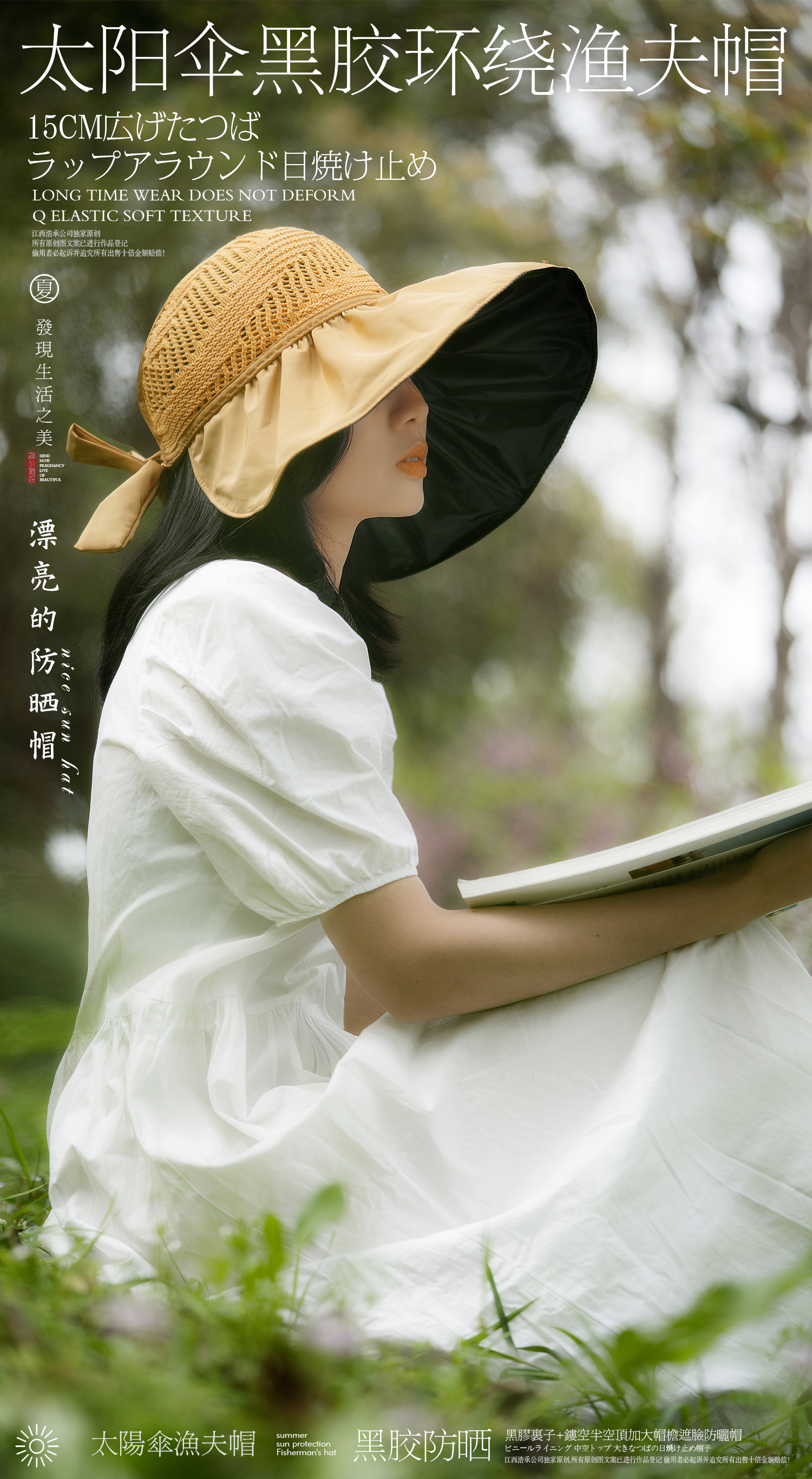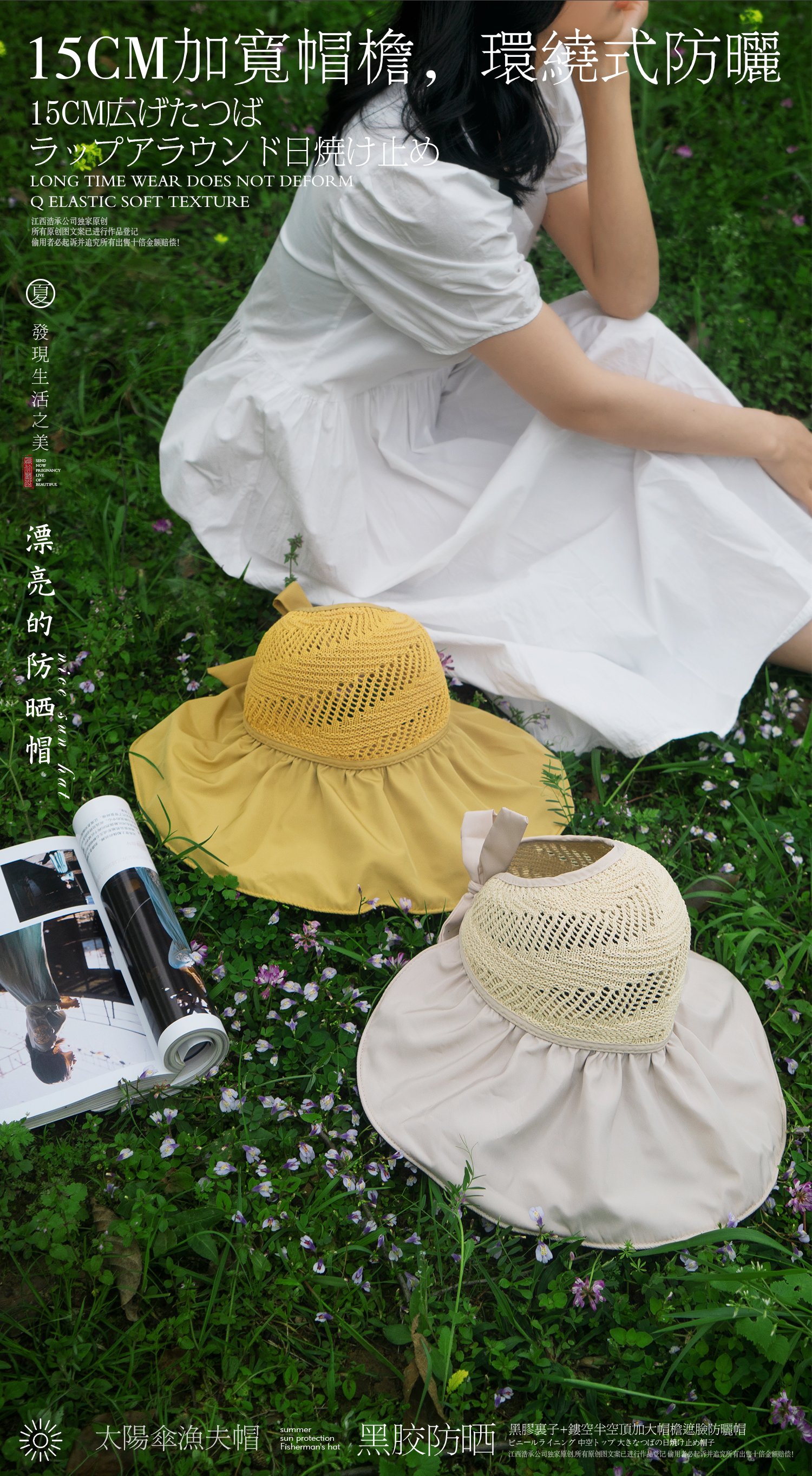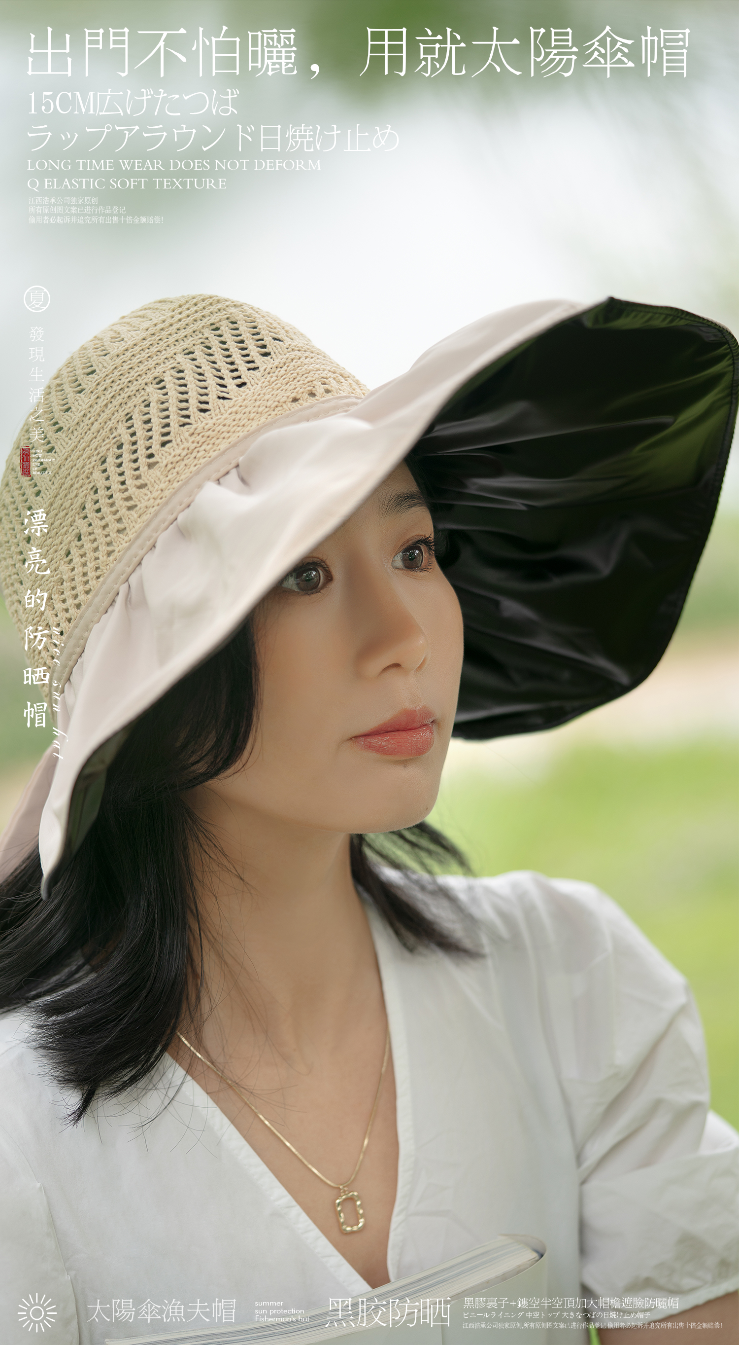【热卖】黑胶半空顶防晒渔夫帽,可扎马尾草编遮阳帽,后空顶大帽檐遮脸防晒帽【223-6】