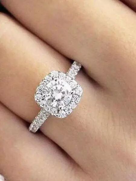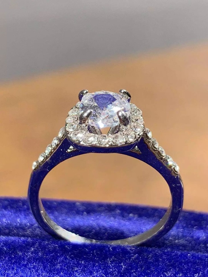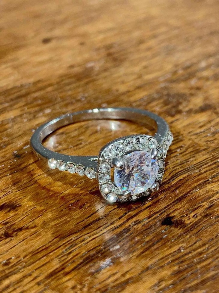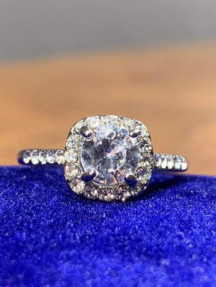 这是一只形式仿造高端钻石戒指的时尚首饰,似铂金之鎏银金属镶嵌纯净无瑕之锆石,方型戒指台面高雅大气,除非近距离审视,仿真钻石戒指惟妙惟肖。