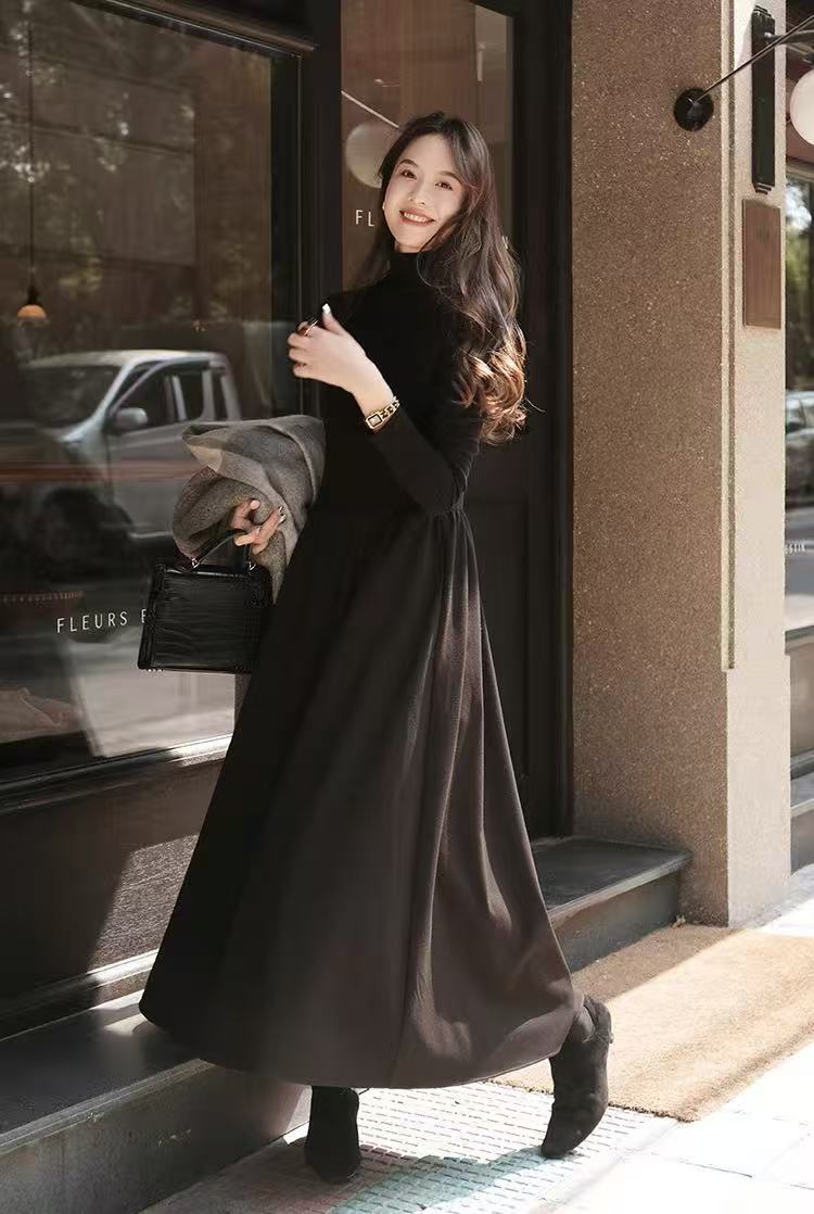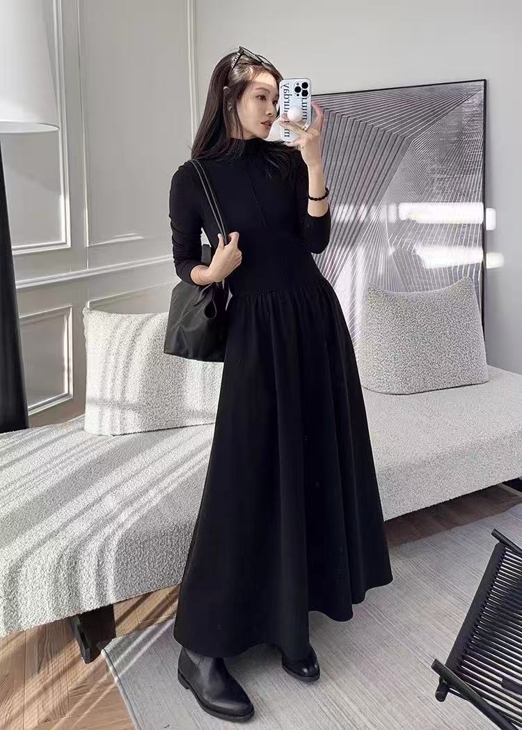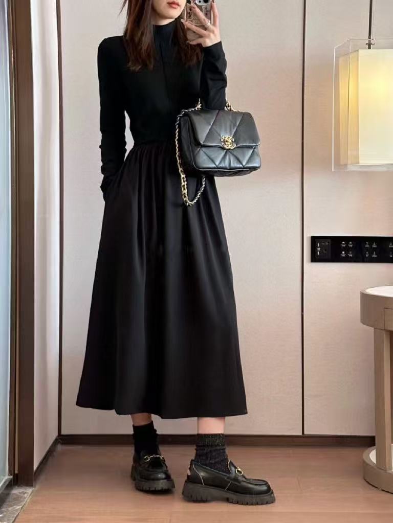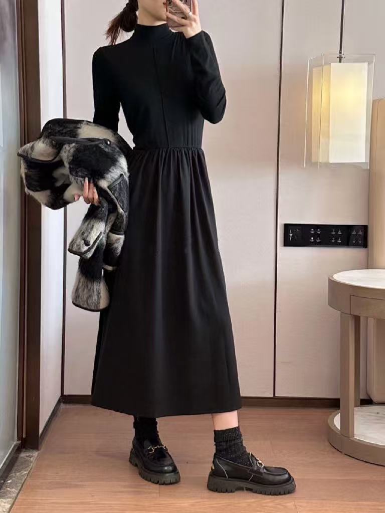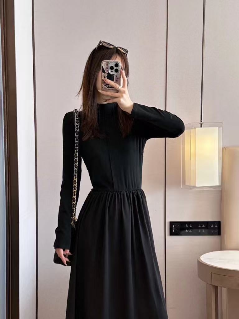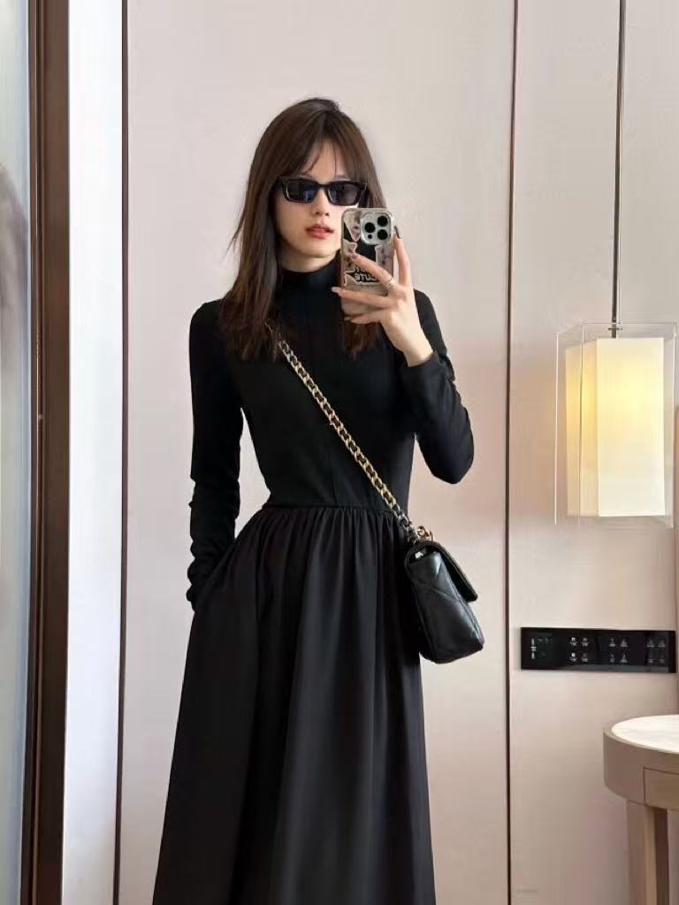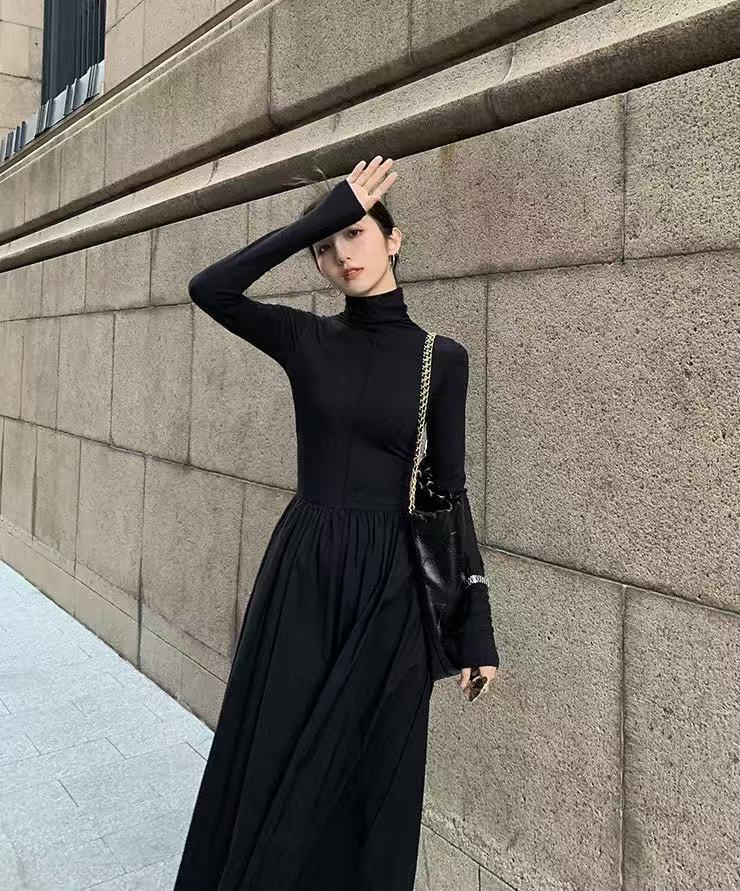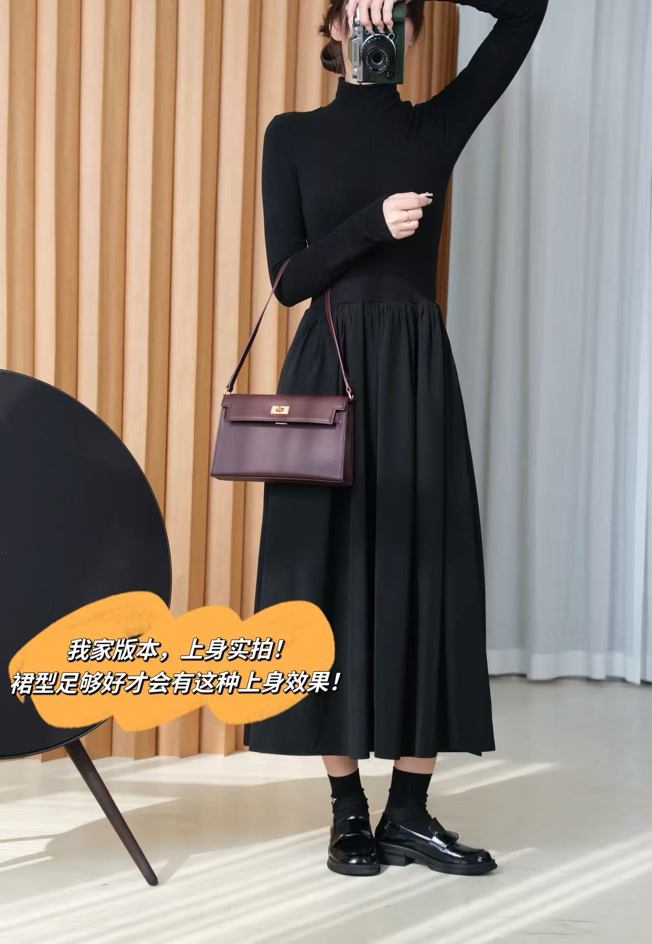 【王炸小黑裙】设计感中线半高领小黑裙 优质拉绒针织面料➕2米仿缎面裙摆 立体裁片,穿出小蛮腰
