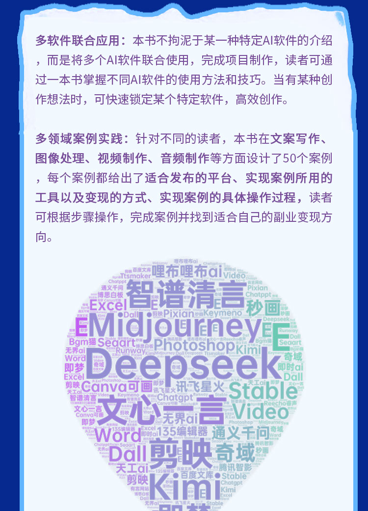 | 《玩赚AI人工智能副业与创业变现实践(微课视频版)》是一本系统介绍人工智能时代,AI在创业或副业变现方面的应用实践指南,旨在为想通过AI改变生活的读者提供一个实践的思路。《玩赚AI人工智能副业与创业变现实践(微课视频版)》共5章,分别讲解了AI在文案写作、图像处理、视频创作、音频制作等方面的应用。通过丰富的实例和详尽的讲解,带领读者进行各种尝试,帮助读者理解AI应用的核心逻辑并找到适合自己的创业或副业方向,可操作性很强。《玩赚AI人工智能副业与创业变现实践(微课视频版)》不仅是一本技能教程,更是一本创意启发书,还配有视频讲解,适合生活在AI时代的创意工作者(如设计师)、职场办公人员、大学生群体,以及所有自媒体从业者参考学习。 |