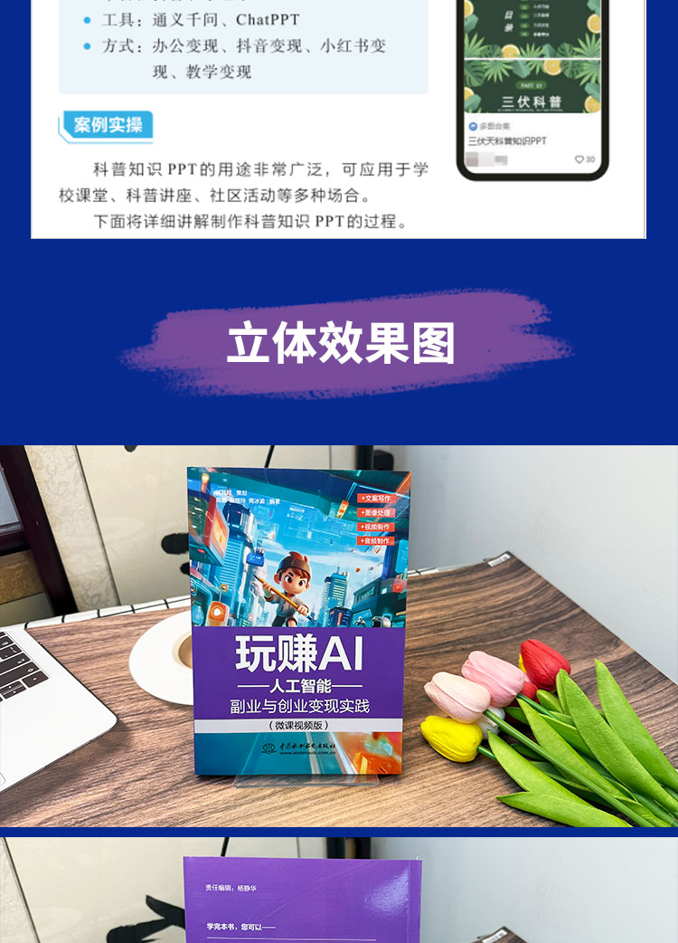 | 这是一本为AI零基础读者编写的 AI;创富实战手册 ,本书通过应用不同的AI软件,带你进行不同领域的AI实践尝试,帮你打开思路,探索出一条适合自己的AI副业/创业赚钱的方向,增加收入,改善生活。场景覆盖全面,总有一款适合你:本书深入文案、图像、视频、音频四大核心创作领域,详细介绍50个AI实践案例。从写爆文、做设计、剪视频到克隆语音、做PPT,无论你的兴趣在哪里,都可以跟随本书进行尝试,一步步找到适合自己的AI致富方向。注重实操,一步一图学得会:每一节都是一个完整的案例实践。想靠小红书文案带货?想用AI模特省下万元拍摄成本?想做小说推文赚取佣金?书中一步步带你操作,结合附赠的微课视频,真正做到即学即用,让AI成为你最听话的;赚钱员工。聚焦风口,抓住AI创业红利:内容紧跟市场需求,涵盖数字人直播、AI配音、文创设计、UI设计等前沿领域。让你不仅学到技术,更能洞察行业先机。适合所有渴望改变的普通人:无论你是寻求副业的上班族、成本敏感的个体创业者、还是渴望转型的内容创作者或学生,本书提供的都是;低门槛、高回报的解决方案。你不需要是技术专家,只需要一份改变的勇气,就可以尝试,力求把AI变成你的24小时盈利部门。 |