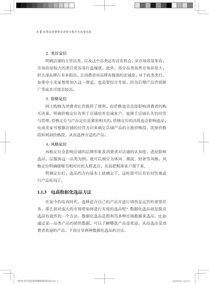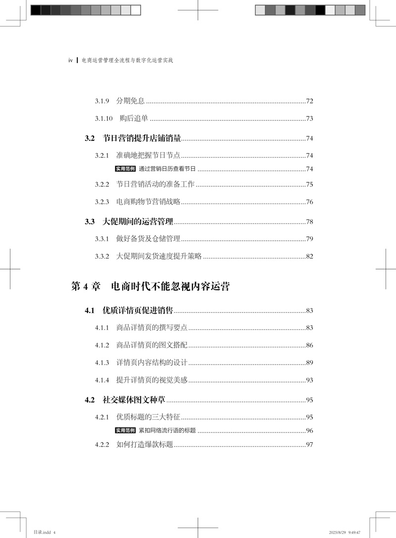这是一本专门介绍电商运营管理和数字化运营实战的工具书,全书可分为三部分:第一部分为本书的基础入门内容,涵盖电商的经营模式、电商运营的整体思维、电商运营的常用策略等。通过这部分内容,能够帮助读者快速了解电商运营。第二部分为电商运营管理实务内容,包含产品运营、文案设计技能、内容策划、粉丝引流等。借助这部分内容,可以帮助读者掌握电商运营环境中的实操技能,做好运营管理工作。第三部分为电商运营的数字化运营实战内容,涉及流量数据的监管与分析、用户量化运营、市场行业洞察等。通过这部分内容,能够助力读者从量化的角度开展运营推广和决策指导,让运营工作更具依据。本书内容实用,涉及电商运营的常规运营管理实务及数据量化管理两个方面,不仅有方法、技巧、经验分享等干货,还包括量化实操指导。讲解过程中,大量穿插实例分析和演示,力求降低读者的学习难度,使其更高效、快速地掌握相关内容。