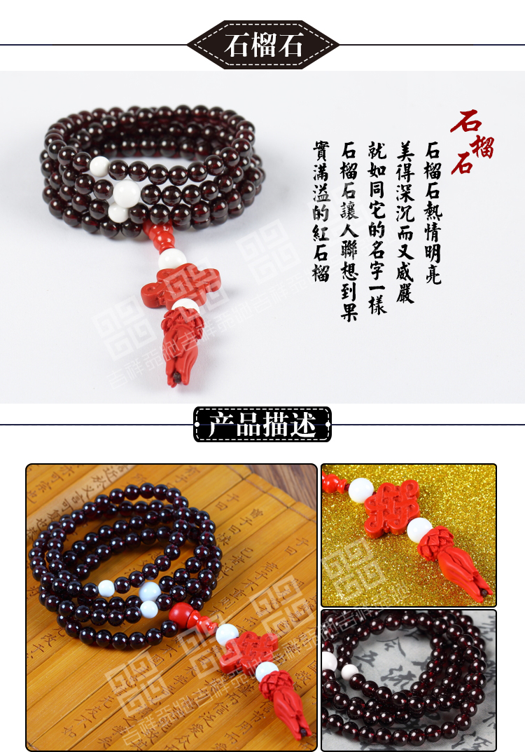 吉祥天地 天然水晶酒红石榴石手链 南红配珠女款多圈