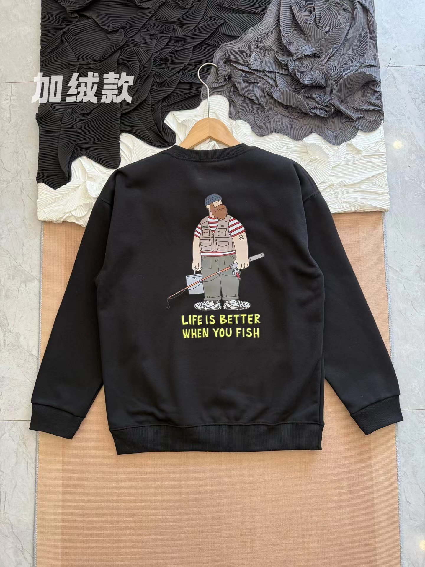 钓鱼达人印花logo 加绒圆领长袖卫衣,面料方面:精选300g高支棉混纺材质,亲肤柔软,兼顾透气与保暖性能,适合春秋日常穿着,也能作为冬季内搭。面料耐磨耐洗,不易变形,持久保持挺括感。工艺细节:采用精密双针走线工艺,整体版型利落干净,领口袖口及下摆螺纹收口设计,增强贴合度与耐用性,细节处彰显品质。舒适亲肤的高品质棉混纺面料,耐穿不易变形,适合日常高频率穿搭,圆领+螺纹收口,版型挺括不挑人,百搭时尚,轻松演绎运动休闲风,一件卫衣即可满足通勤、休闲、户外多场景穿搭,真正的衣橱b备单品。