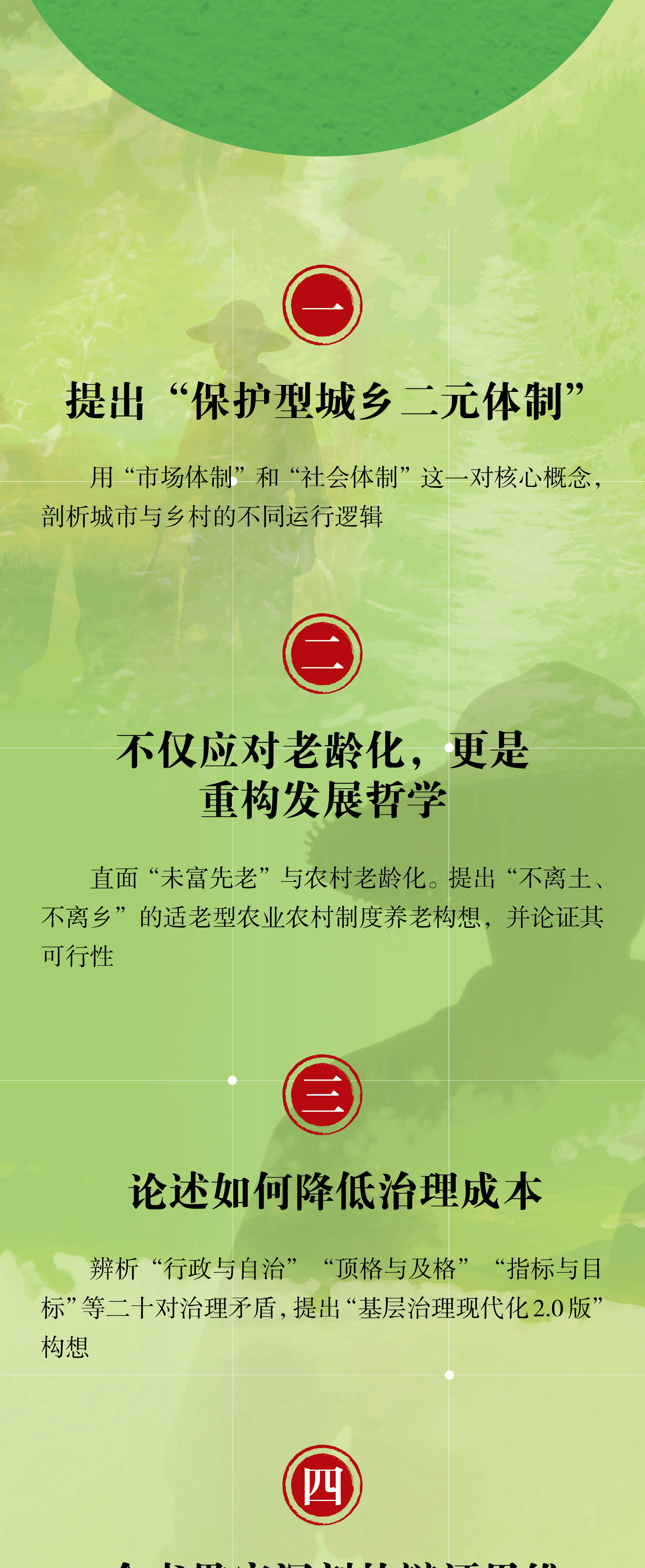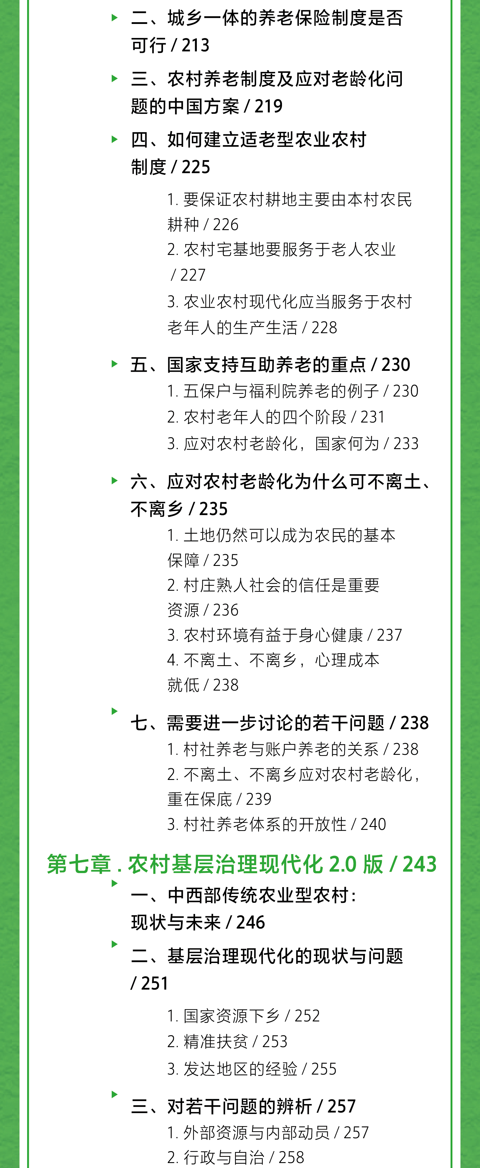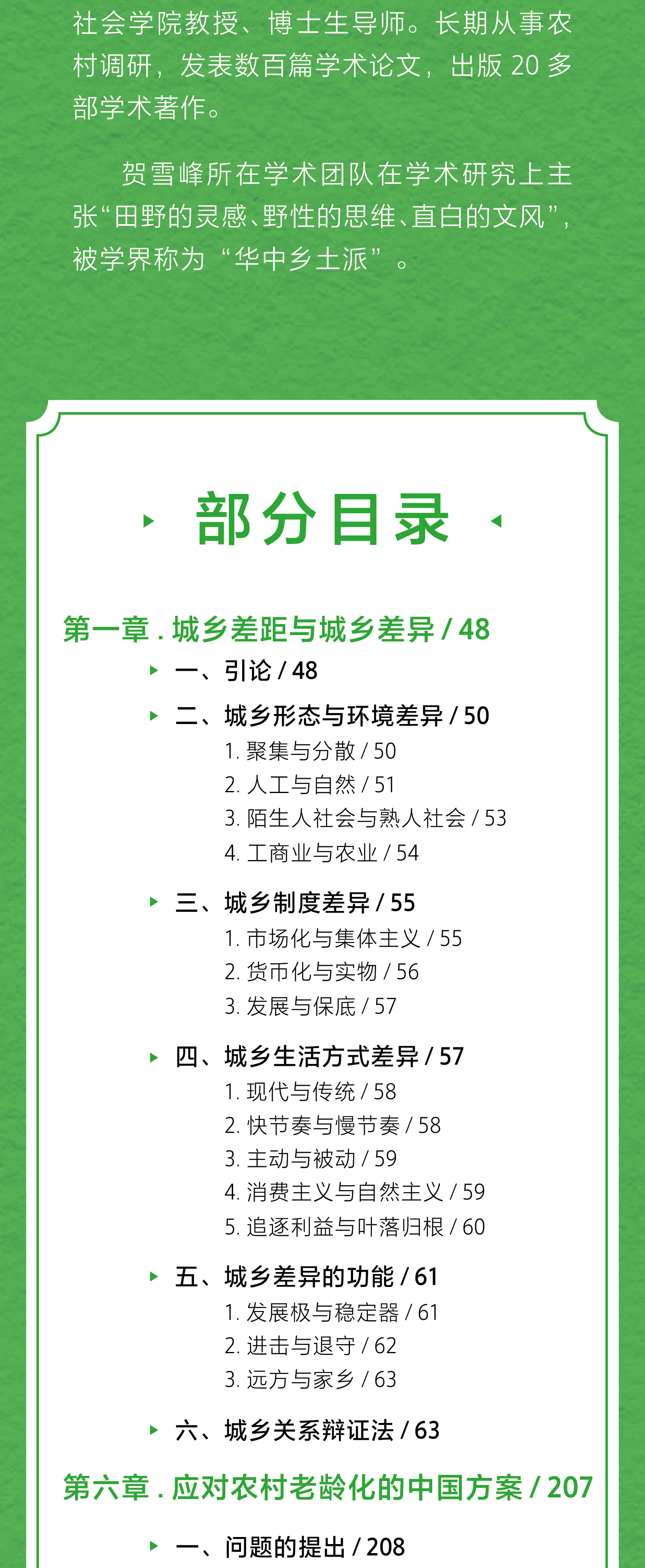 内容简介 本书以“三轮驱动的中国现代化”为总体框架,从农民的角度,系统剖析了中国现代化进程的核心动力与关键挑战。 本书深刻辨析了城市和农村在形态、制度与生活方式上的本质差异,指出城市和农村是功能互补的有机体,“三农”问题的核心是保障粮食安全和农民的基本生活与退路。集体土地所有制、熟人社会等与市场机制共同构成了农村发展的基础。城市作为“发展极”,承担创新与增长功能;农村作为“稳定器”和“蓄水池”,为社会提供缓冲,赋予韧性。为应对农村老龄化这一紧迫挑战,作者基于多年的田野调查,提出“建立适老型农业农村制度”的中国方案。承认城乡差异,防止城乡差距扩大,是实现共同富裕的途径之一。 全书蕴含深刻的辩证思维,在城市与农村、沿海与内地、市场与社会、及格与顶格、大概率与小概率、先与后等内含的张力中寻求动态平衡,为理解当代中国提供了一个具有整体性、前瞻性且富有现实关怀的理论框架。 作者介绍 1968 年生,湖北荆门人,现为武汉大学中国乡村治理研究中心主任,武汉大学社会学院教授、博士生导师。长期从事农村调研,发表数百篇学术论文,出版 20多部学术著作。 贺雪峰所在学术团队在学术研究上主张“田野的灵感、野性的思维、直白的文风”,被学界称为“华中乡土派”。 目录 总论.中国现代化的中长期前景及对策 / 1 一、中国现代化的中长期前景 / 2 二、“三轮驱动的中国现代化”/ 4 三、中国现代化必须重视的若干基本方面 / 10 1.坚持科教兴国 / 11 2.充分发挥市场的作用 / 12 3.搞好社会建设 / 14 4.降低治理成本 / 16 5.防止浮财 / 18 6.保证粮食安全 / 21 7.有效应对“未富先老”的挑战 / 24 8.防止过度经营县城 / 26 9.防止乡村振兴中的激进主义 / 29 四、对若干问题的辨析 / 32 1.先与后 / 33 2.城市与乡村 / 35 3.市场与社会 / 37 4.沿海与内地 / 39 5.大概率与小概率 / 41 6.及格与顶格 / 42 7.基尼系数 / 43 8.没有无缘无故的财富 / 44 9.收权与放权 / 46 第一章.城乡差距与城乡差异 / 48 一、引论 / 48 二、城乡形态与环境差异 / 50 1.聚集与分散 / 50 2.人工与自然 / 51 3.陌生人社会与熟人社会 / 53 4.工商业与农业 / 54 三、城乡制度差异 / 55 1.市场化与集体主义 / 55 2.货币化与实物 / 56 3.发展与保底 / 57 四、城乡生活方式差异 / 57 1.现代与传统 / 58 2.快节奏与慢节奏 / 58 3.主动与被动 / 59 4.消费主义与自然主义 / 59 5.追逐利益与叶落归根 / 60 五、城乡差异的功能 / 61 1.发展极与稳定器 / 61 2.进击与退守 / 62 3.远方与家乡 / 63 六、城乡关系辩证法 / 63 第二章.现代化视野下的乡村振兴战略 / 66 一、“三农”问题的本质 / 66 1.粮食安全 / 75 2.谁是农民 / 79 3.农民的基本保障与最后退路 / 84 二、作为社会制度组成部分的农村 / 86 1.集体土地所有制 / 88 2.传统村社熟人社会 / 89 3.自然经济 / 90 三、保护型城乡二元体制 / 94 1.关于农业农村现代化 / 96 2.关于城乡差距 / 98 3.关于“农业强、农村美、农民富”/ 99 四、实践中需要调整的地方 / 100 1.关于土地制度 / 101 2.一二三产业融合与产业兴旺 / 103 第三章.市场 -社会二元体制模型与“三农”政策 / 107 一、当前“三农”政策的根本 / 109 二、作为社会体制承载平台的农业农村与农民中的弱势群体 / 116 三、当前“三农”政策的辩证 / 120 1.农业政策 / 120 2.农村产业政策 / 124 3.美丽乡村建设政策 / 128 4.农地制度与小农户经济 / 130 5.土地制度与“三块地”改革 / 133 6.发展县域经济 / 137 7.应对农村老龄化 / 140 8.基层治理问题 / 143 四、当前“三农”政策研究中应当注意的方法问题 / 148 1.整体与部分 / 149 2.长远与短期 / 149 3.战略与策略 / 150 4.目标与指标 / 151 5.一般与特殊 / 151 6.主要矛盾与矛盾的主要方面 / 152 7.市场与社会 / 152 第四章.农村发展中的市场制度与社会制度 / 154 一、关于土地制度改革和农民财产权 / 155 二、关于城乡融合与城乡要素流动 / 160 三、农业人口市民化与县域城镇化 / 165 四、市场制度与社会制度的平衡 / 168 第五章.建立适老型农业农村制度 / 172 一、谁来种地 / 172 二、对“三农”政策的分析 / 181 1.乡村振兴战略 / 181 2.农业农村现代化 / 184 3.农业强国 / 186 三、一些地方实践 / 187 1.支持新型农业经营主体 / 189 2.小田并大田 / 190 3.高标准农田整治 / 191 4.村庄环境整治 / 192 5.宅基地整治 / 193 6.高要求的标准化 / 193 7.指标化 / 194 8.乡村振兴示范村和示范带 / 195 9.农民工返乡 / 196 10. 建立土地流转市场,签订规范土地流转合同 / 196 四、如何构建适老型农业 / 198 1.限制资本大户下乡与农民争抢土地 / 199 2.“一刀切”式地要求土地流转正规化、合同化不可取 / 200 3.防止站在地租食利者角度想问题 / 201 4.“小田并大田”工作的当务之急是解决土地细碎化问题 / 202 5.农田水利也是大问题 / 202 6.要为小农户提供完善的社会化服务 / 203 7.乡村治理的主要工作是群众工作 / 203 第六章.应对农村老龄化的中国方案 / 207 一、问题的提出 / 208 二、城乡一体的养老保险制度是否可行 / 213 三、农村养老制度及应对老龄化问题的中国方案 / 219 四、如何建立适老型农业农村制度 / 225 1.要保证农村耕地主要由本村农民耕种 / 226 2.农村宅基地要服务于老人农业 / 227 3.农业农村现代化应当服务于农村老年人的生产生活 / 228 五、国家支持互助养老的重点 / 230 1.五保户与福