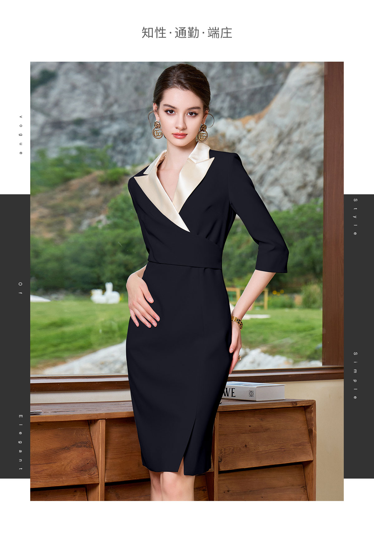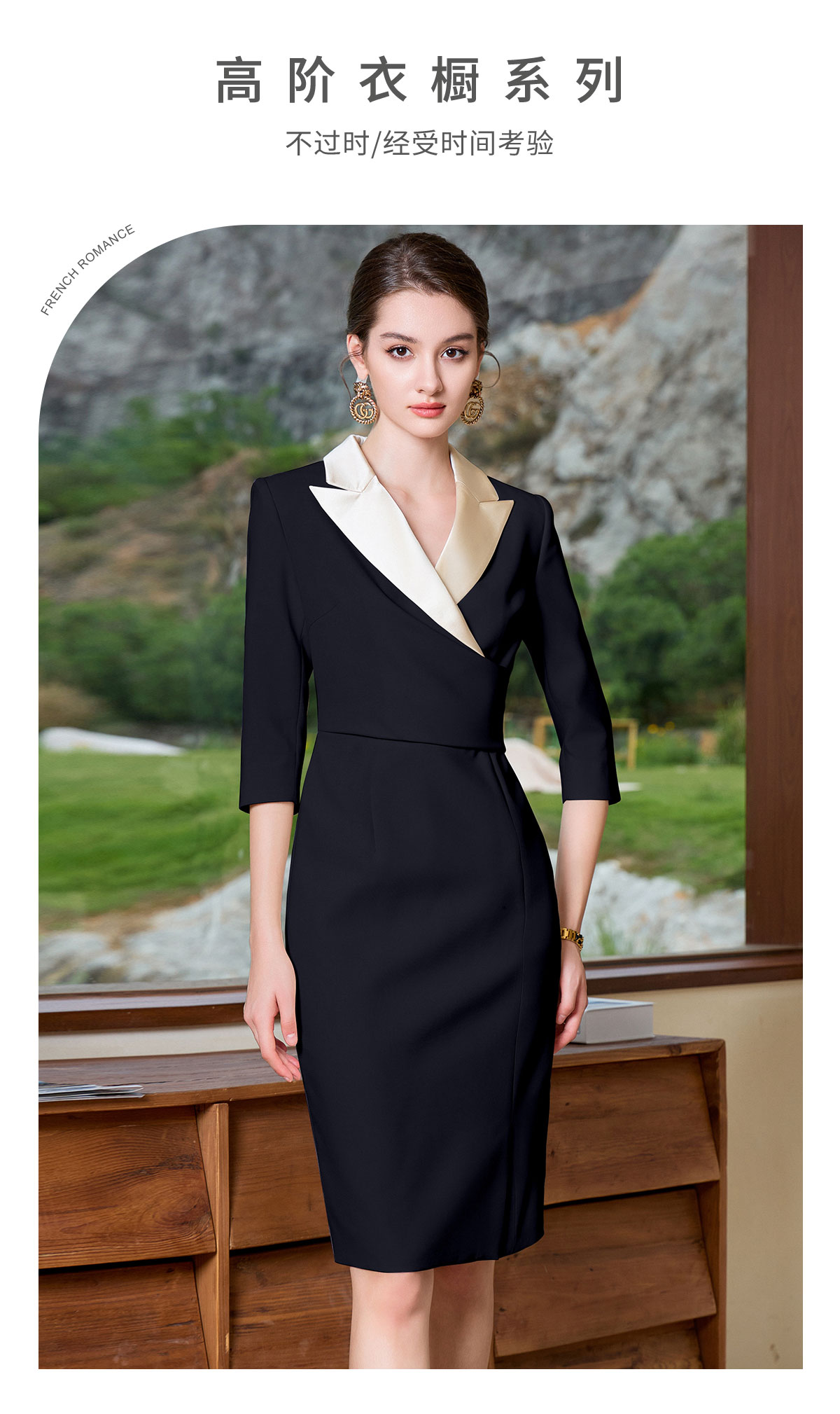 AD高冷御姐风连衣裙女香槟色接拼黑色西装裙气质中袖收腰包臀裙子