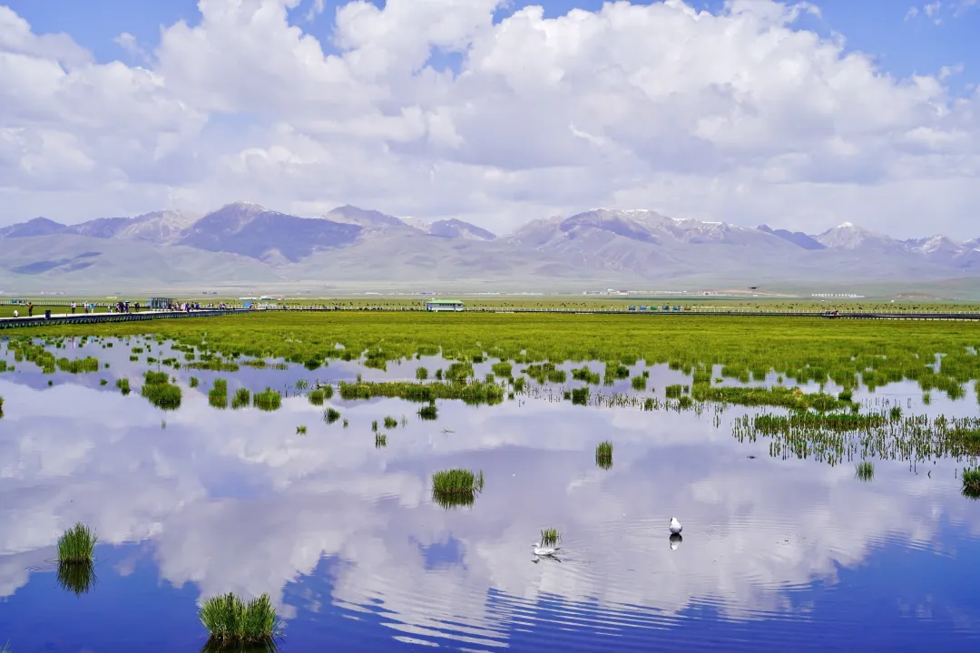 今天我们早起,前往【阿万仓湿地】(约53km,车程1.5h),这片湿地公园拥有着令人叹为观止的自然景观。辽阔的草原绵延起伏,如绿色的海洋,微风拂过,草浪翻滚,仿佛在诉说着大自然的神秘语言。清澈的河流蜿蜒流淌,如同大地的血脉,滋养着这片生机勃勃的土地。蓝天白云下,远处的雪山皑皑,与近处的草原、河流相互映衬,构成了一幅壮美无比的画卷。