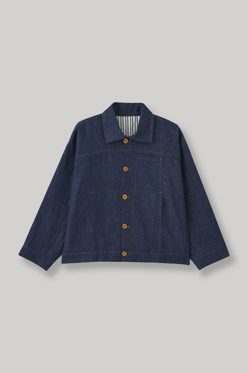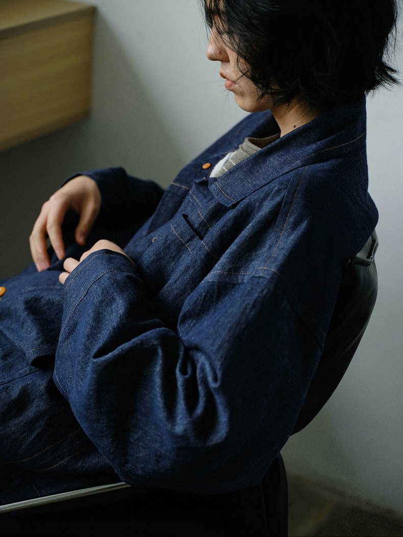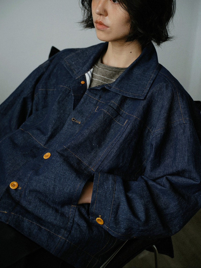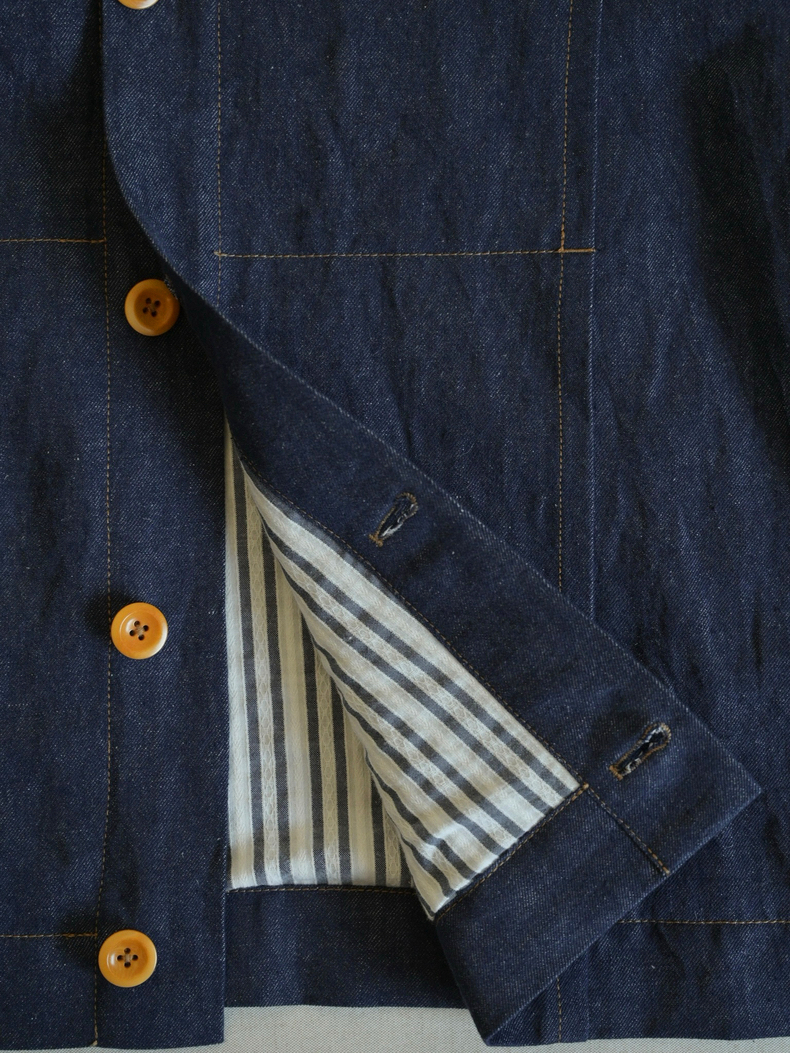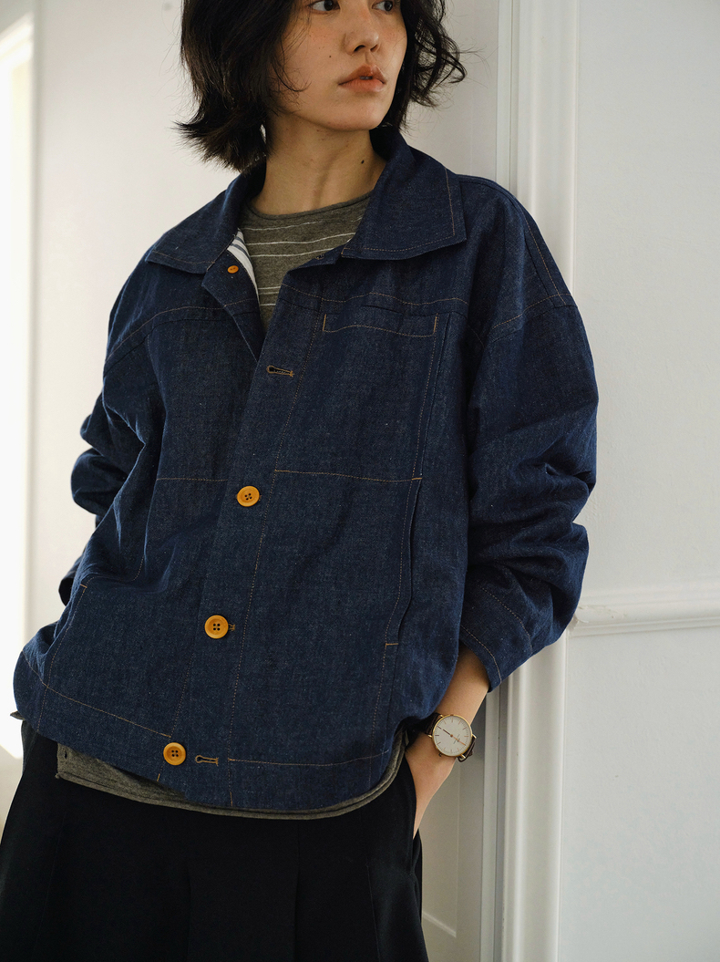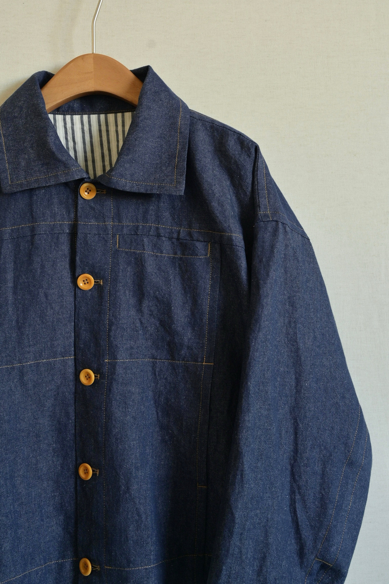 [特价] 进口细支色纺亚麻混纺 辑明线条纹衬廓形宽松牛仔色外套