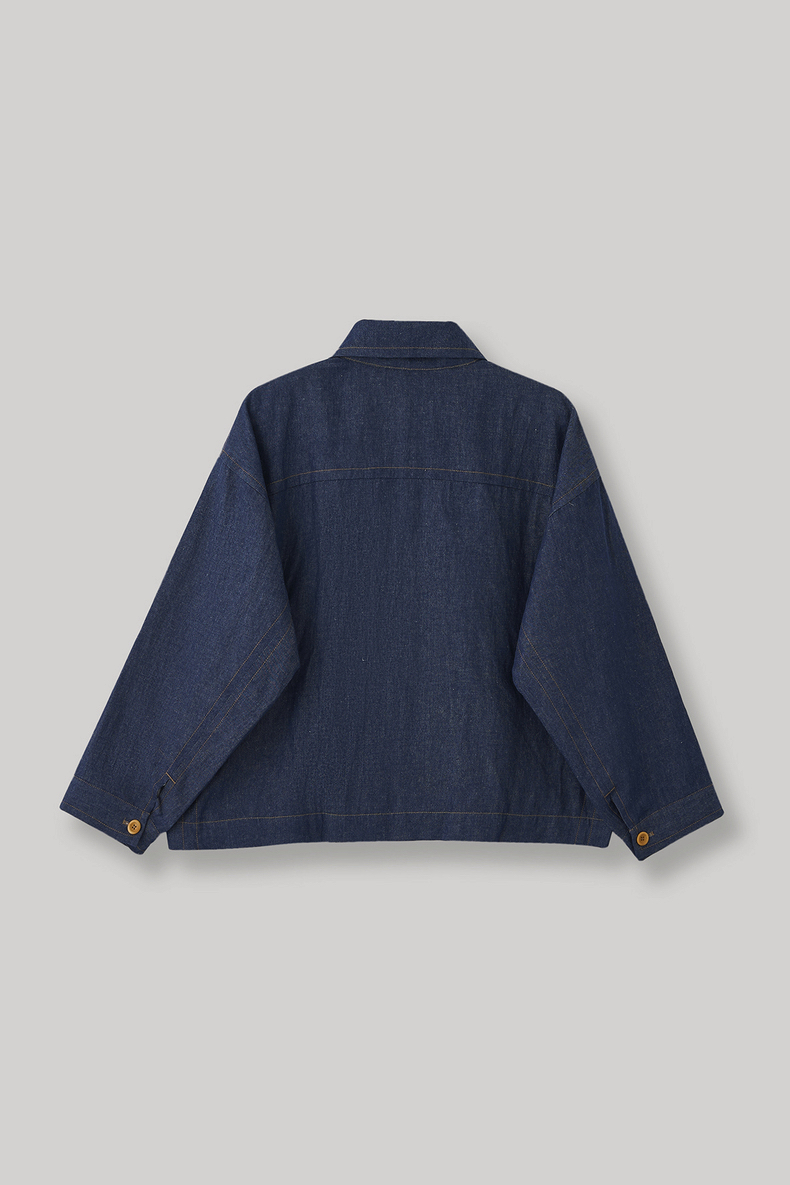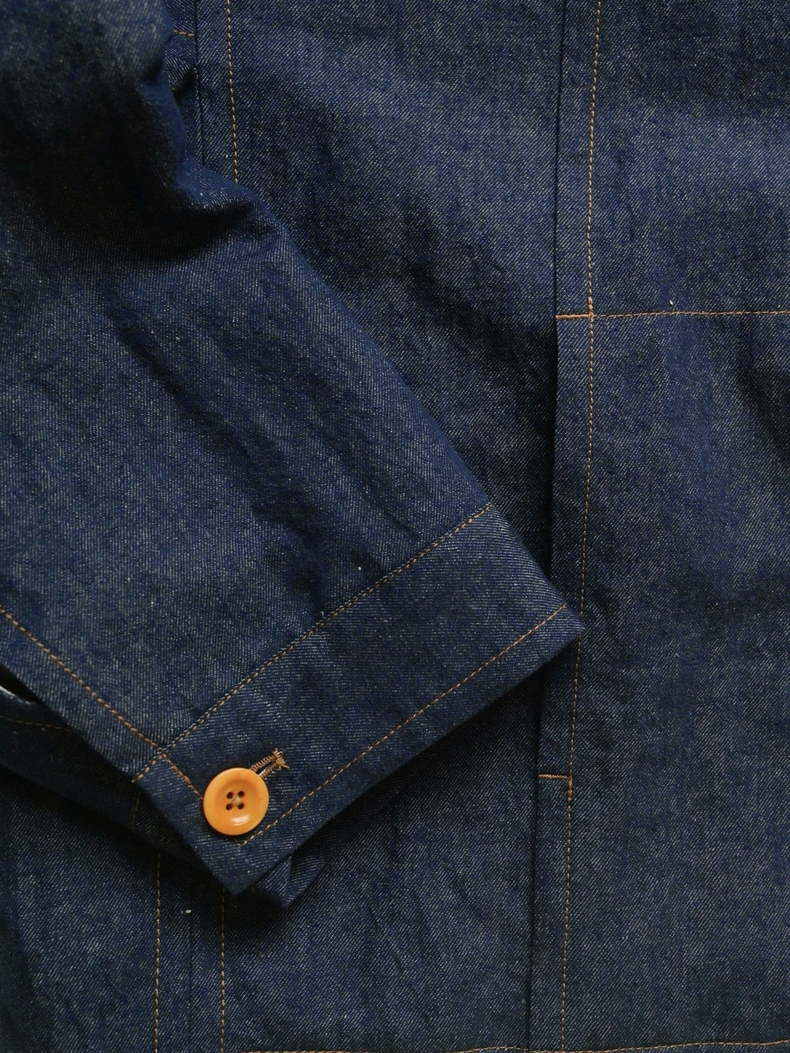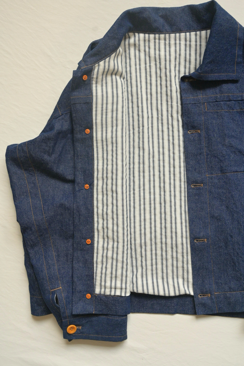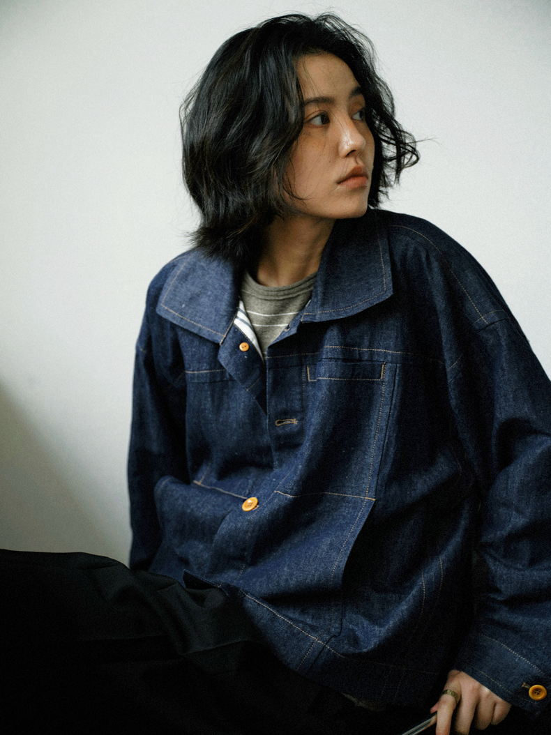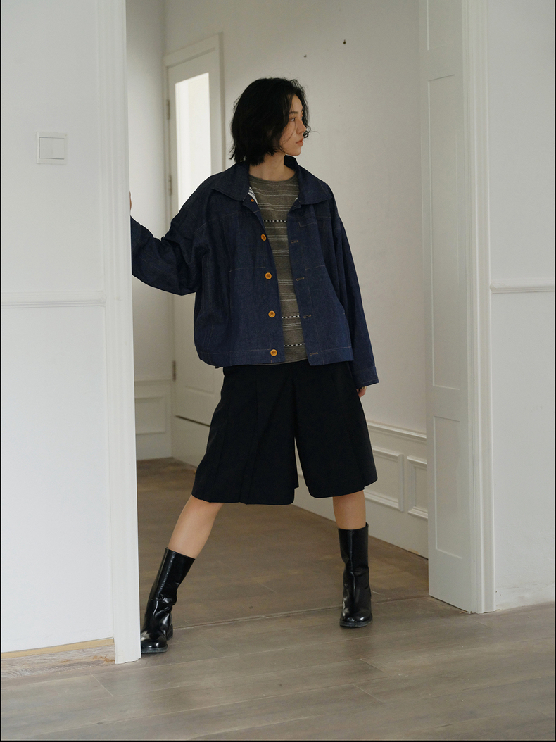 [特价] 进口细支色纺亚麻混纺 辑明线条纹衬廓形宽松牛仔色外套