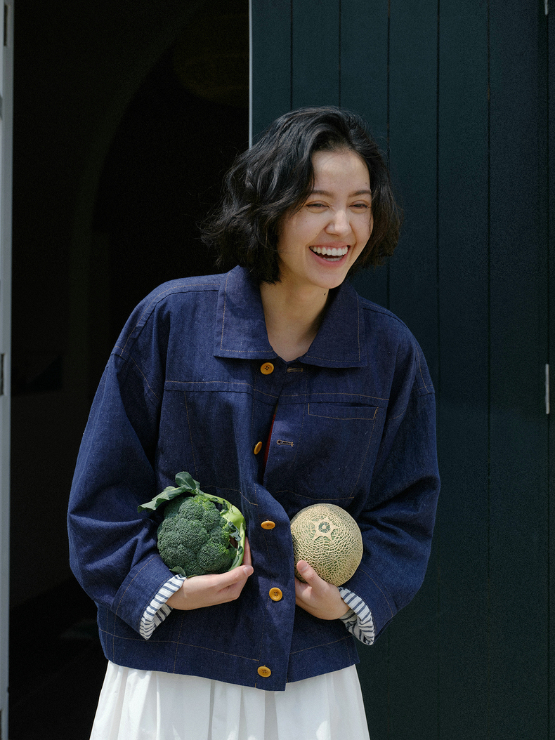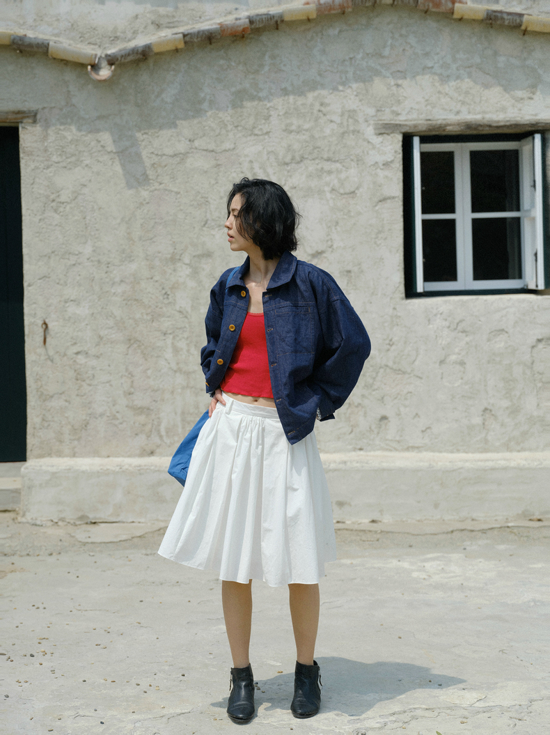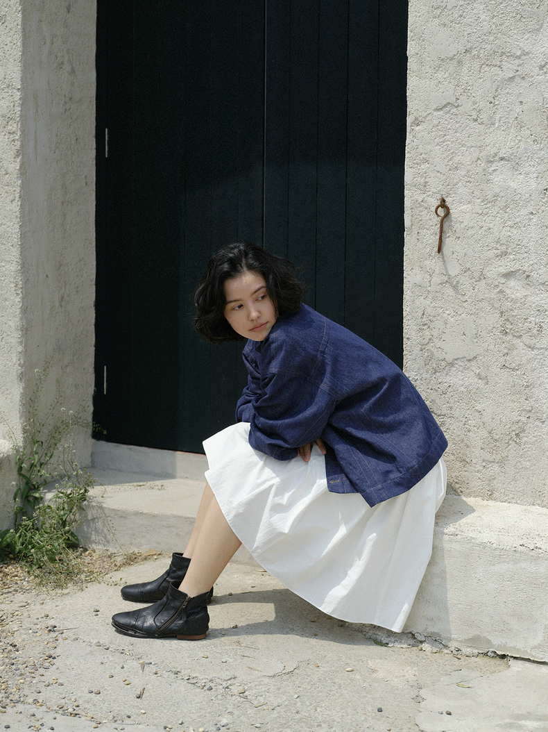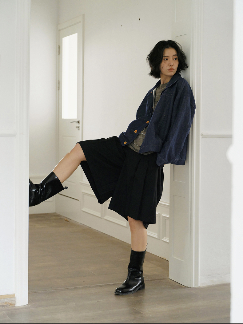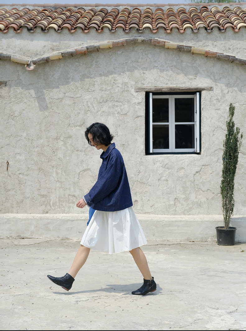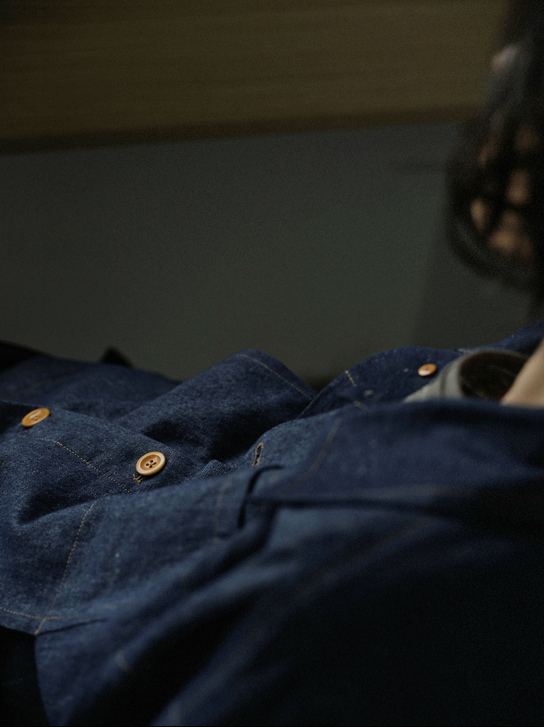 [特价] 进口细支色纺亚麻混纺 辑明线条纹衬廓形宽松牛仔色外套
