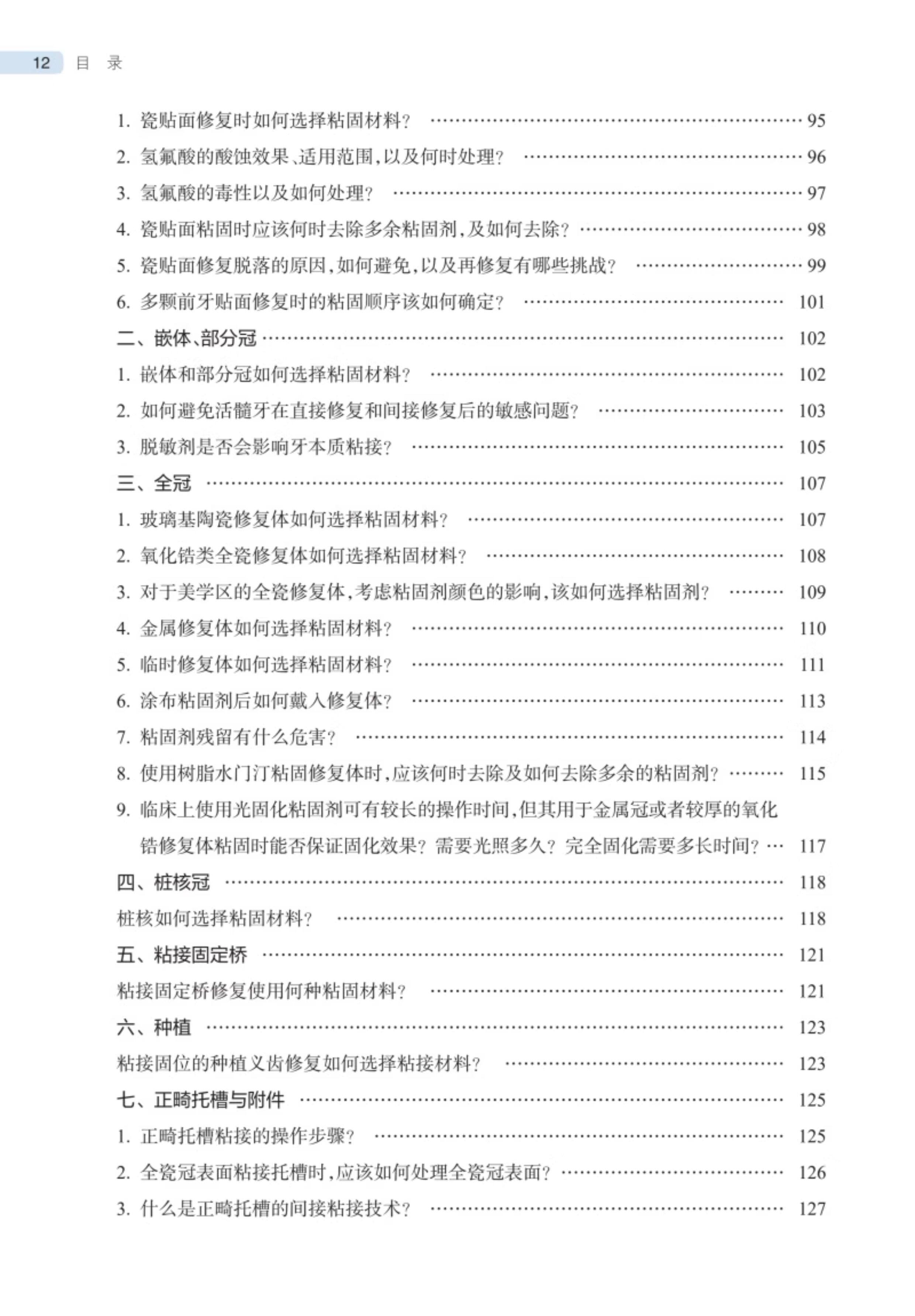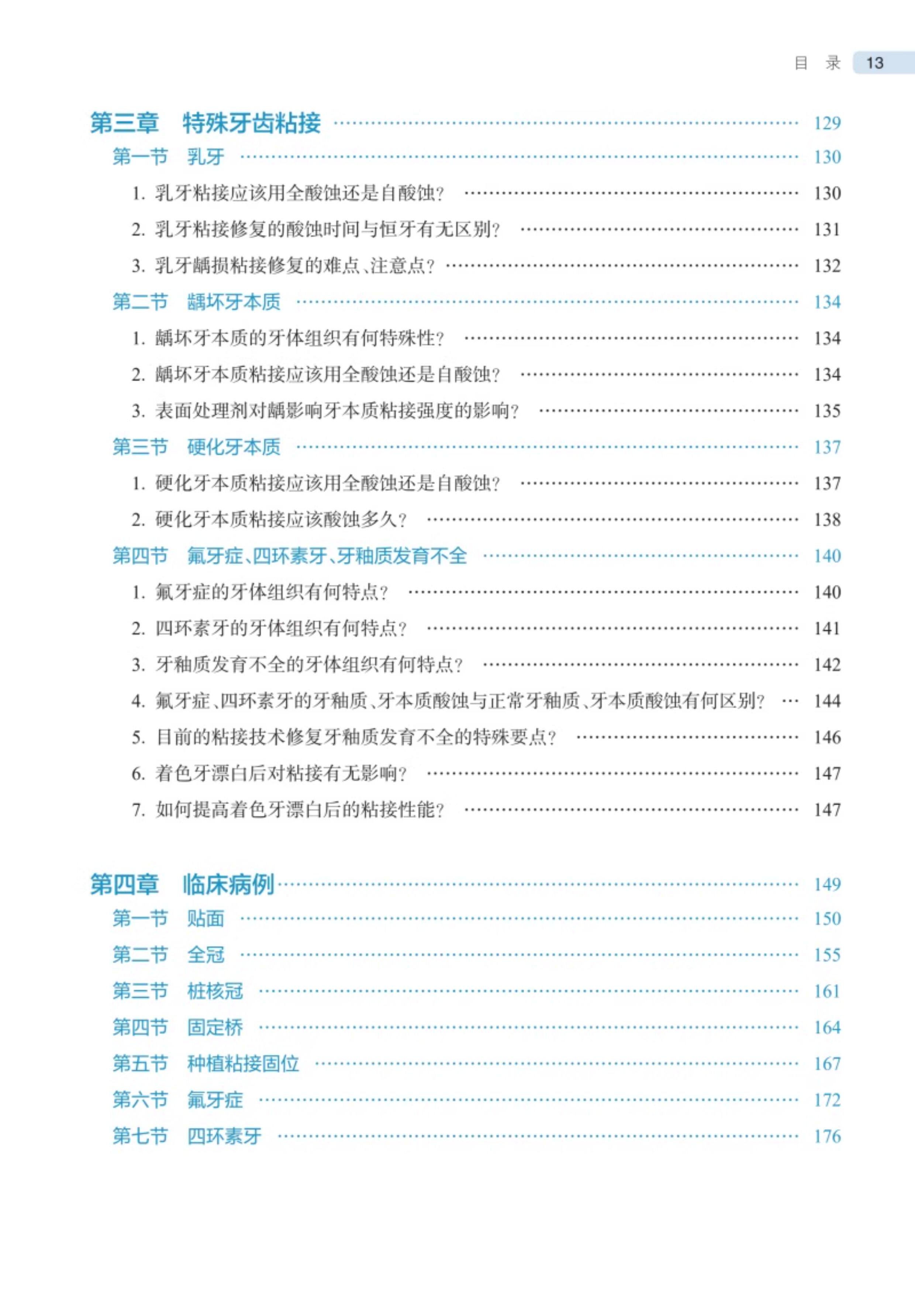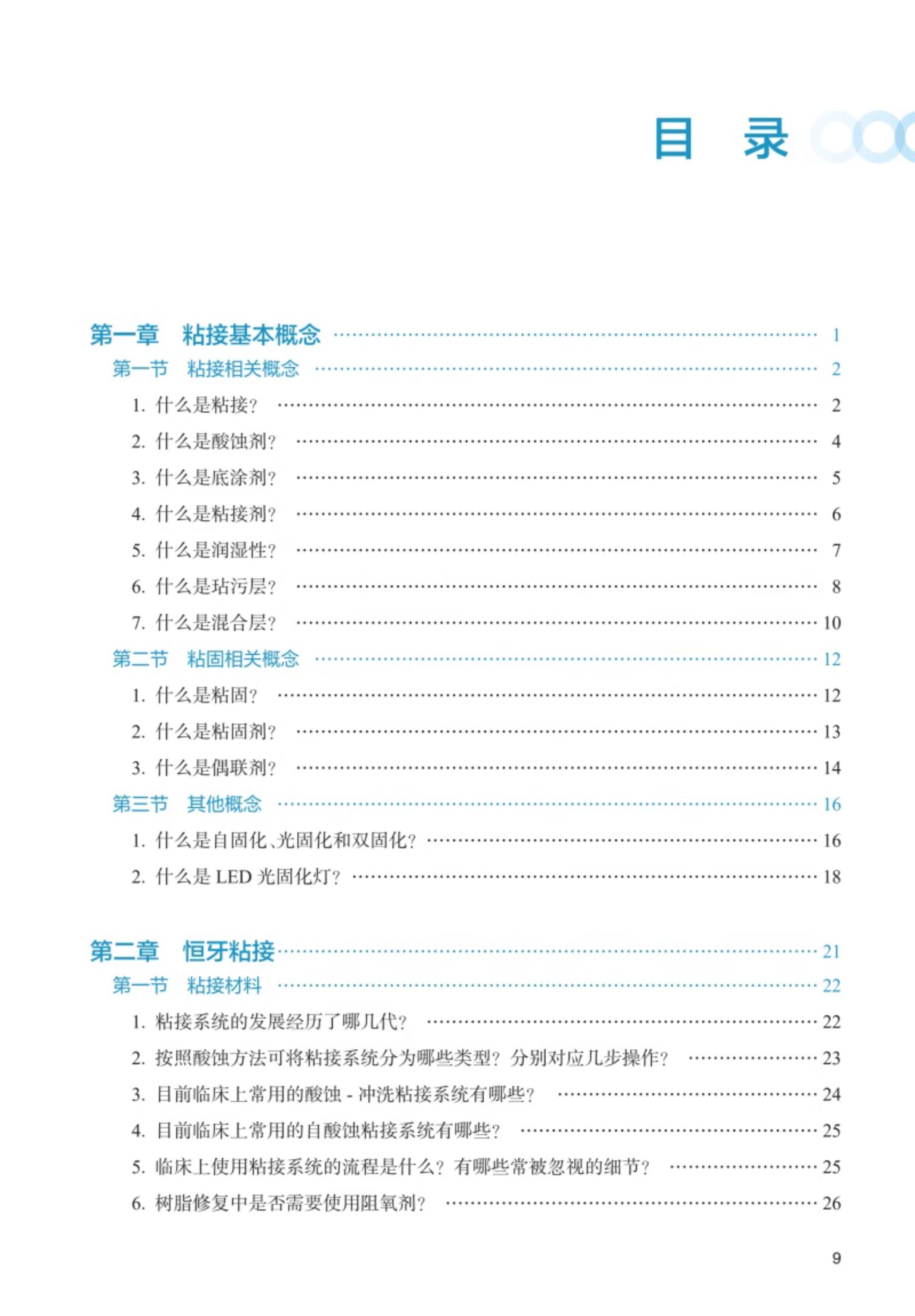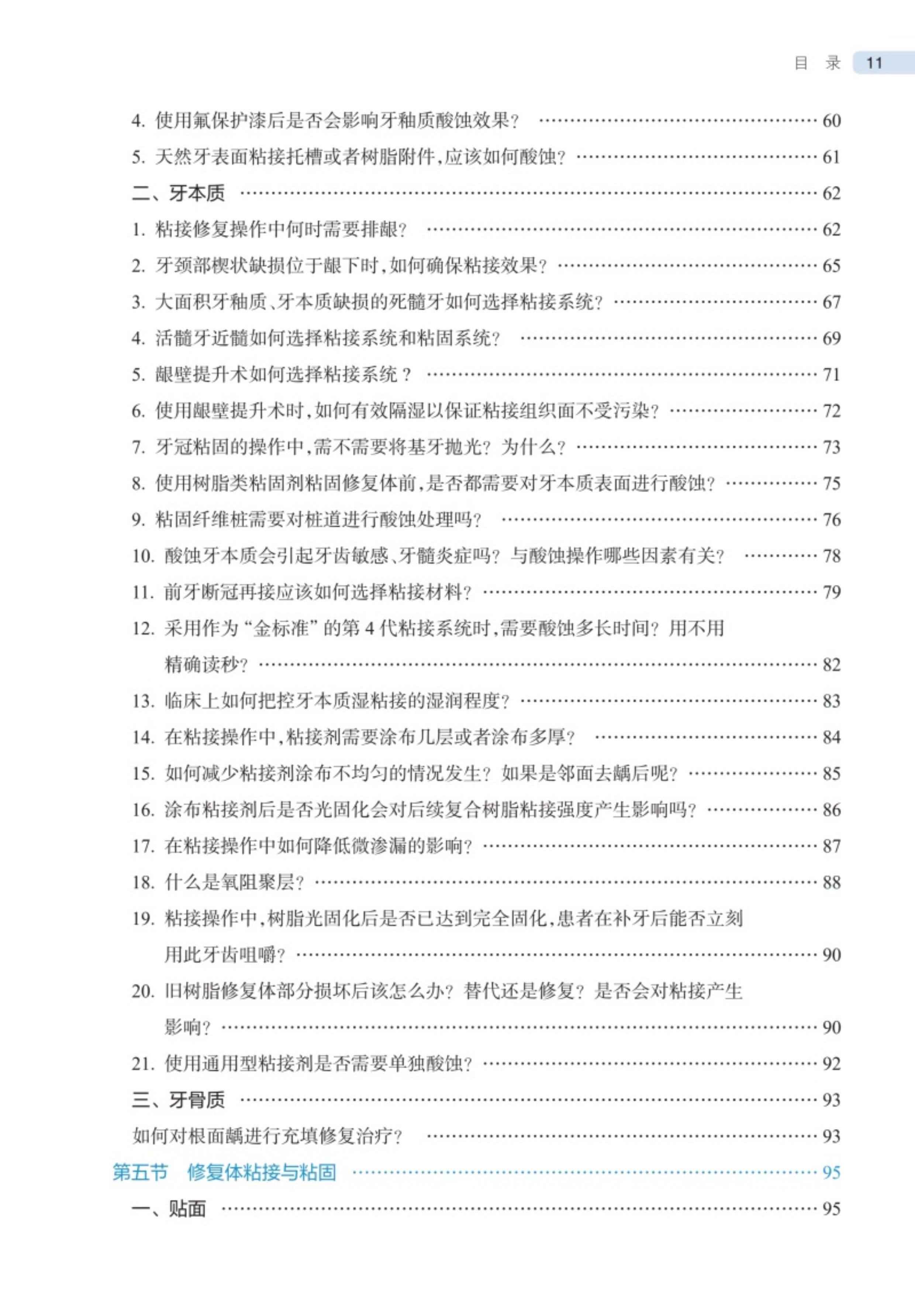 本书共分三篇。第一篇介绍了临床口腔粘接修复中粘接、粘固相关的基本概念;第二篇介绍了口腔粘接材料、技术和使用技巧三方面的共性问题,内容包括粘接材料、粘固材料和通用型粘接剂三类材料,粘接、粘固各类实用技术,牙釉质、牙本质、牙骨质、修复体各界面的处理细节等;第三篇介绍了乳牙、龋坏牙本质、硬化牙本质、氟牙症、四环素牙、牙釉质发育不全等特殊情况下口腔粘接修复的焦点问题。图文并茂、内容深入浅出,一问一答,对医生有较高的指导意义。
