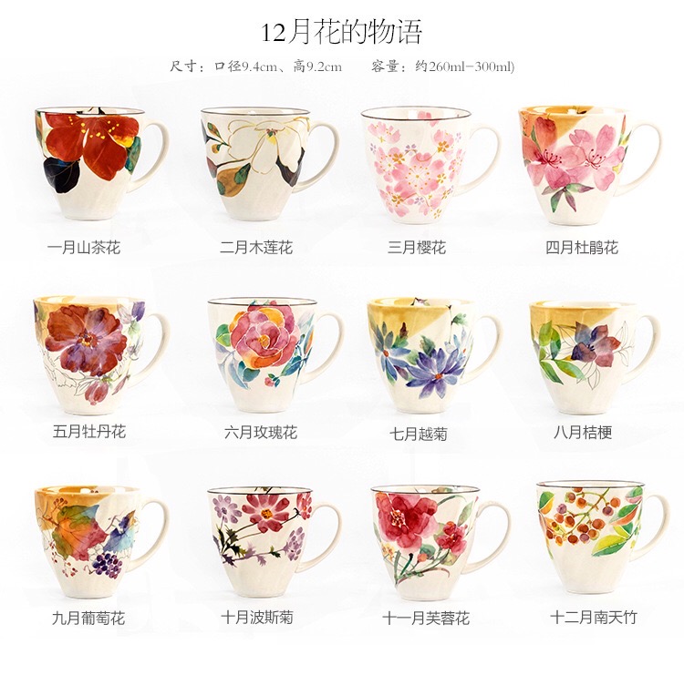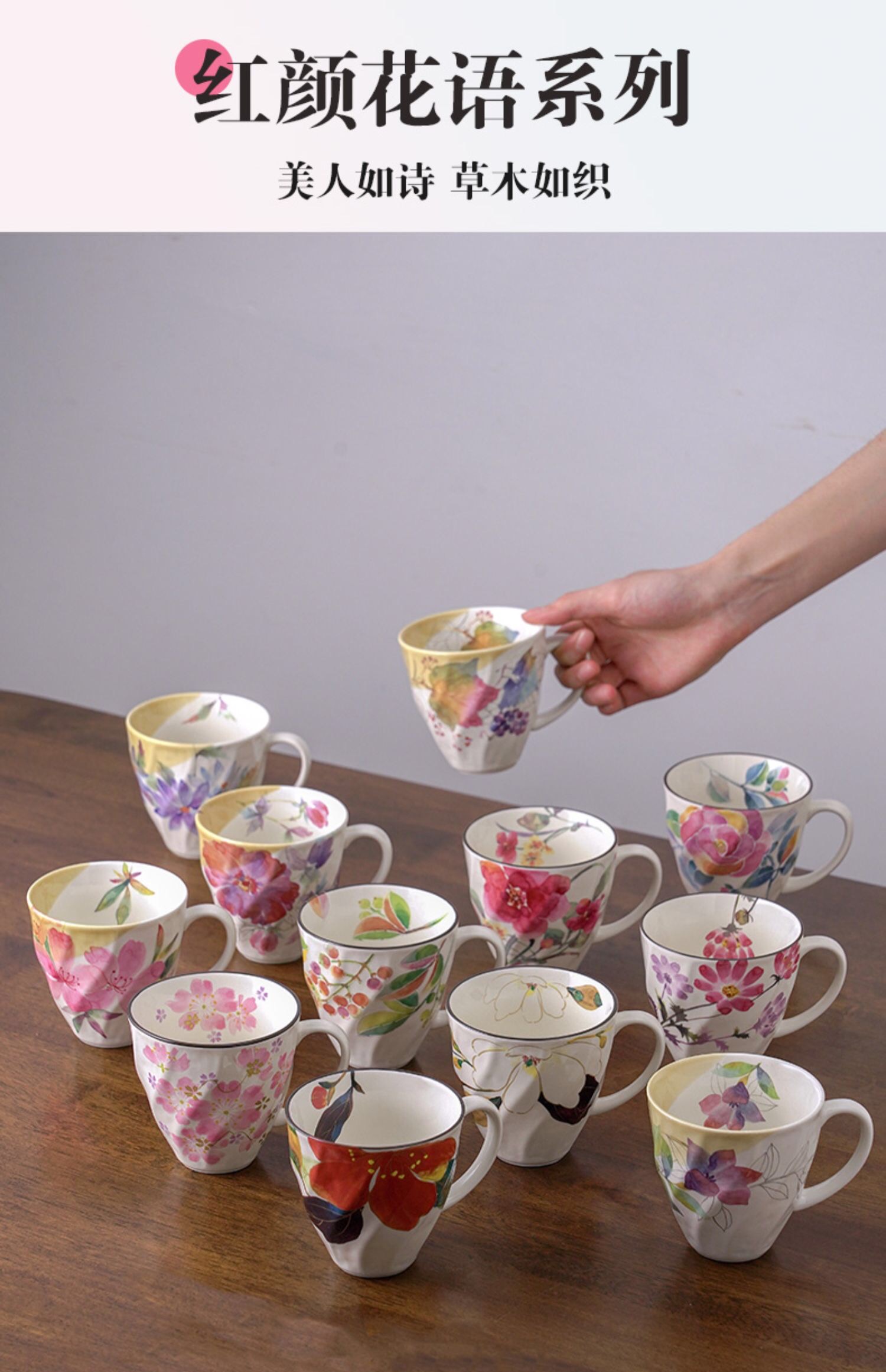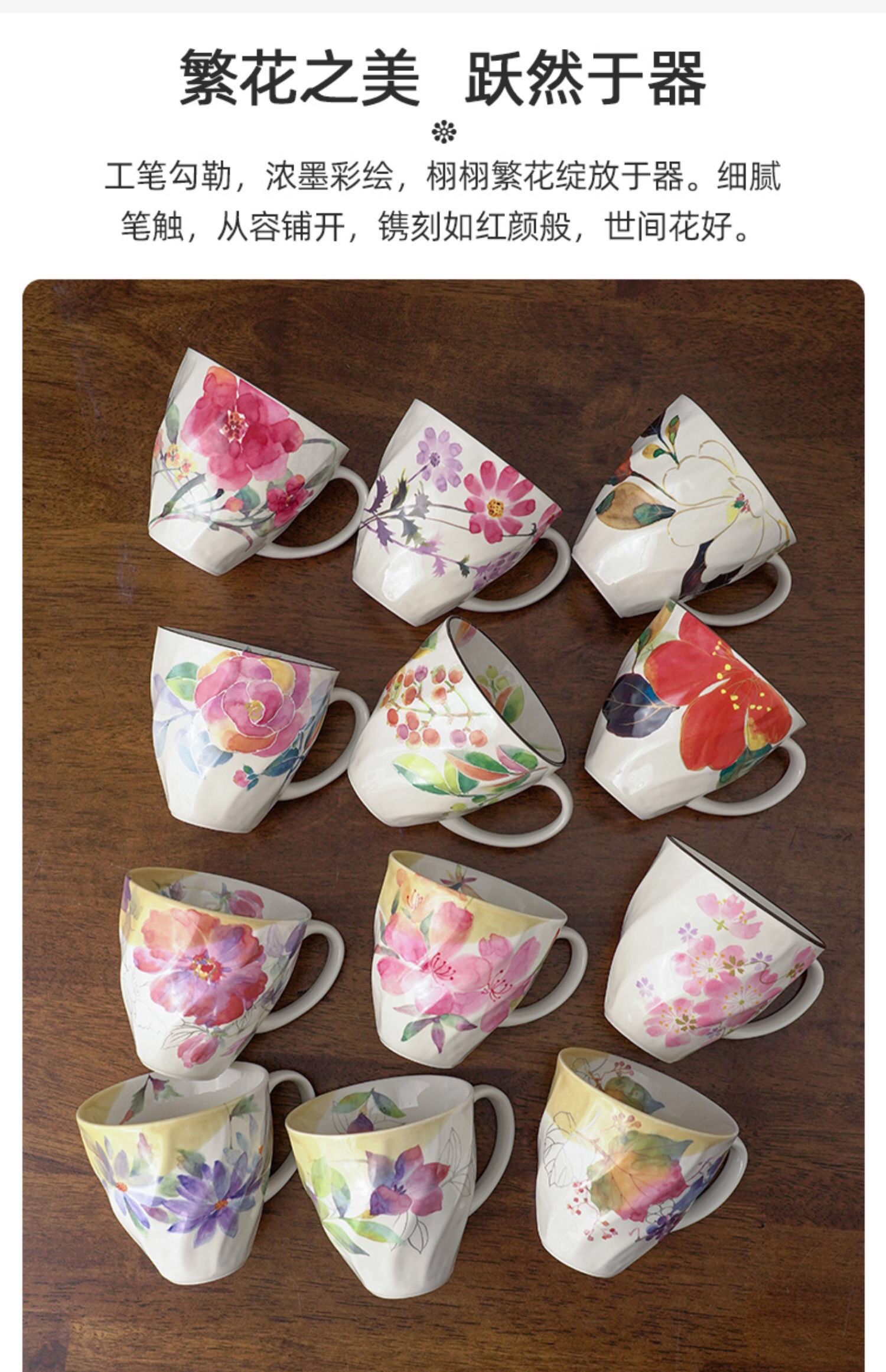 日本美浓烧和蓝陶瓷水彩花卉繁花十二个月花语马克杯子