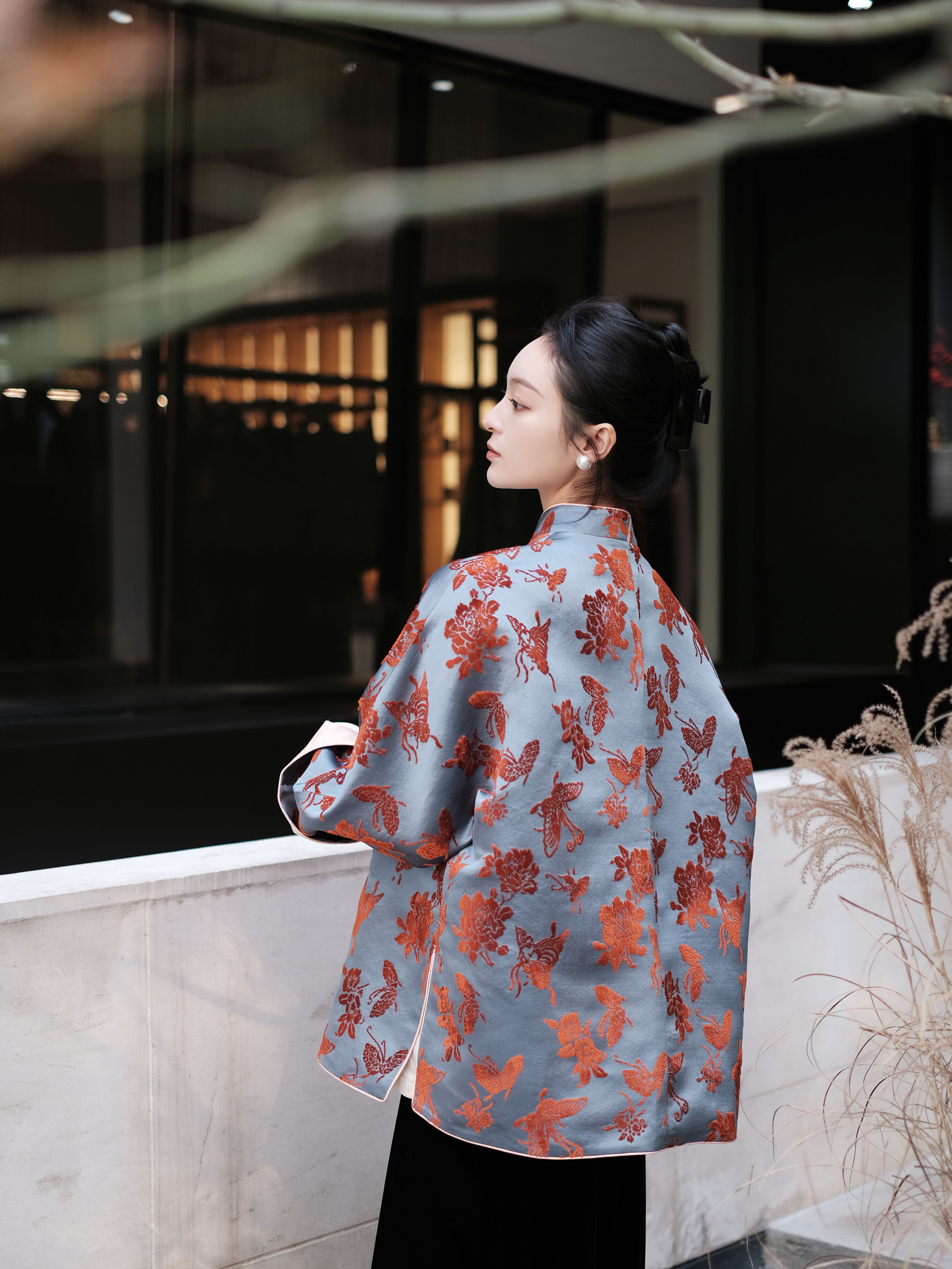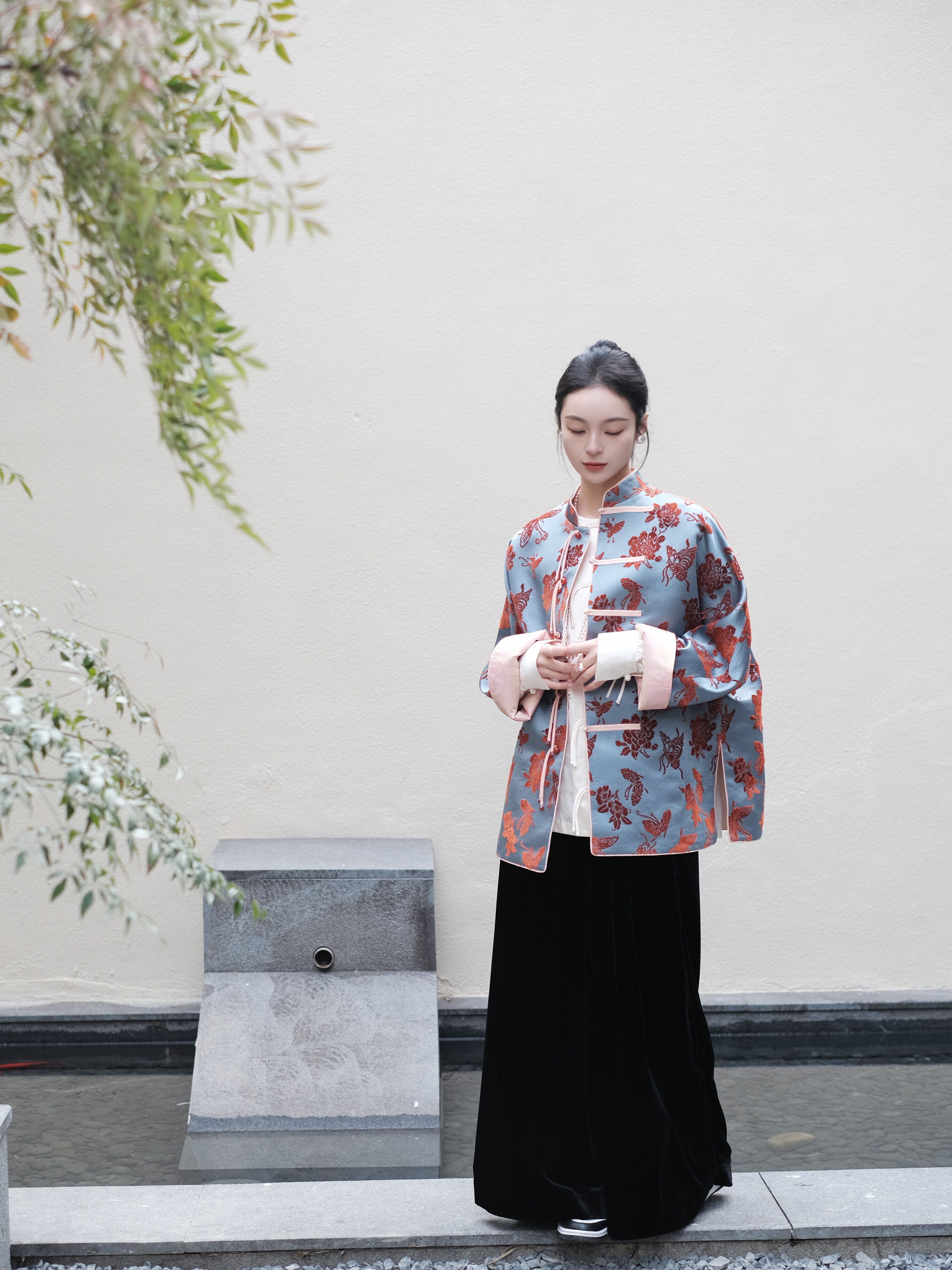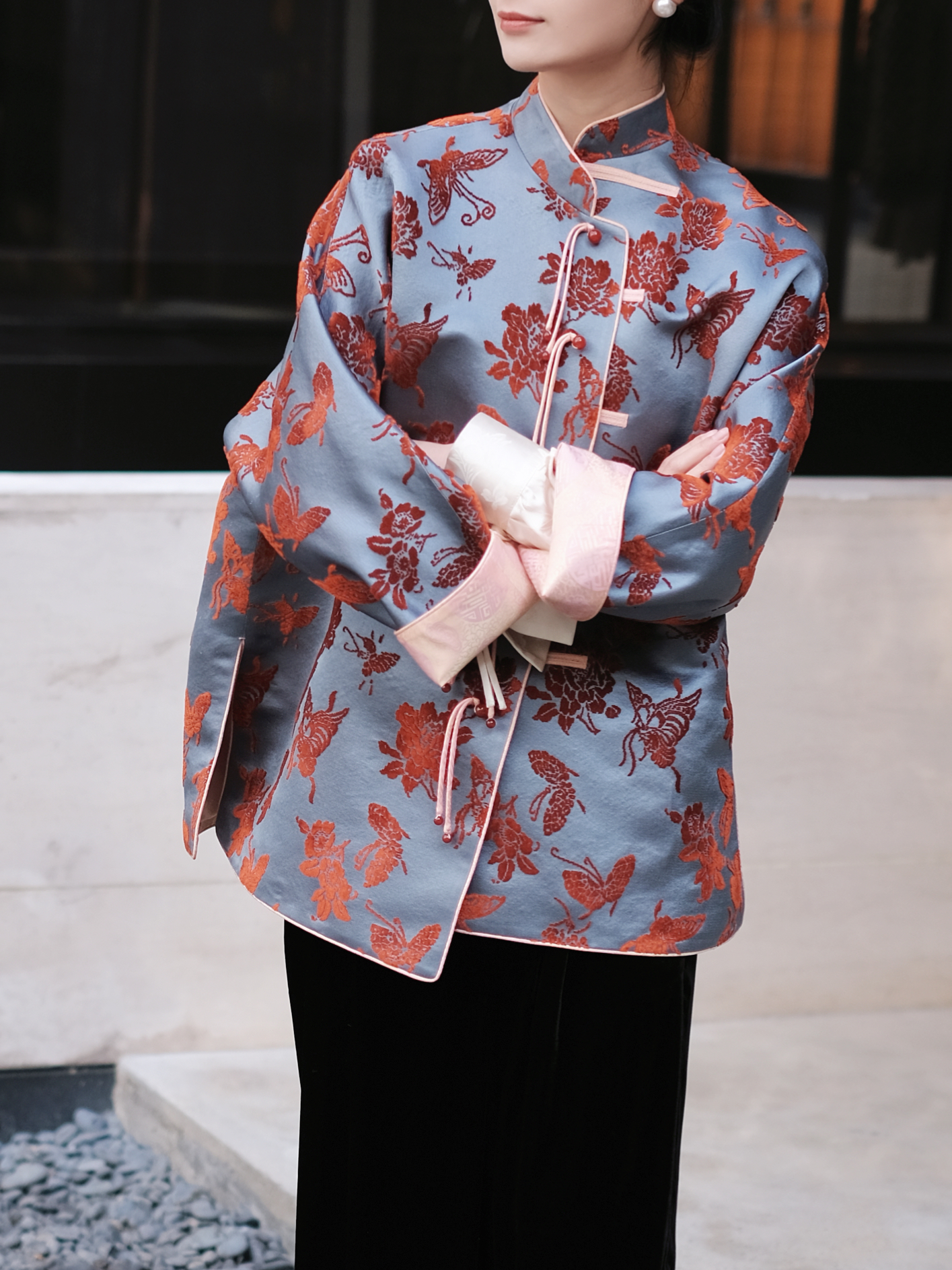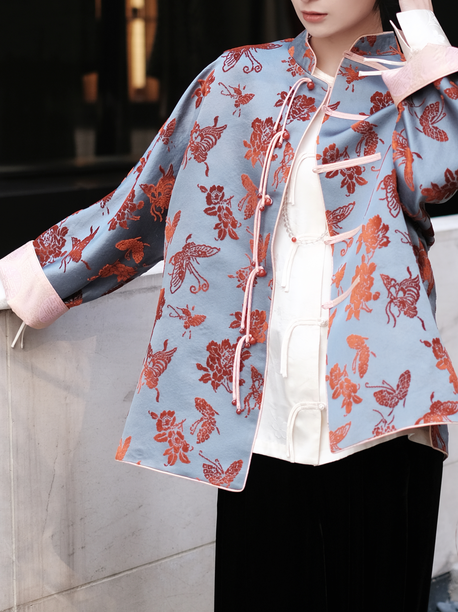 盛唐牡丹 |真丝漳绒立领新中式外套-冰蓝底