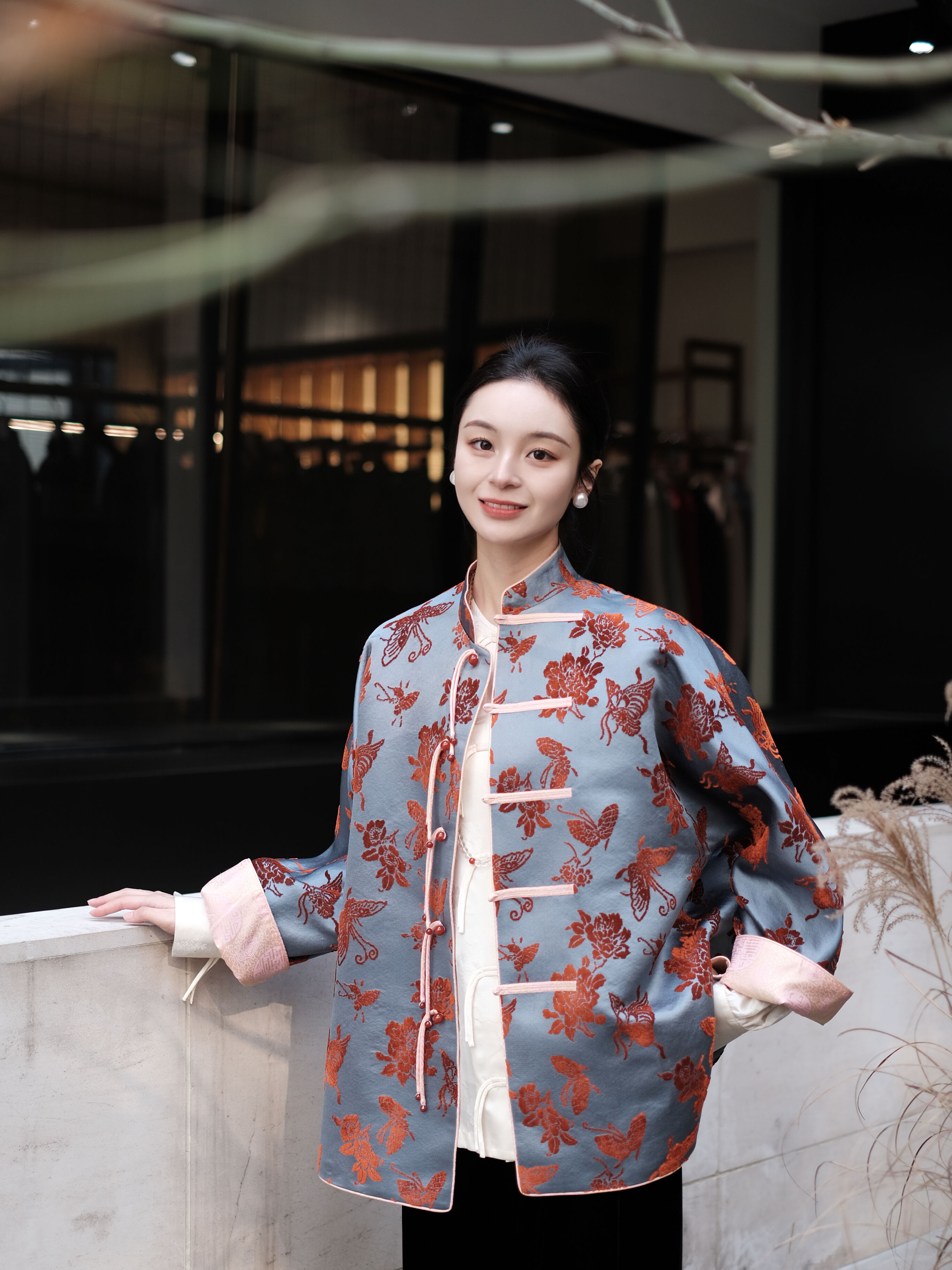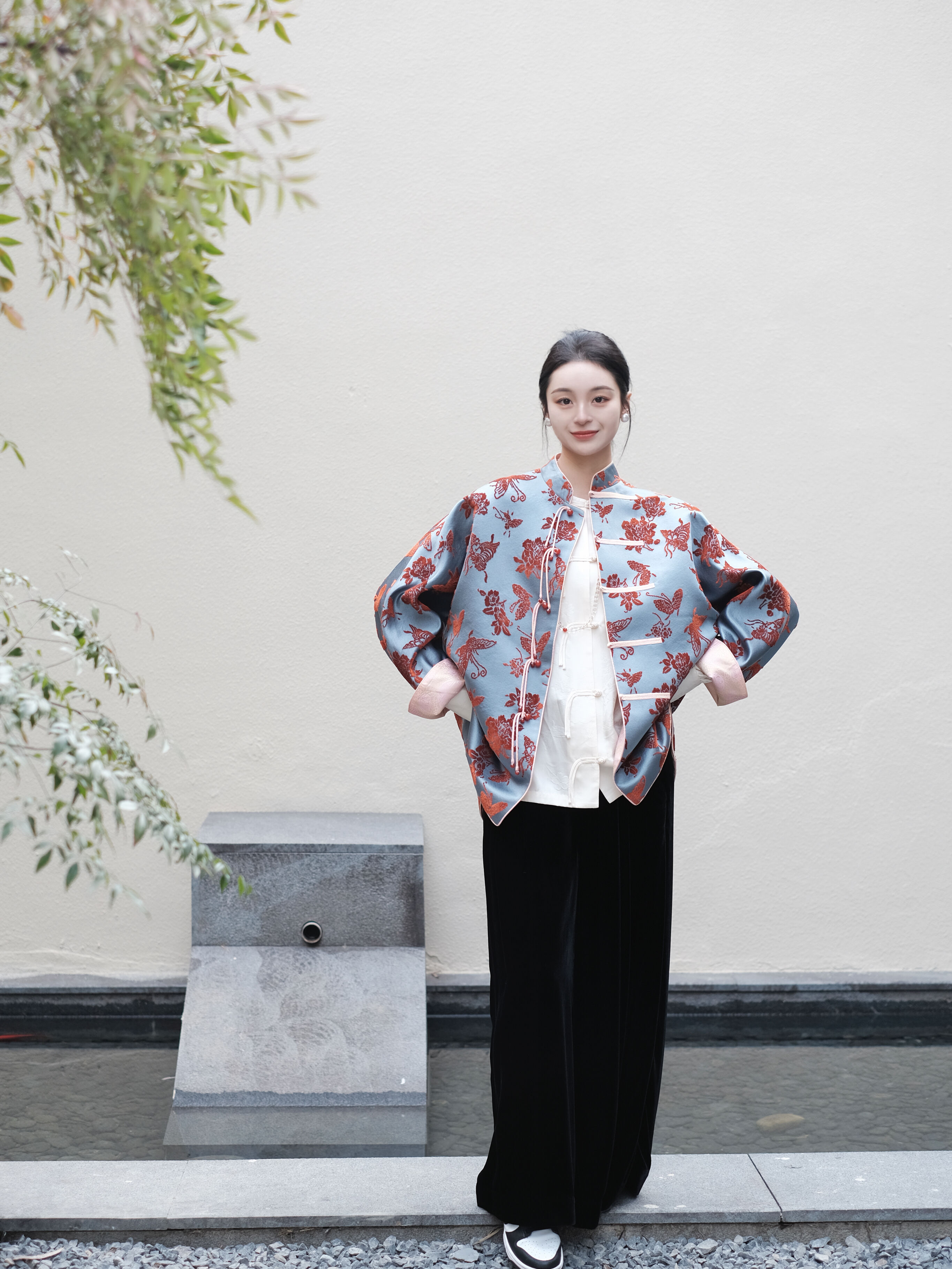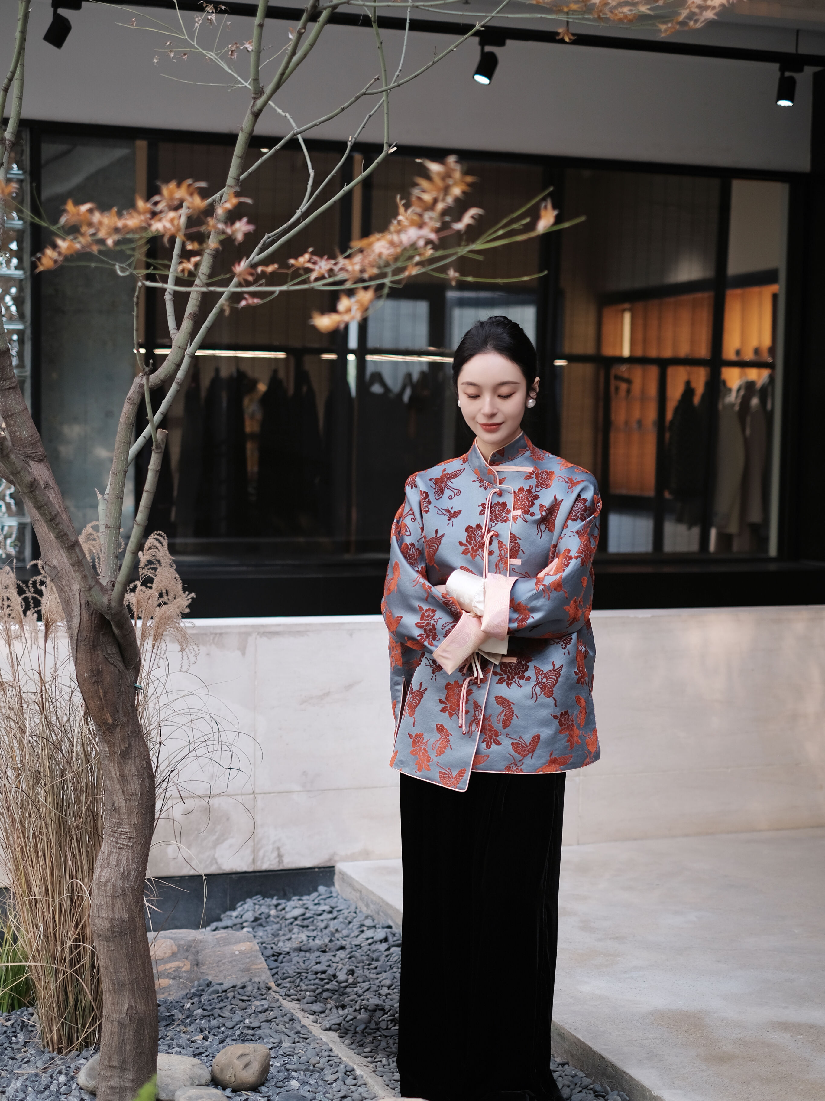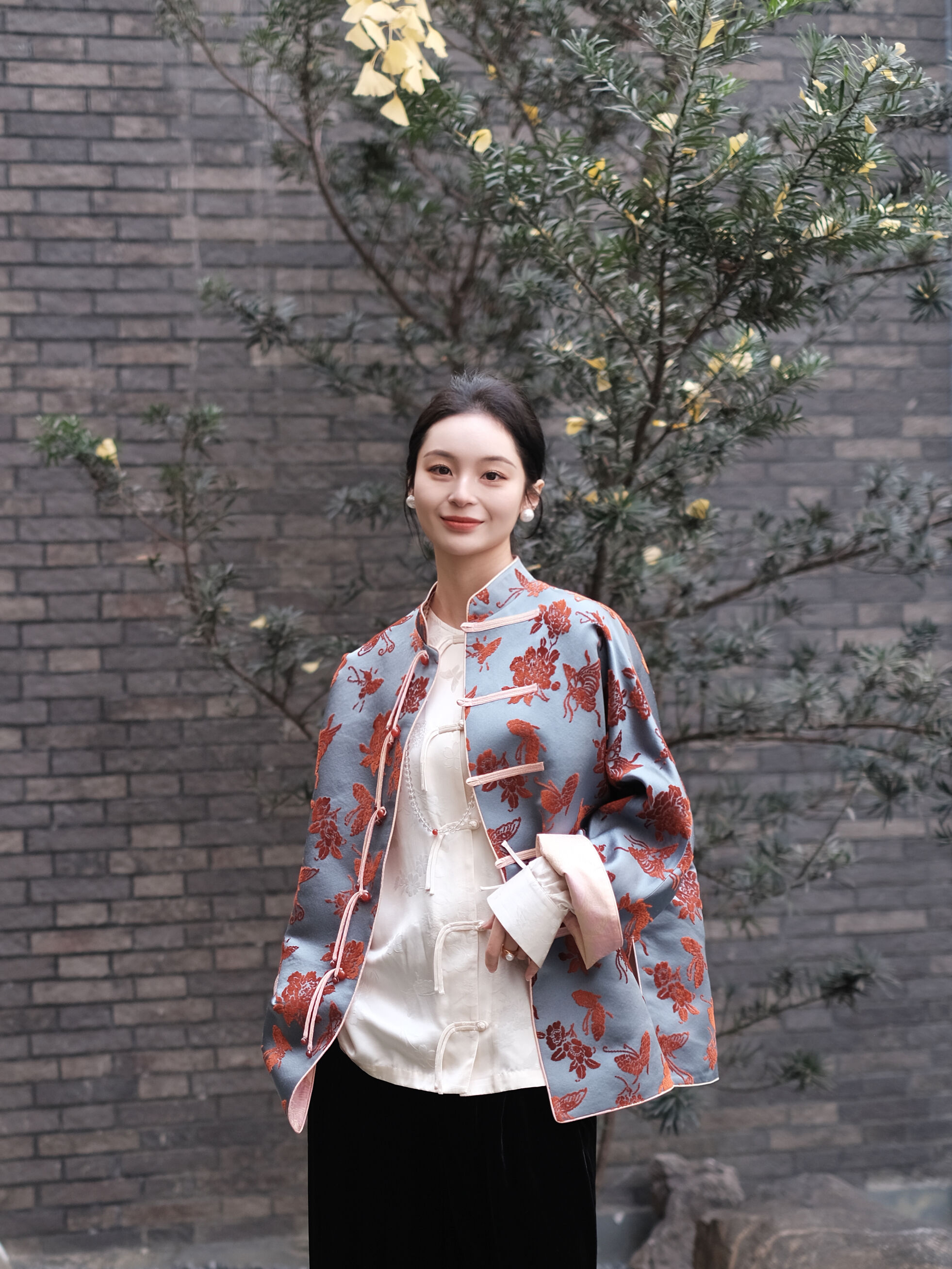 盛唐牡丹 |真丝漳绒立领新中式外套-冰蓝底