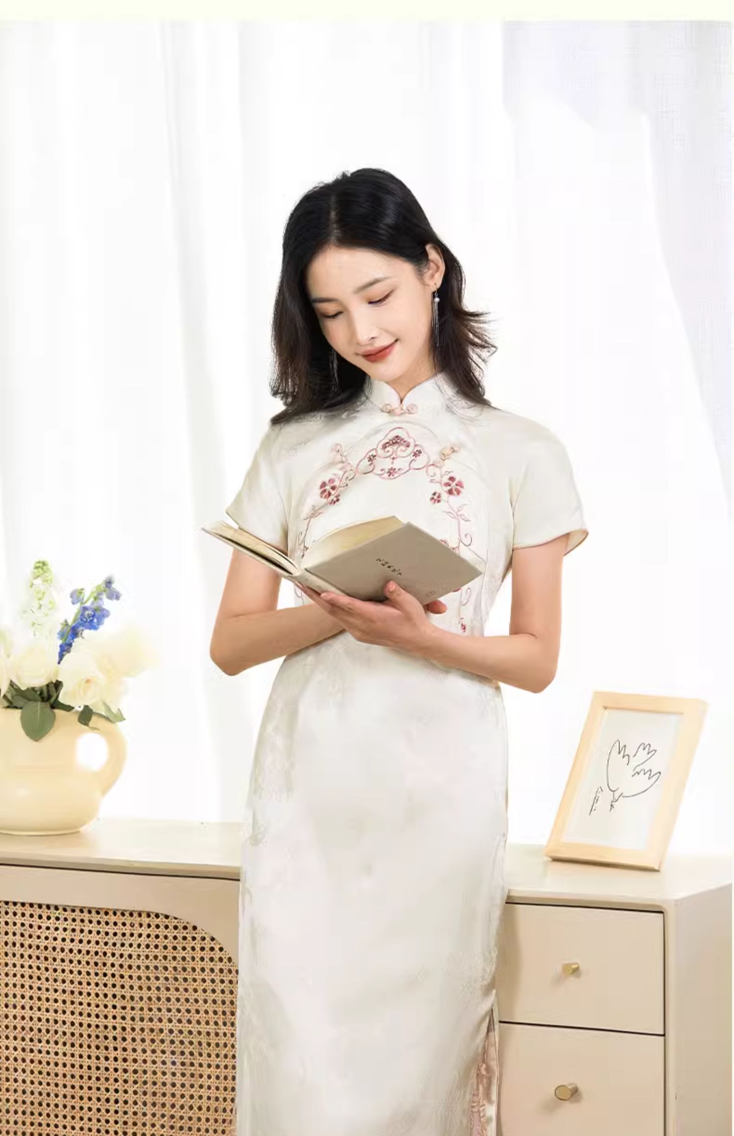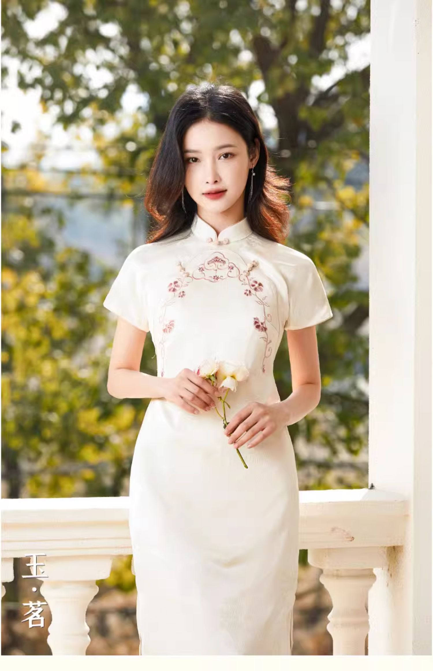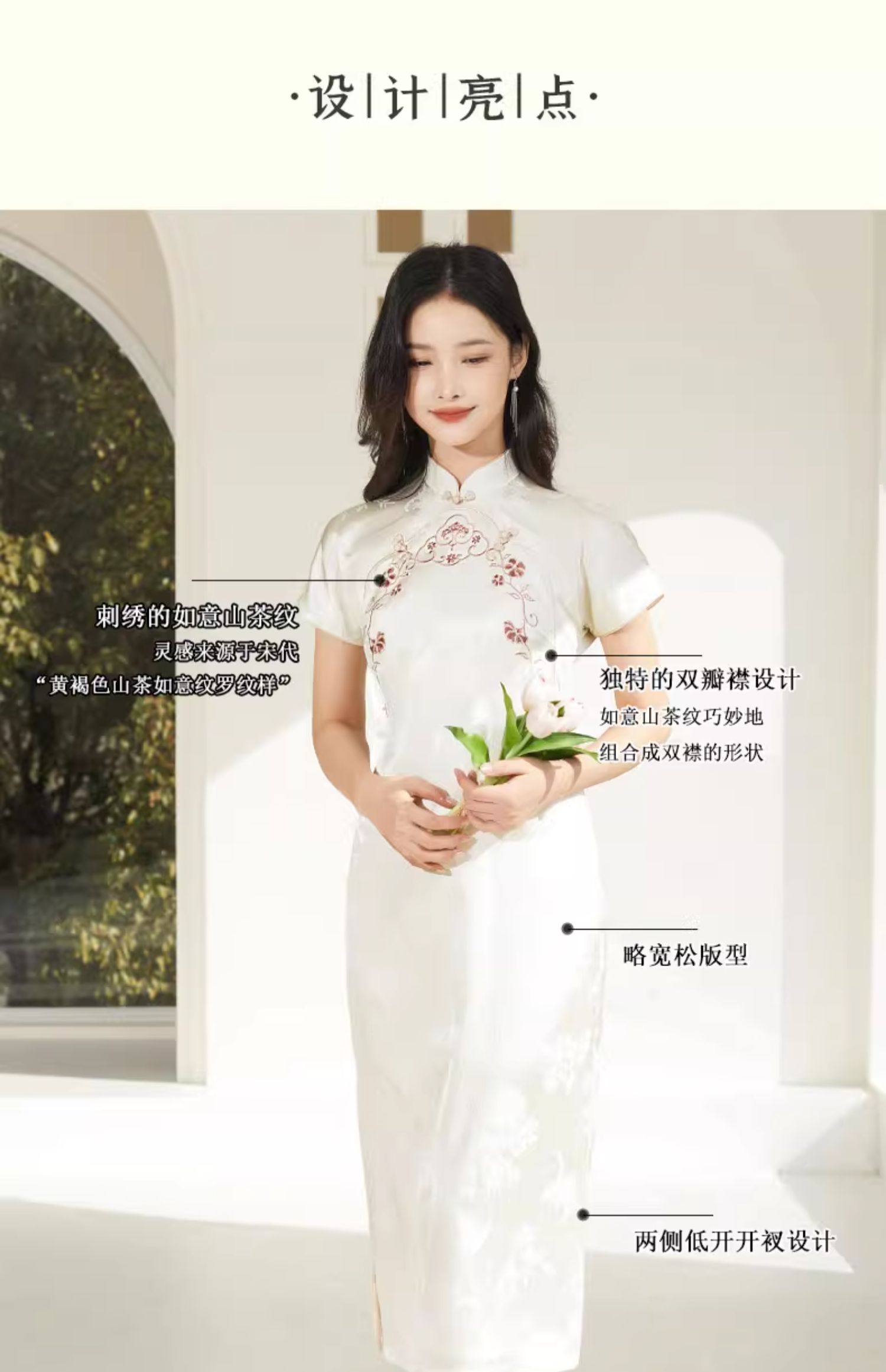 逸红颜玉茗2025夏新款软缎子略宽松显腰身版复古如意纹刺绣旗袍