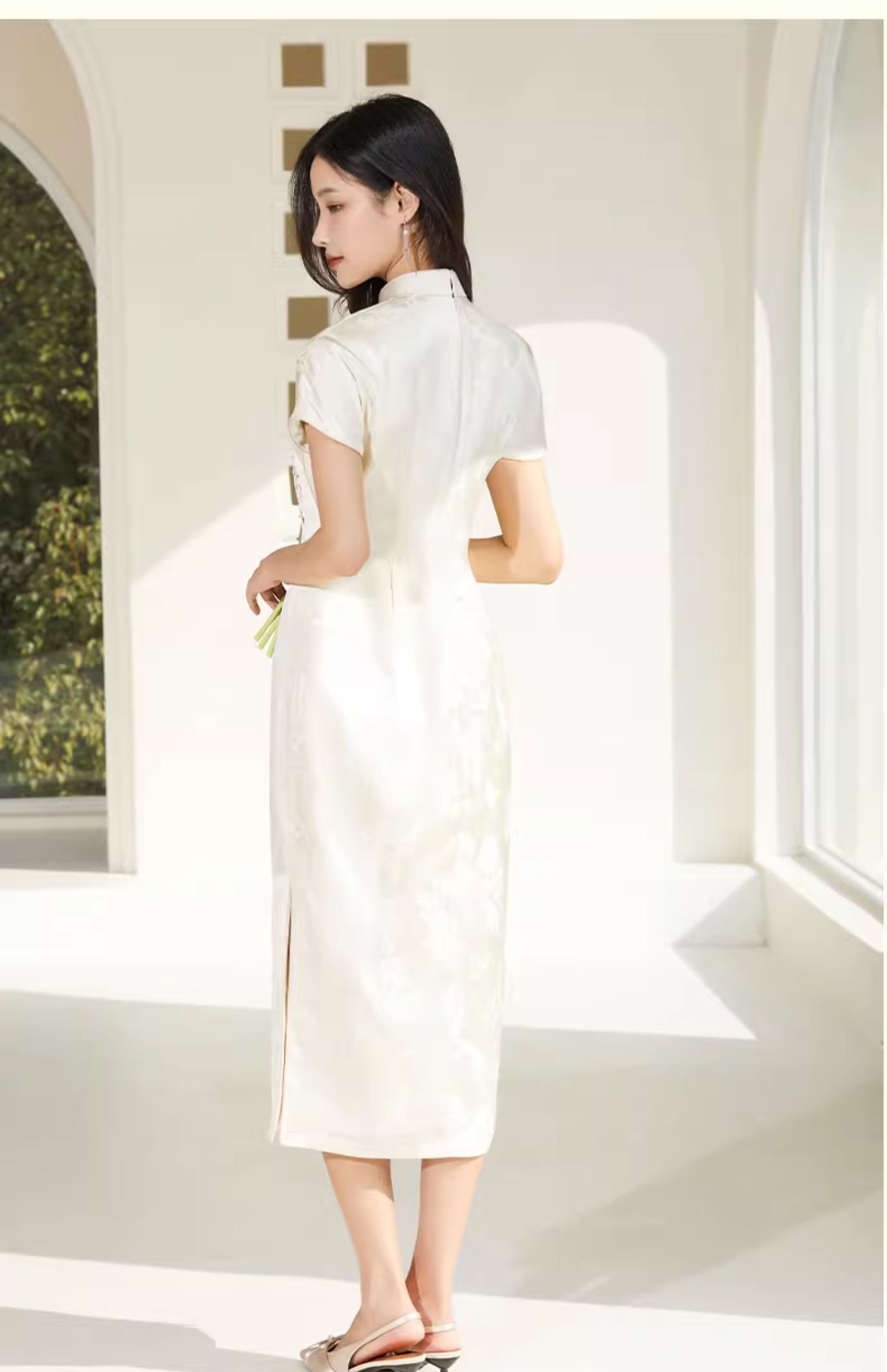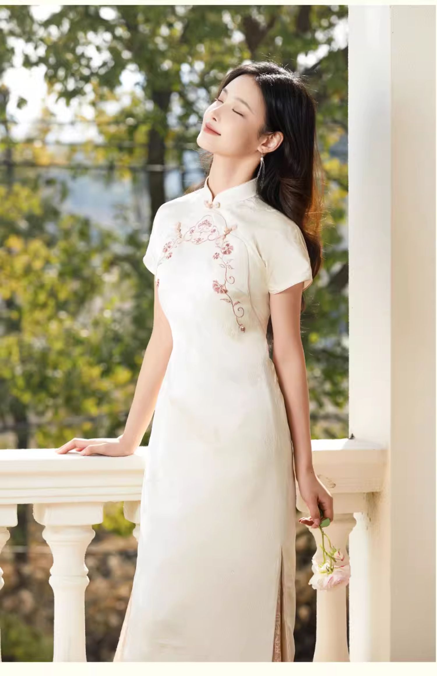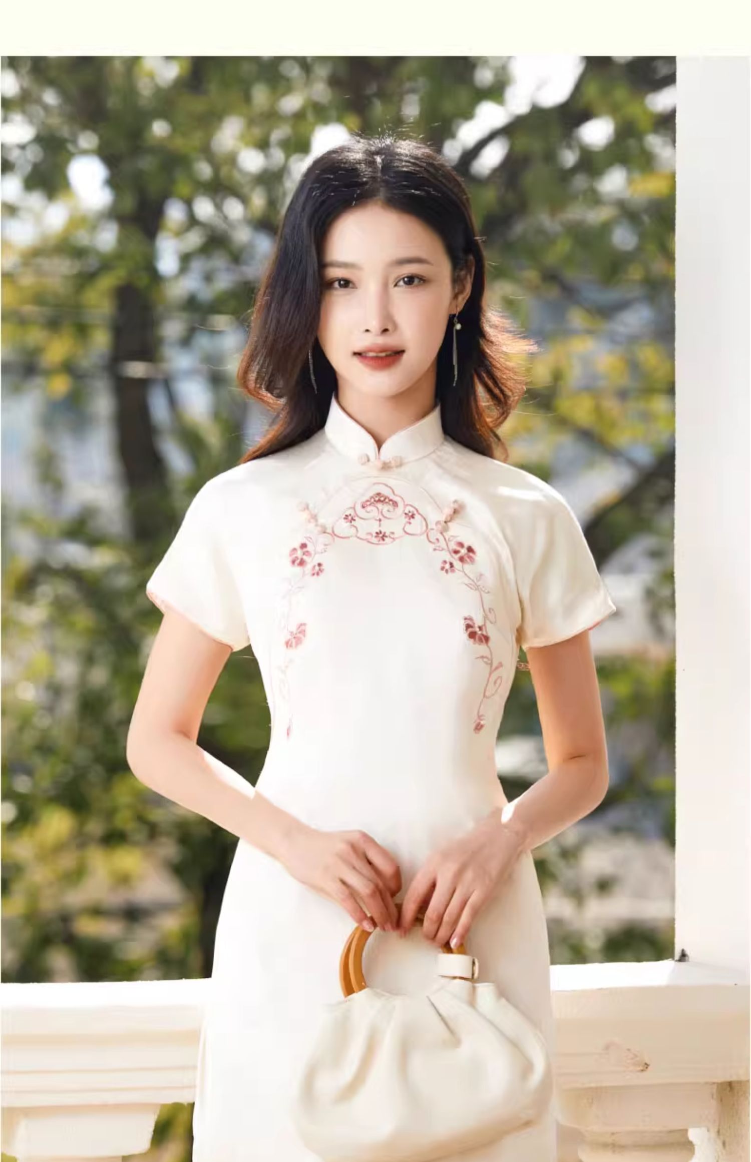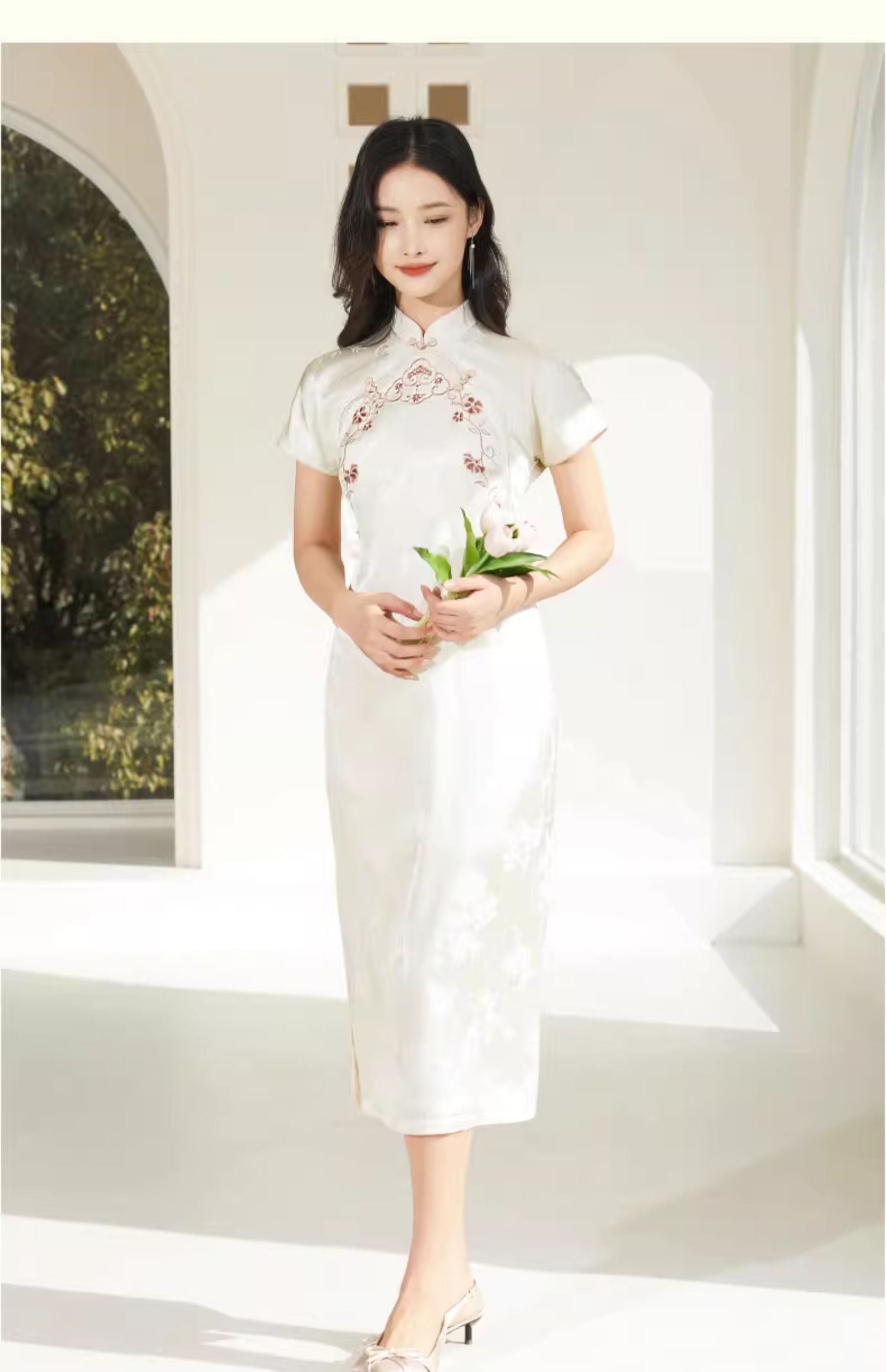 逸红颜玉茗2025夏新款软缎子略宽松显腰身版复古如意纹刺绣旗袍